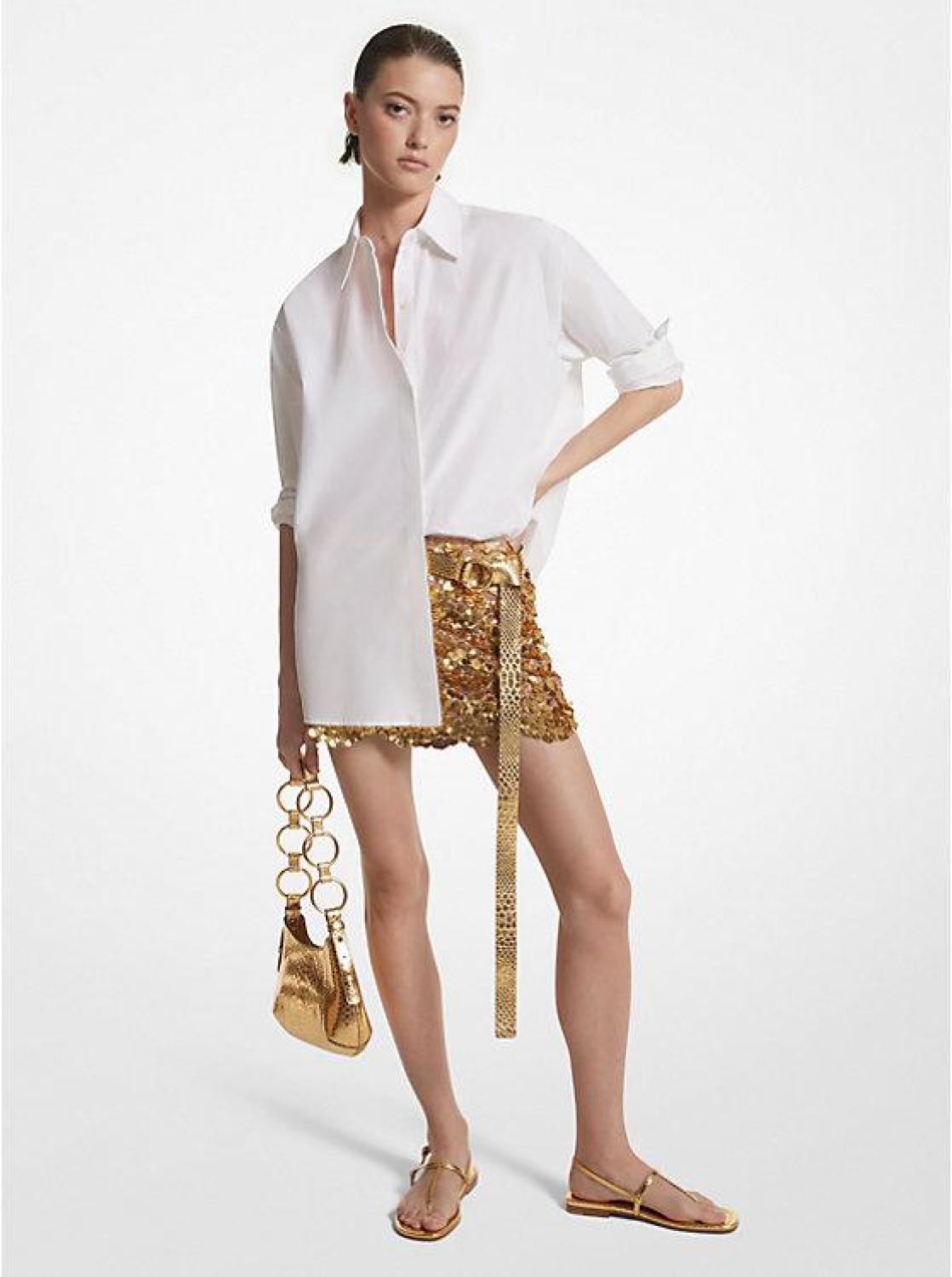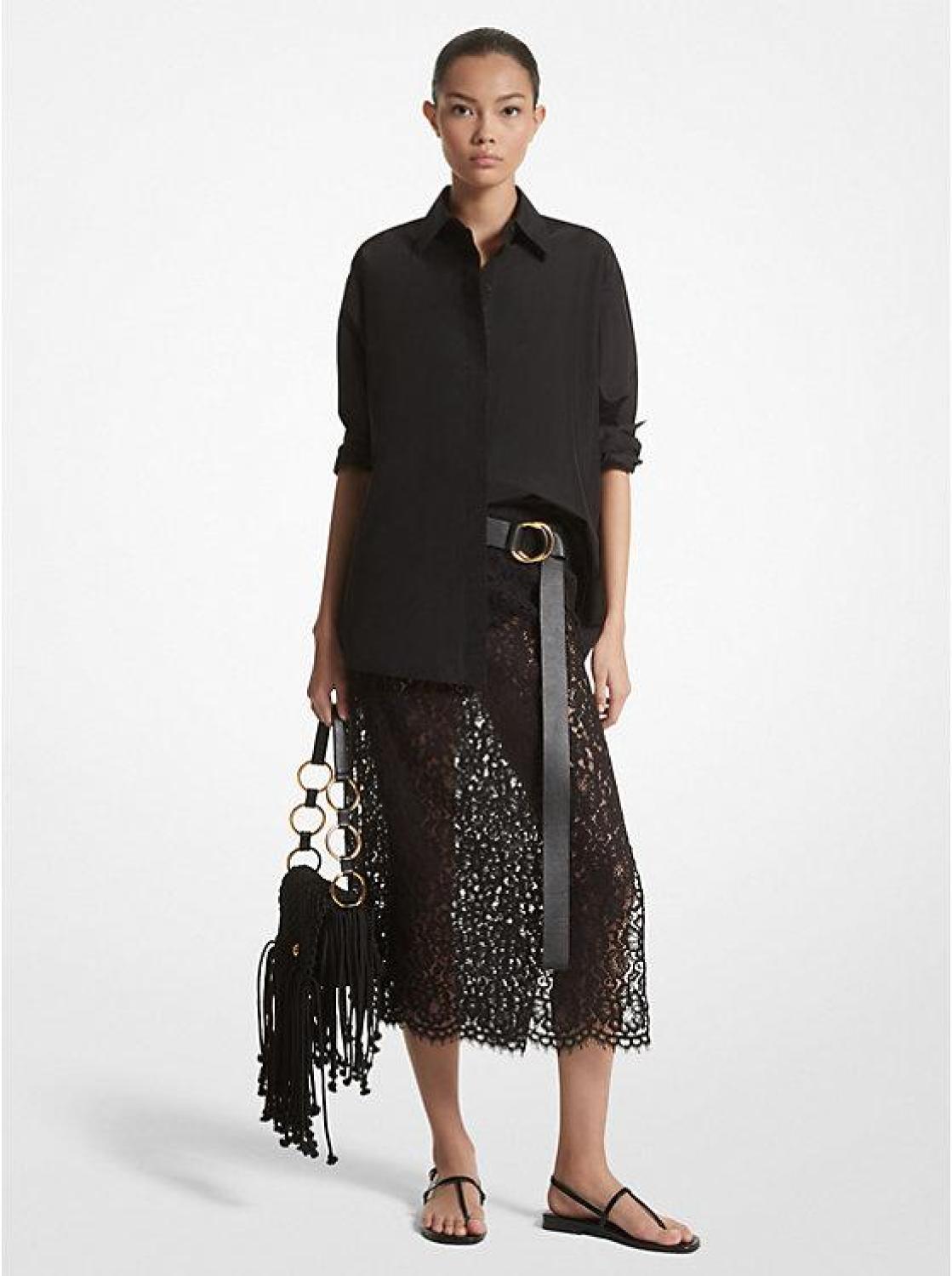 A face-framing point collar and a relaxed fit bring a modern ease to this boyfriend shirt. Silk-cotton taffeta featuring a slight sheen adds a subtle sophistication. Style it with the season’s feminine lace separates to take the look into evening.