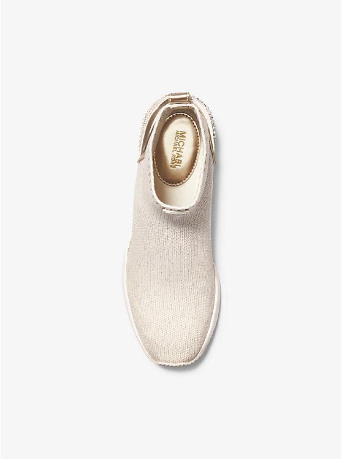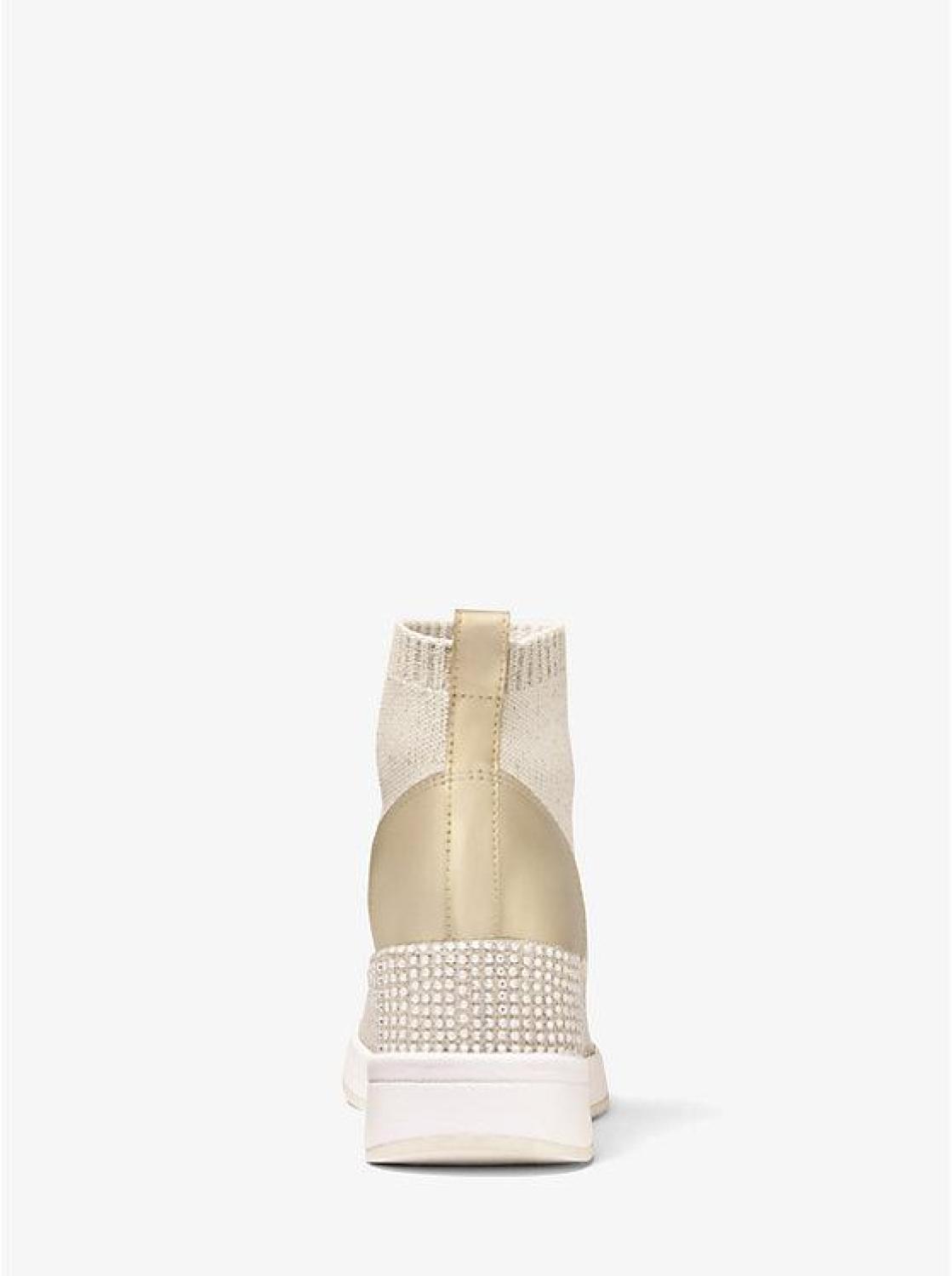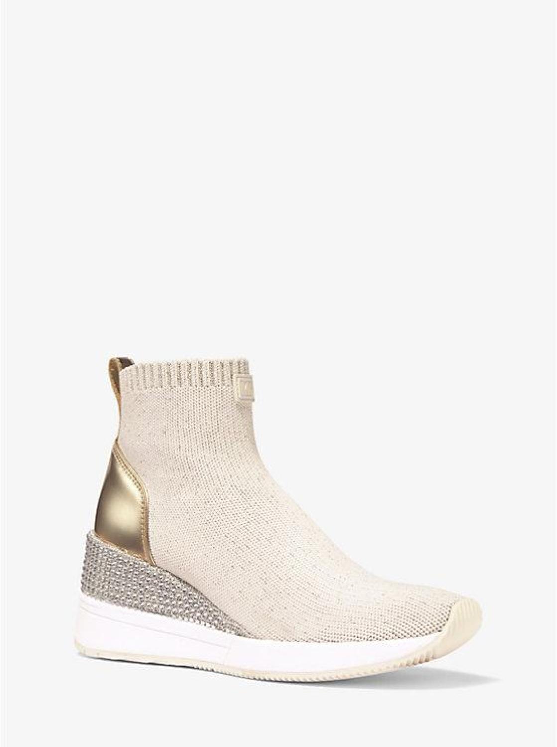 • Our Skyler sock sneakers are renewed in a high-top silhouette crafted from a metallic stretch-knit fabric with a gold-tone leather accent at the heel and crystal embellishments. Comfortable yet refined, this pair is a chic finish to casual looks.