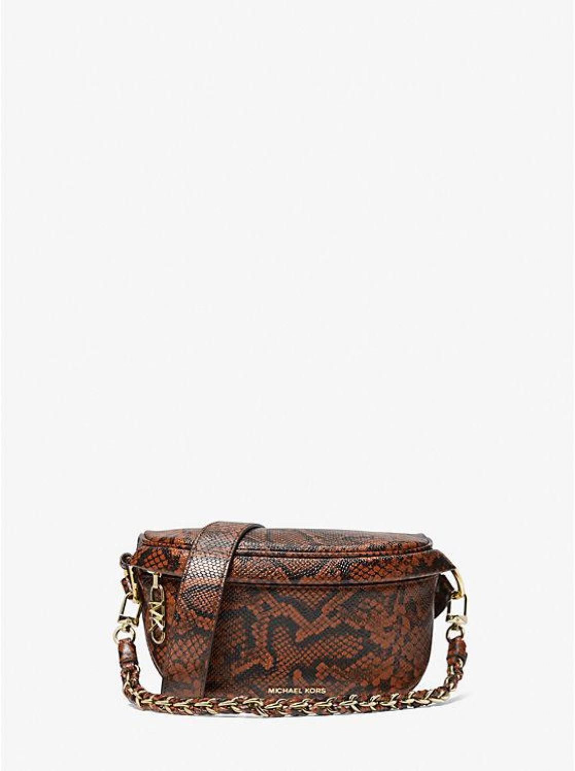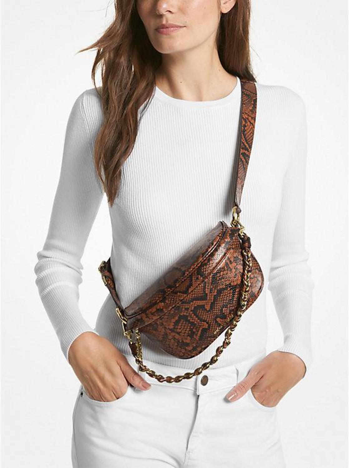 Introducing our beloved Slater sling pack, reimagined in a new and compact silhouette. Featuring the iconic removable braided chain strap, this modern messenger bag is crafted from snake-embossed leather for a refined sensibility. We love how the gilded hardware accents add understated polish.