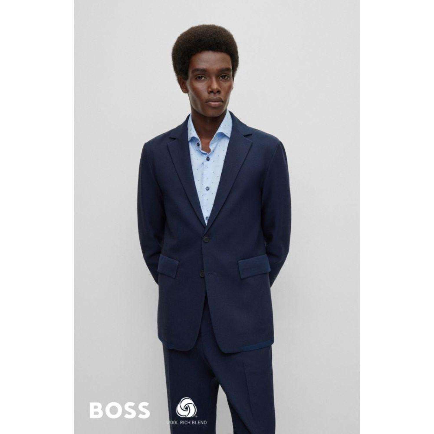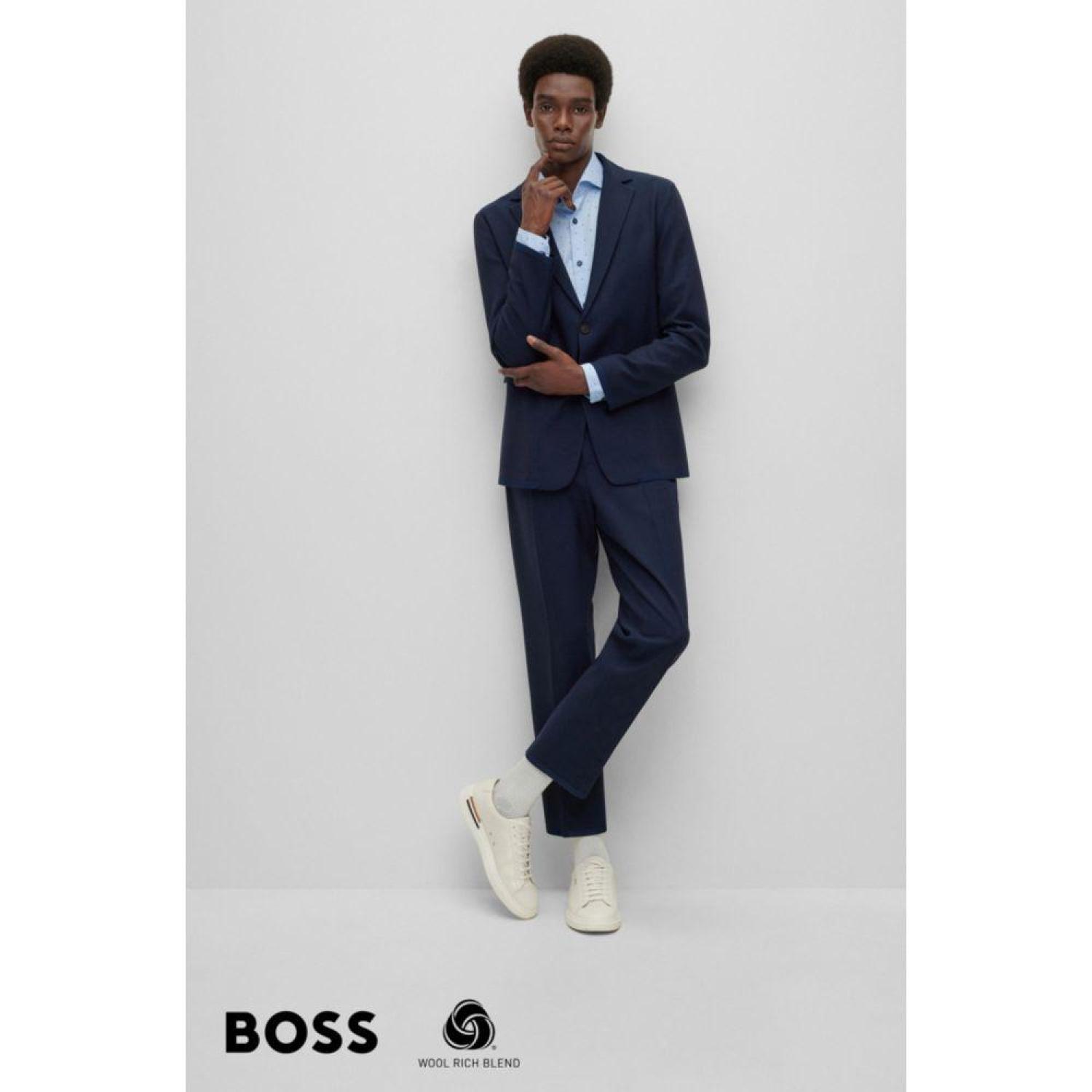 • A modern suit by BOSS Menswear. Featuring a solid weave for versatile styling, this two-piece suit is tailored to a defined fit in a wool blend with performance-stretch qualities. A protective dust bag is supplied for storage and transportation.