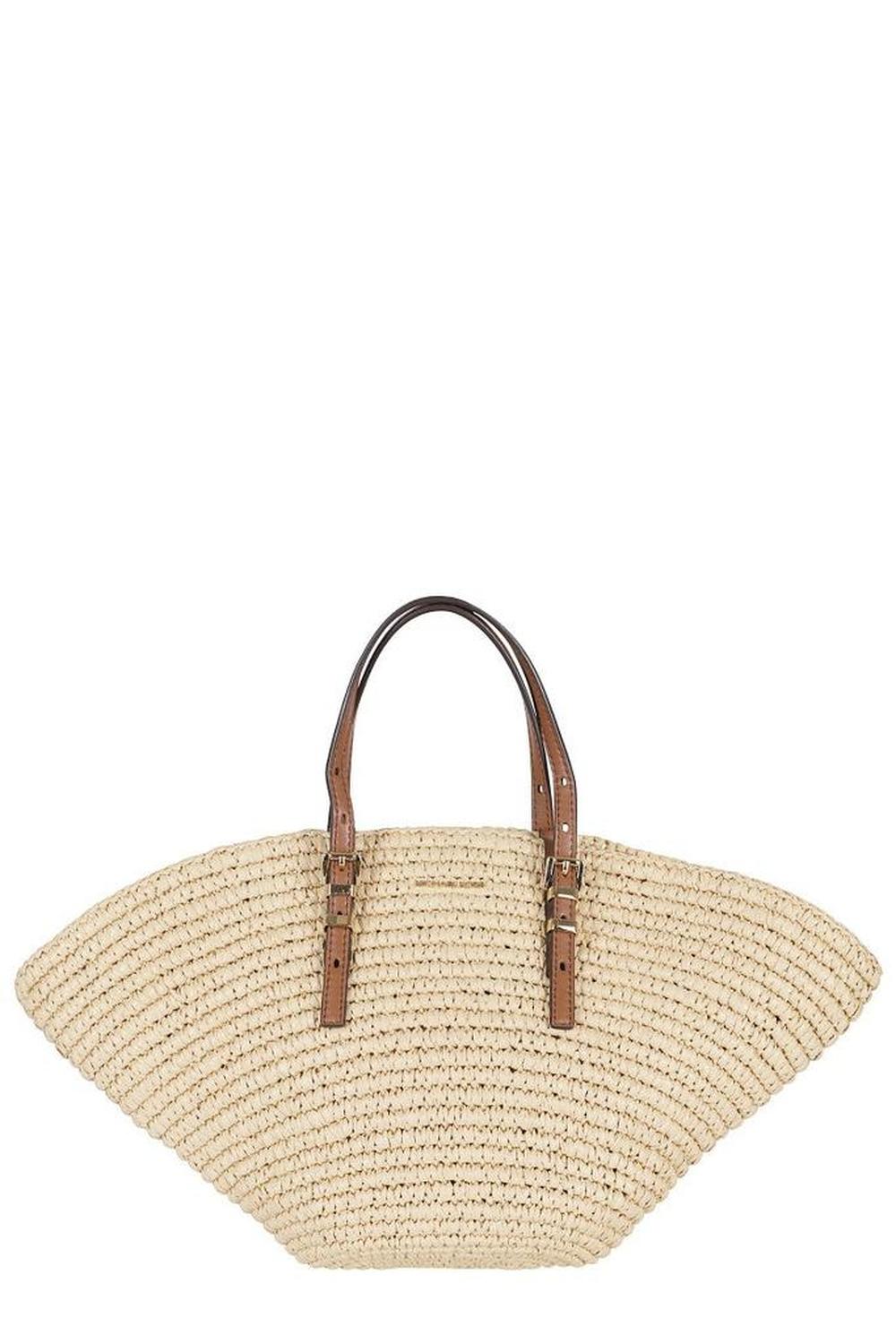 • An innovative fan-shaped tote made from 100% natural raffia, showcasing the art of weaving with a textured exterior. Two robust leather handles Durable and sophisticated Perfect for beach outings Ideal for summer escapades