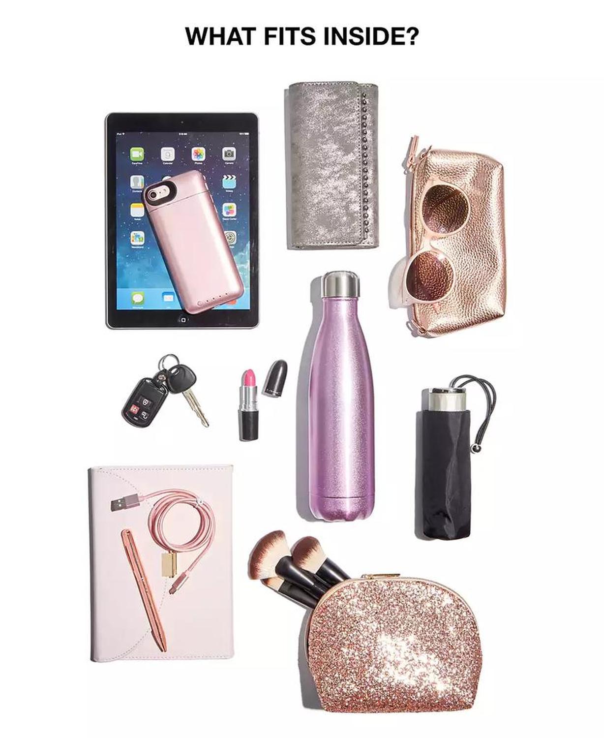 Gold-tone exterior hardware; interior zip pocket & slip pocket