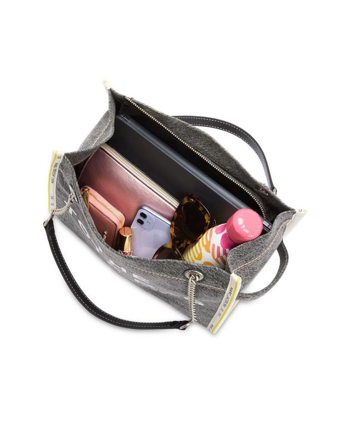 Chain and leather handles, 10.63"L drop Dimensions: 12.99"L x 10.24"H x 5.91"D Zippered closure One interior zip pocket & card slot Logo at front & back Mannequin model measurements: 5'10" height, wearing a size 4 or small 100% cotton; lining: 100% polyester; trim/strap: leather Imported Web ID: 5232881