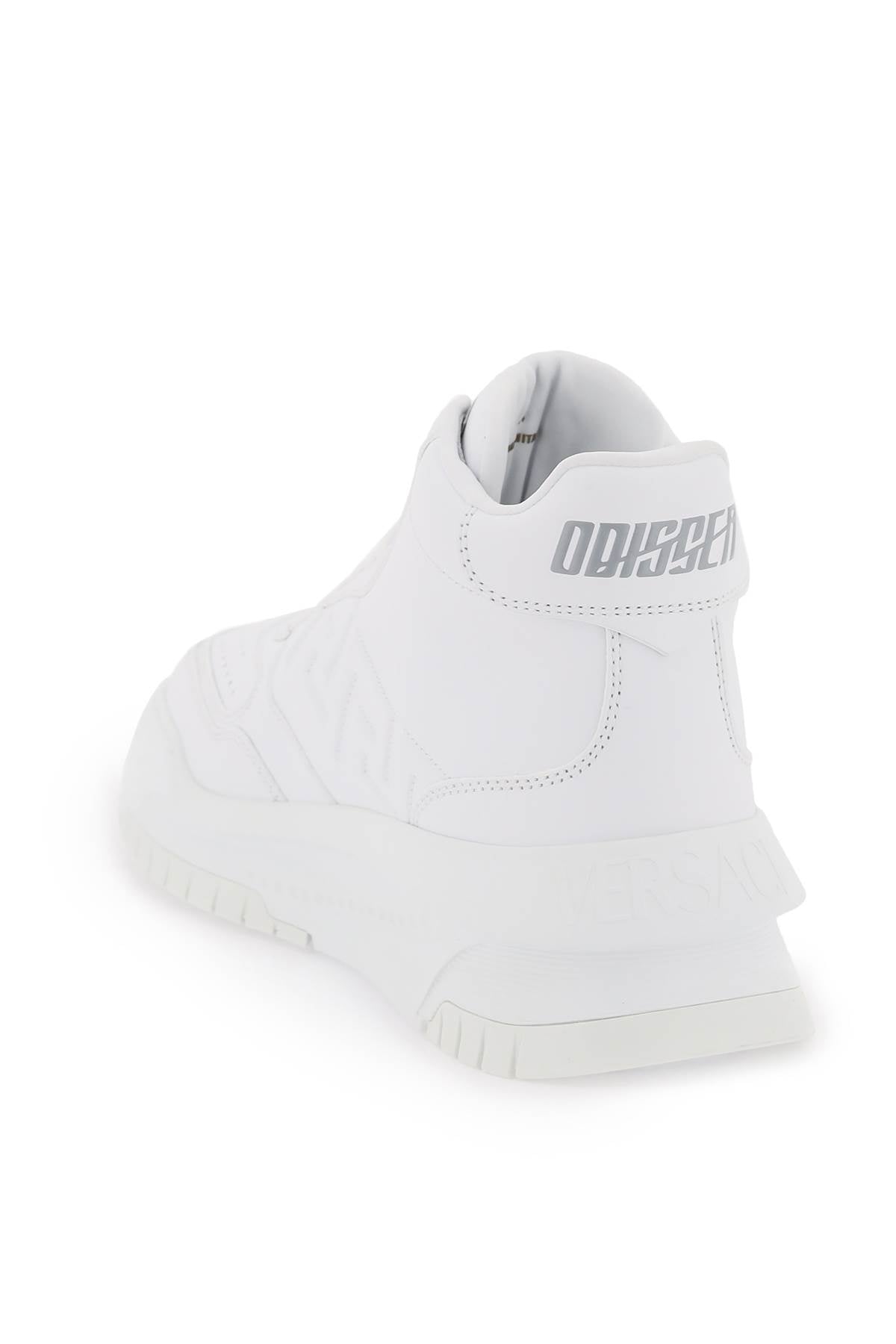 • Versace Odissea sneakers crafted in smooth leather enriched by the signature tone-on-tone embossed Greca motif. Logo label on the tongue, front lace-up closure and perforations on the toe. Lettering print on the heel tab and rear embossed logo. Fabric interior with removable leather insole and rubber sole. Heel Height = 6 cm