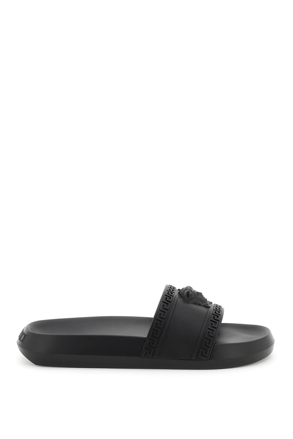 Palazzo slides by Versace entirely crafted in rubber with embossed Greca motif and iconic three-dimensional Medusa head on the band. Embossed lettering logo on the back. Moulded footbed. Heel Height = 3 cm