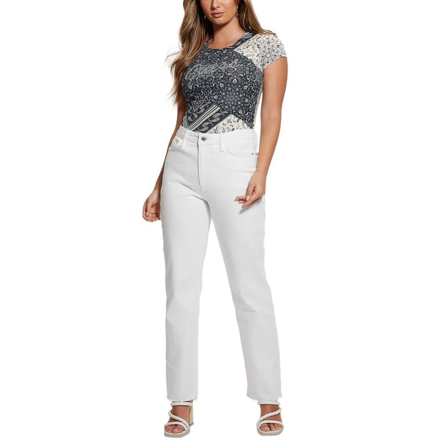 Make a style statement when you wear the GUESS Women's Bandana-Print T-Shirt.