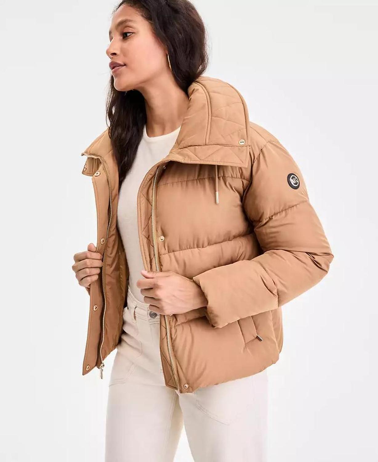 Fashion that's functional, this cozy puffer coat from MICHAEL Michael Kors features a drawstring collar and handy zip pockets. Approx. model height is 5'7" and she is wearing a size M Approx. length: 24" Stand collar with drawstring; front zip closure with button overlay Two welt zip pockets at waist Water resistant Lined Shell & fill: 100% polyester; lining: 100% nylon; fill power: 280 Machine wash Imported