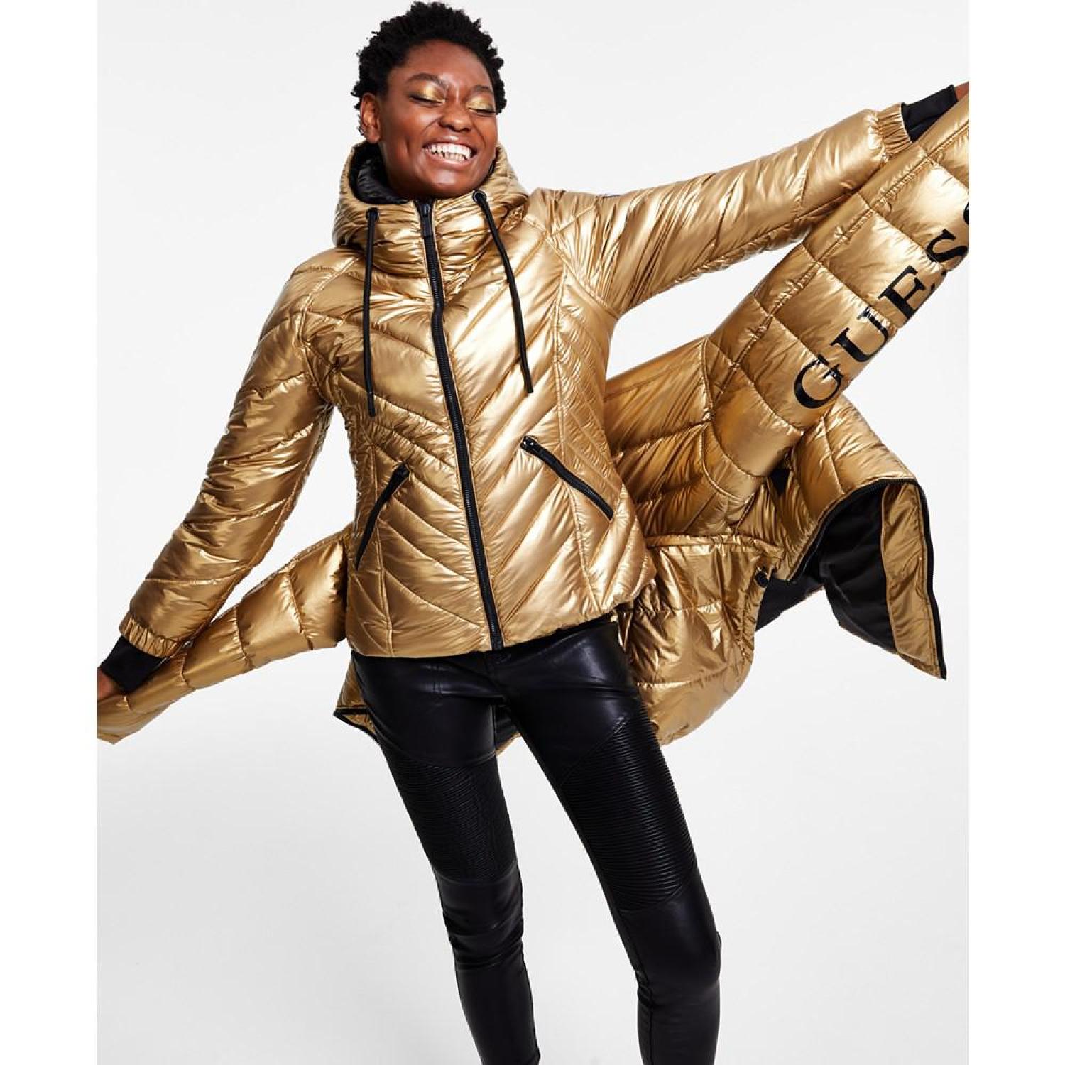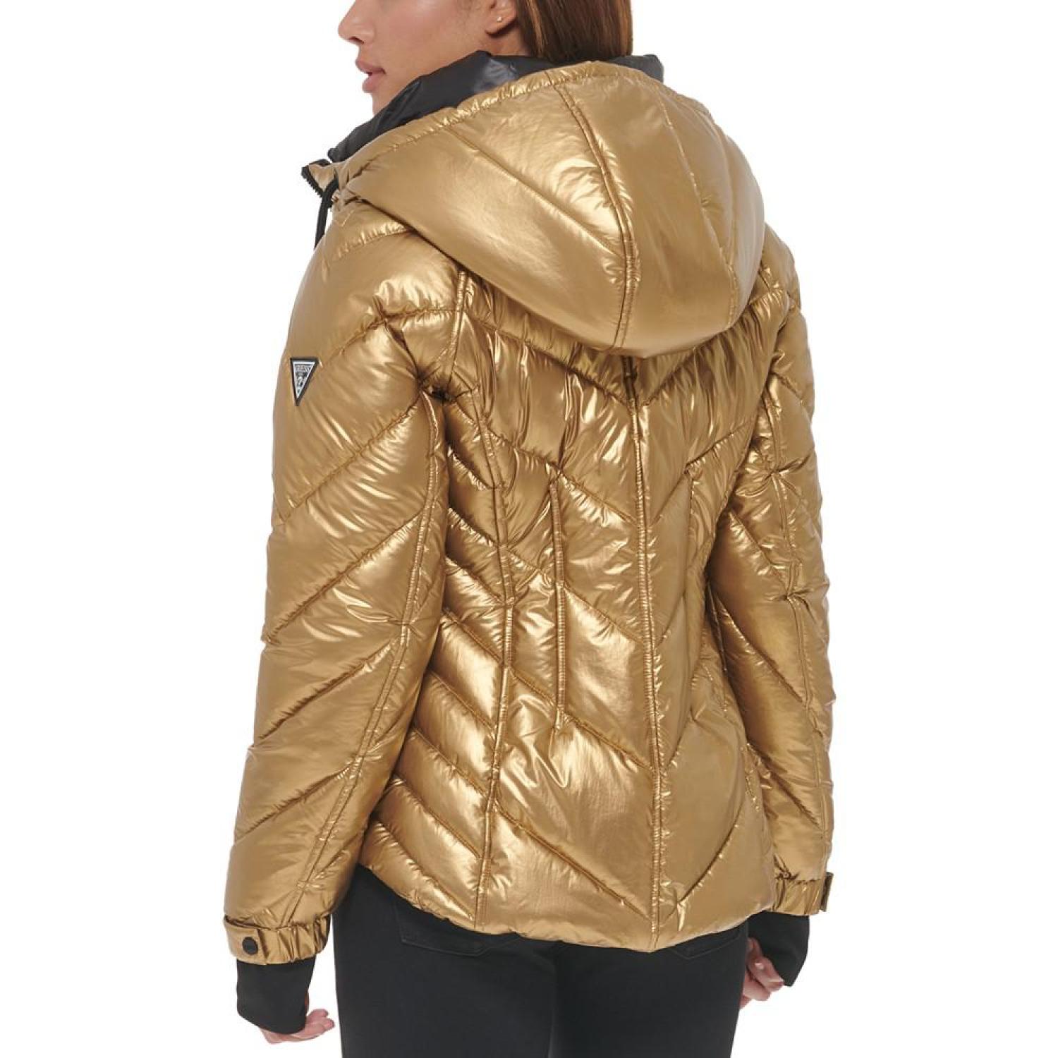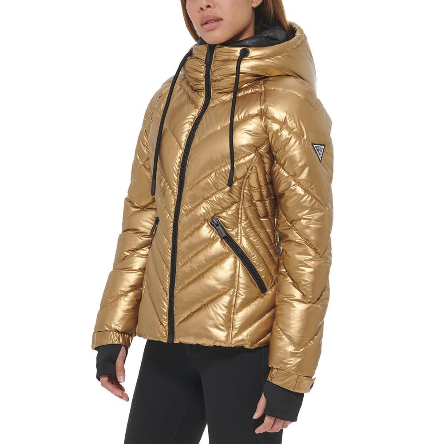 • A shimmery gold-tone metallic finish lends a playful vibe to this hooded puffer coat from GUESS.