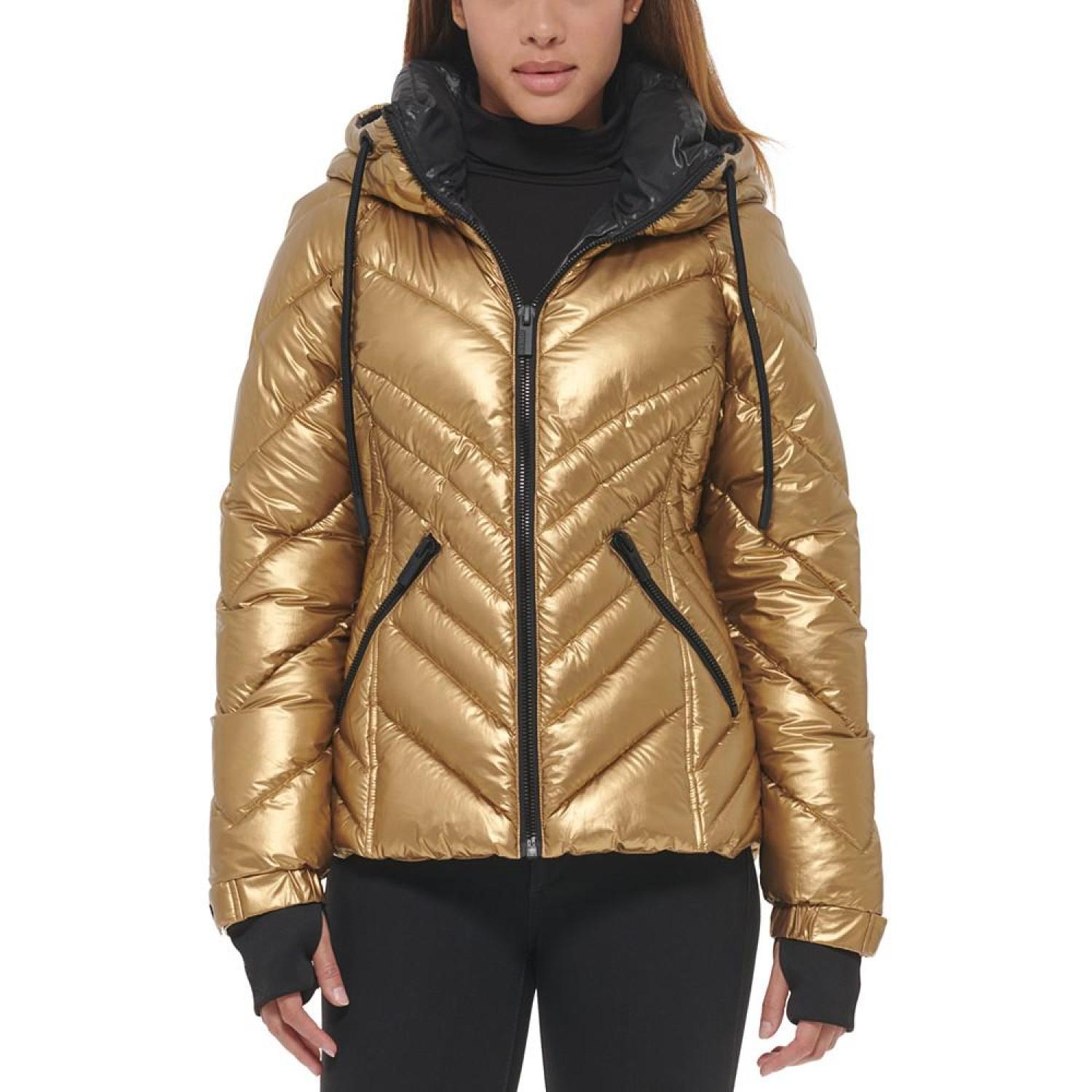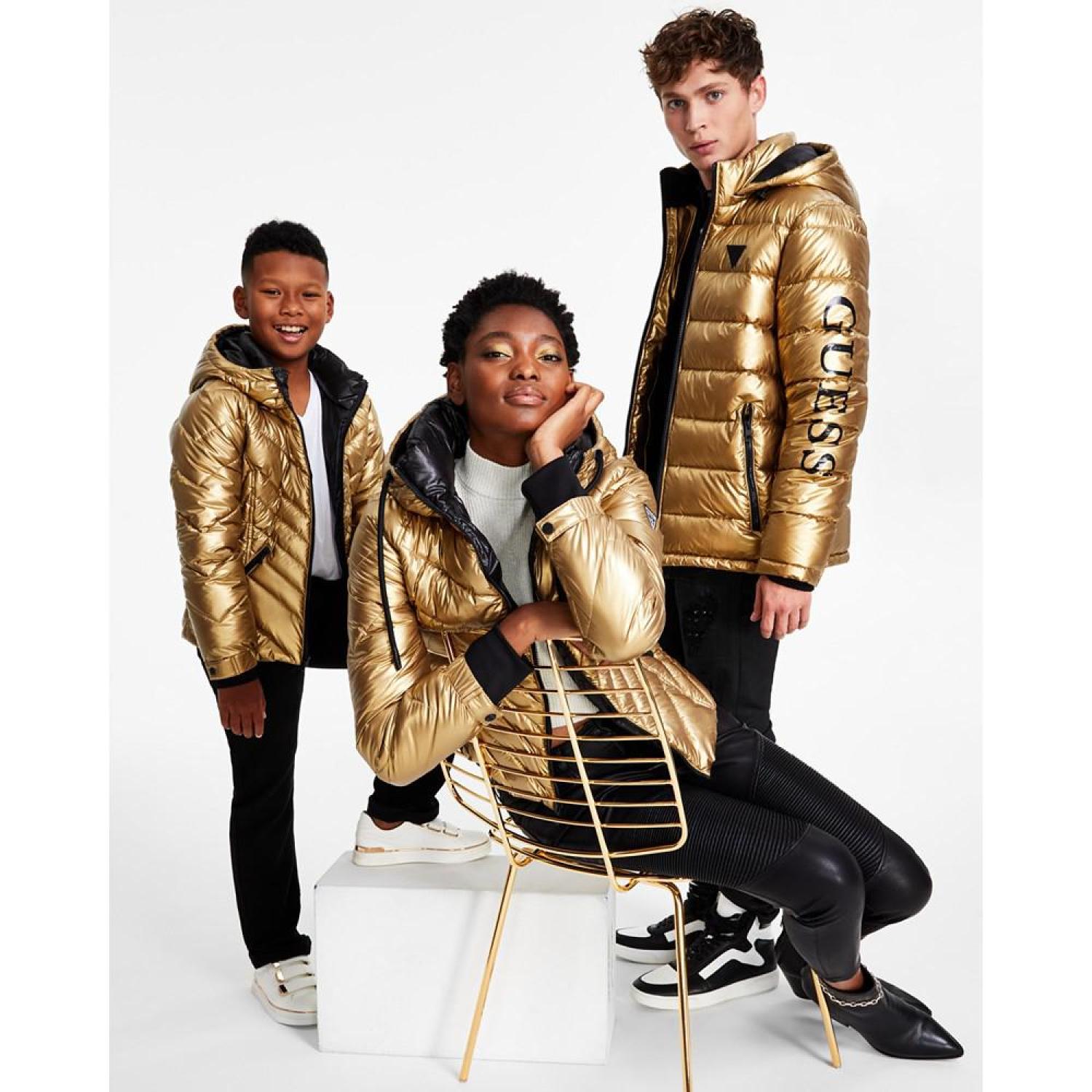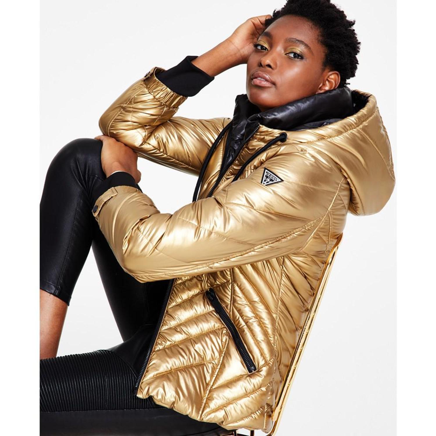 • A shimmery gold-tone metallic finish lends a playful vibe to this hooded puffer coat from GUESS.