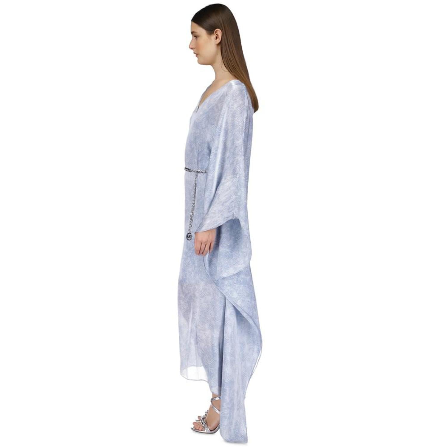 Flowy poncho sleeves and a handkerchief hem lend elegant movement to this MICHAEL Michael Kors dress, in a soft tonal print perfectly contrasted with a signature chain belt.