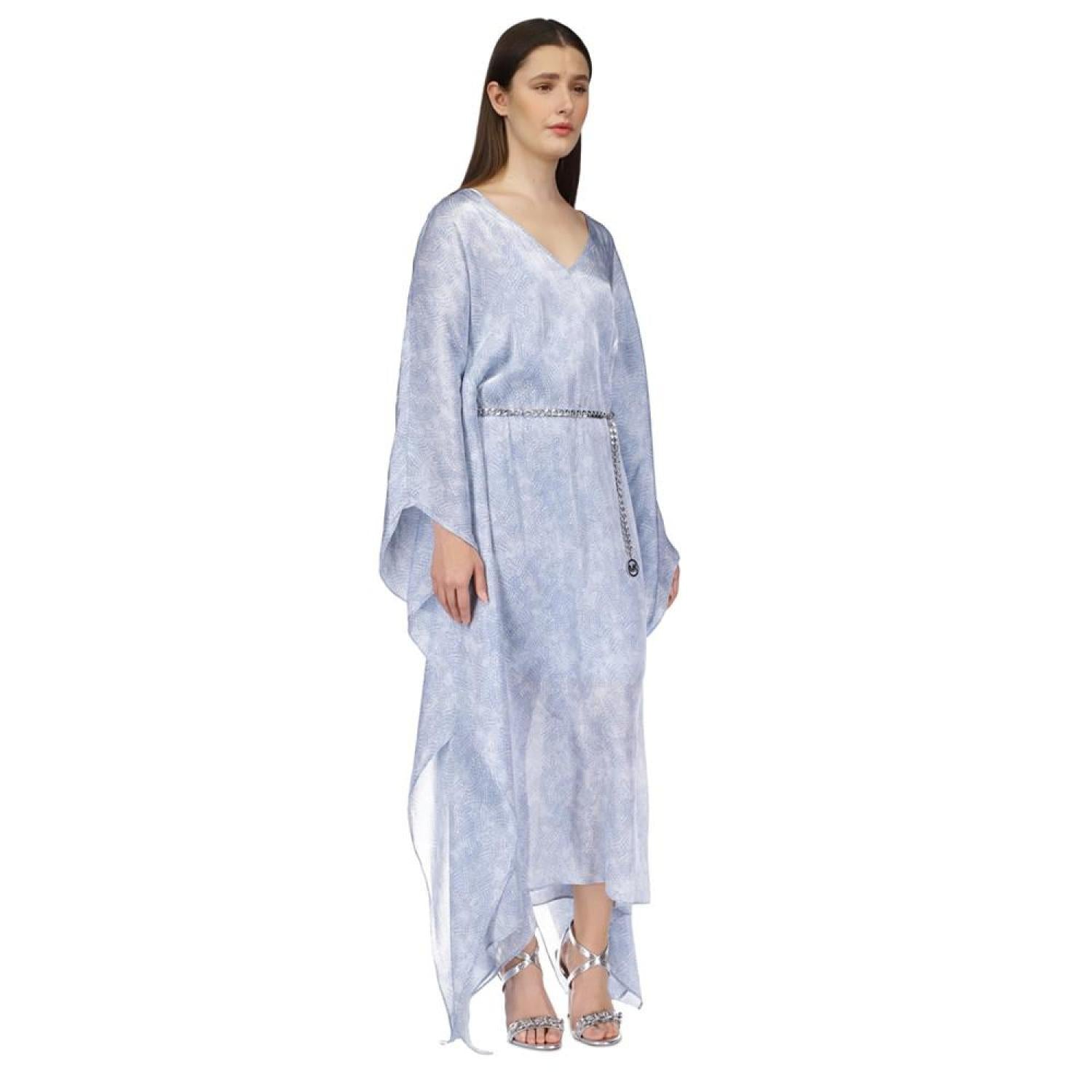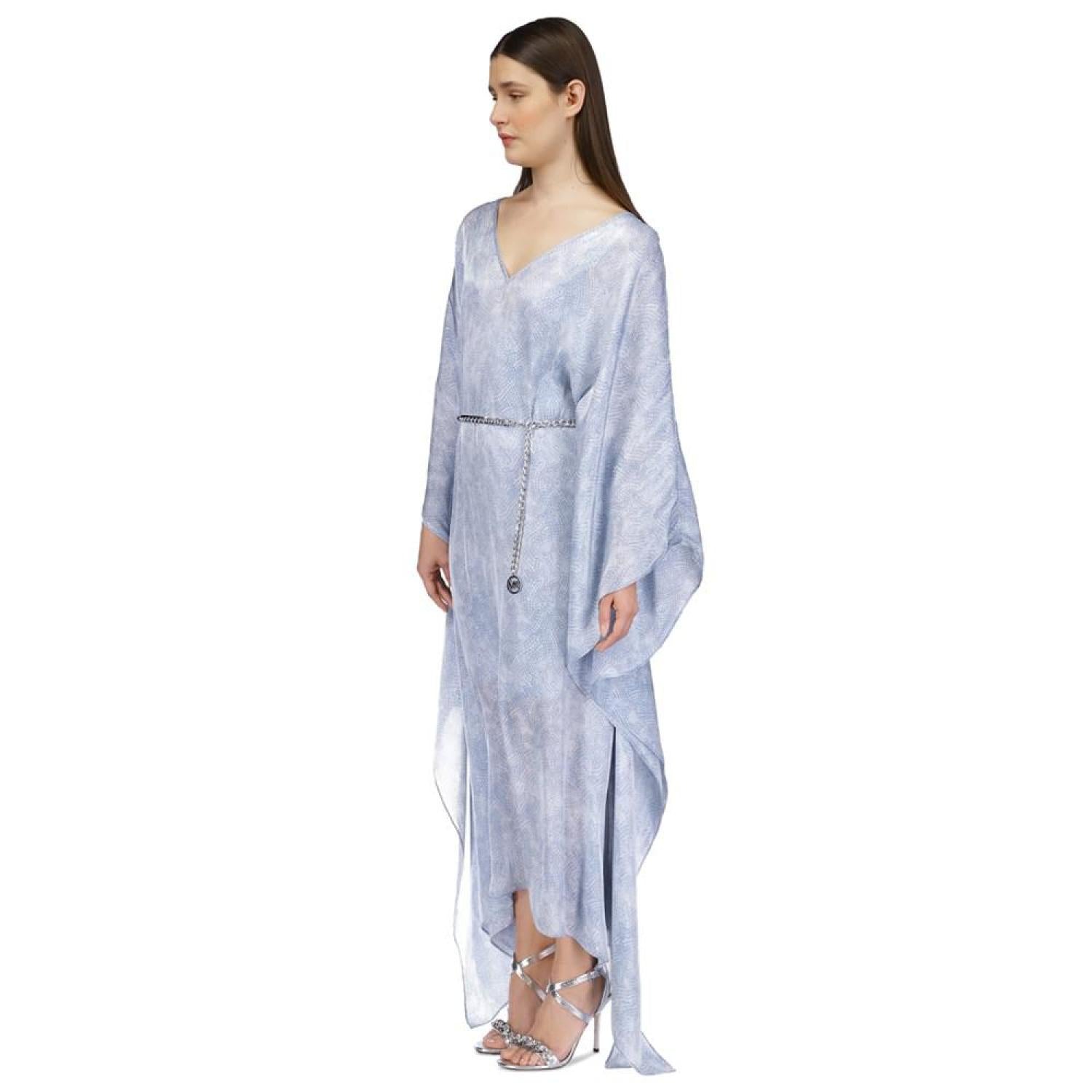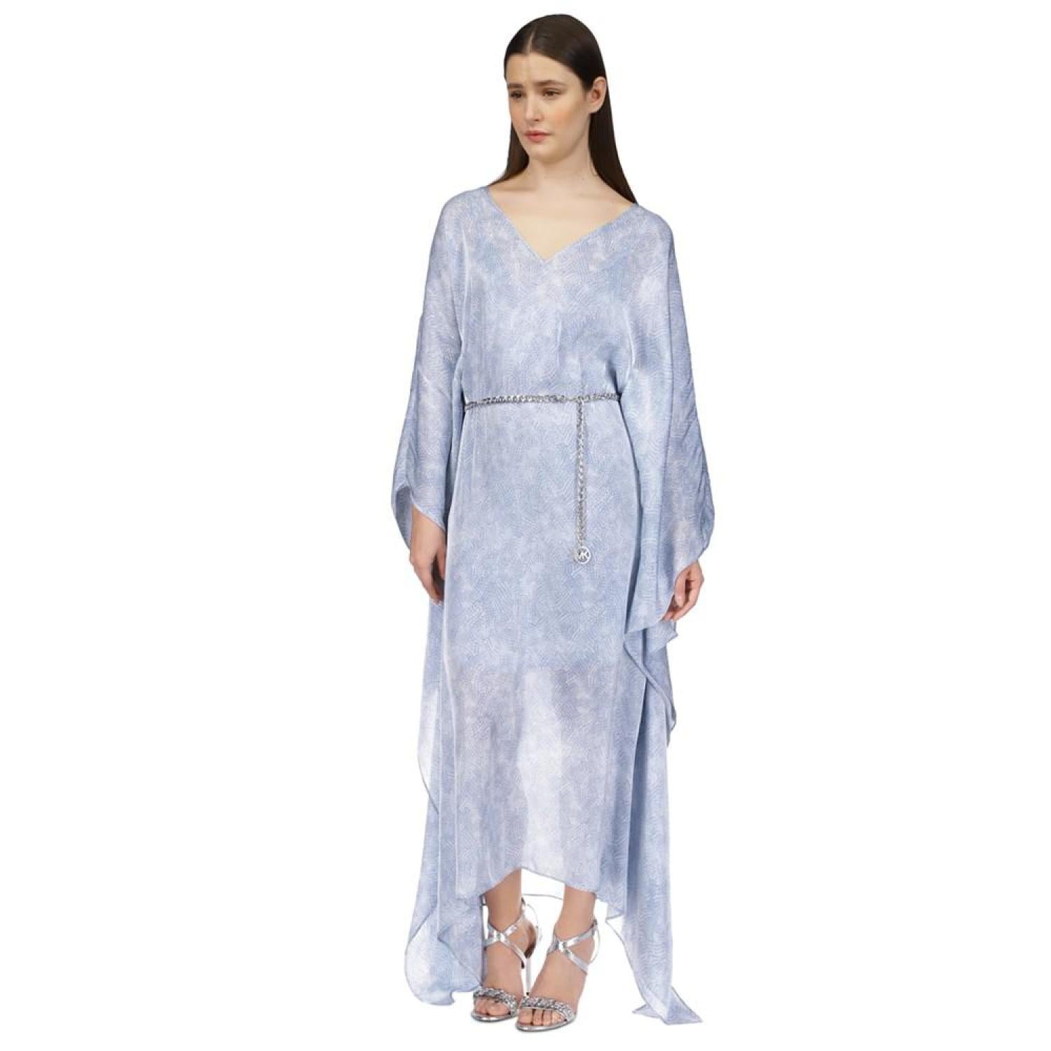 • Flowy poncho sleeves and a handkerchief hem lend elegant movement to this MICHAEL Michael Kors dress, in a soft tonal print perfectly contrasted with a signature chain belt.