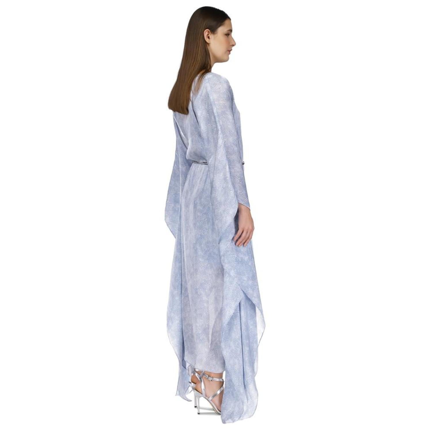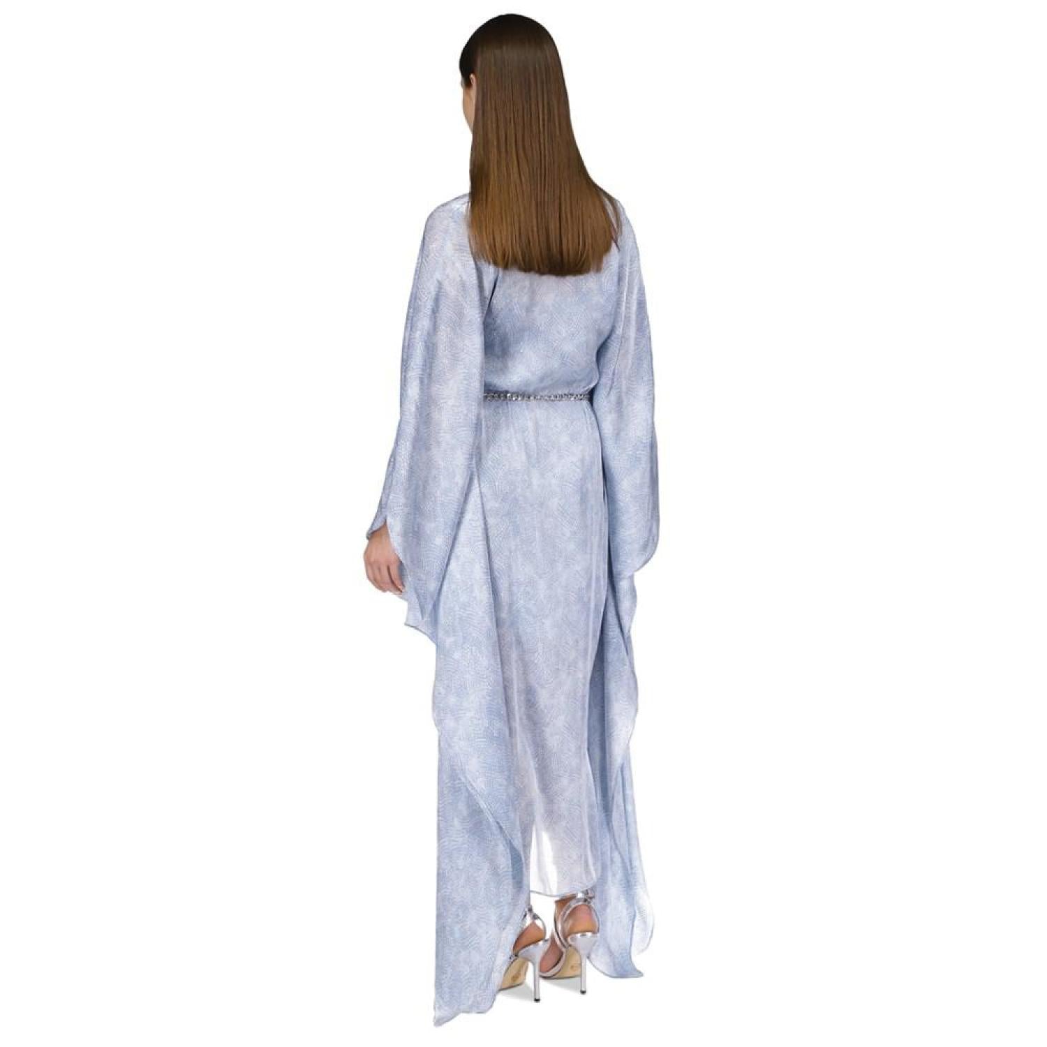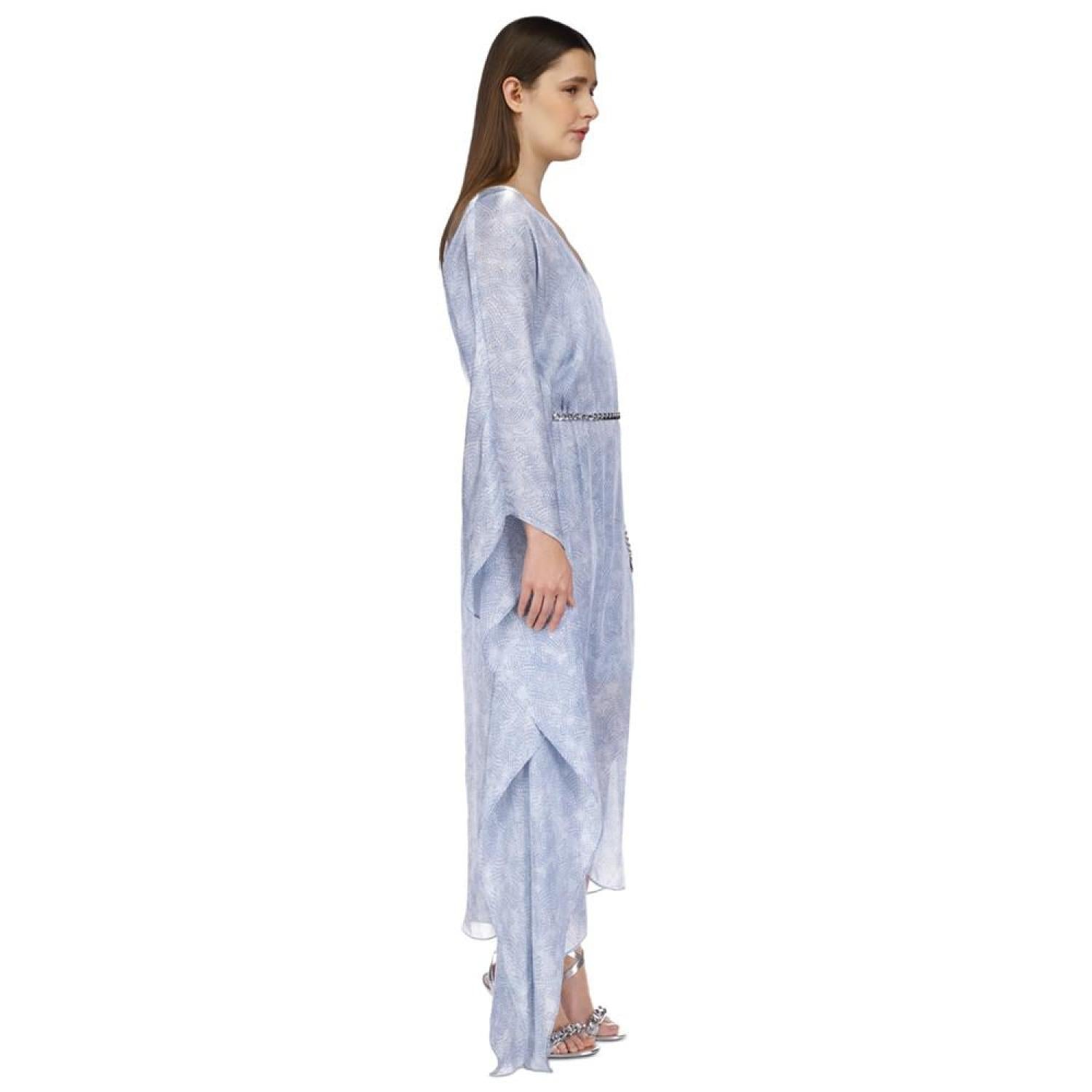 • Flowy poncho sleeves and a handkerchief hem lend elegant movement to this MICHAEL Michael Kors dress, in a soft tonal print perfectly contrasted with a signature chain belt.
