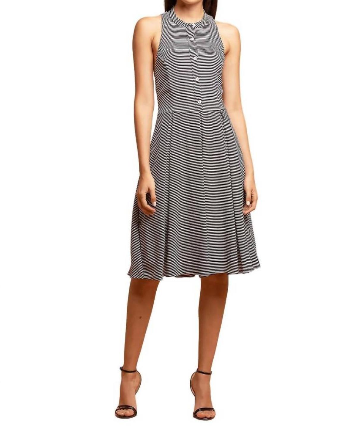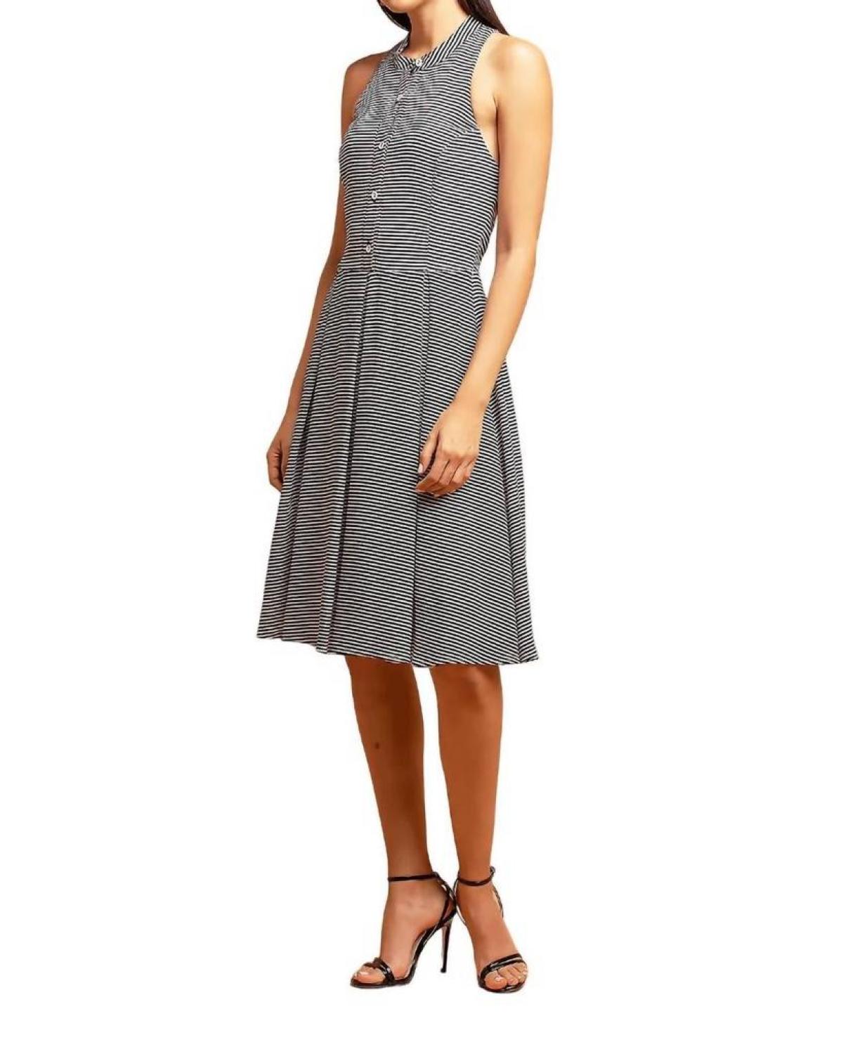 • The perfect length dress does exist.The ARIANA Dress by EVA FRANCO blends timeless elegance with contemporary style. Crafted from a breathable, stretchy cotton blend, it features a fully lined black and white stripe knit. The dress includes a back criss-cross detail and side zipper closure for a seamless fit. Made in the USA, it's a sophisticated sleeveless midi dress designed to turn heads.