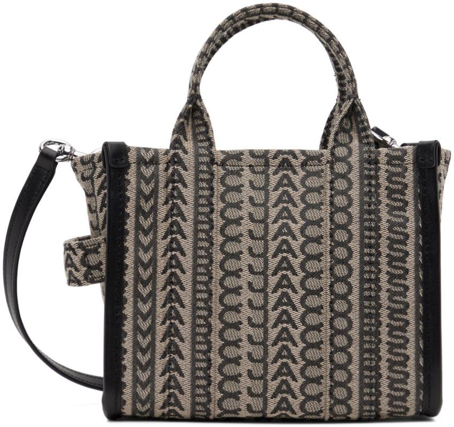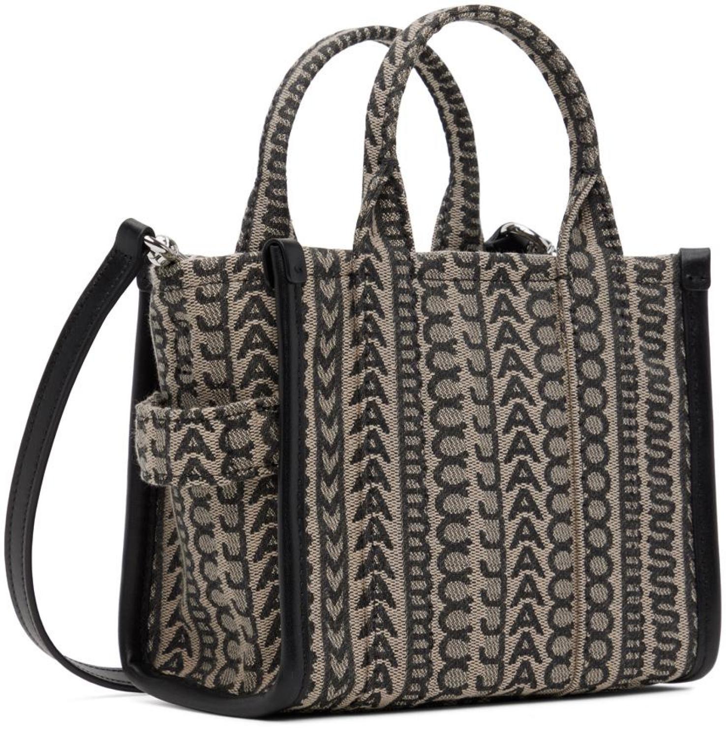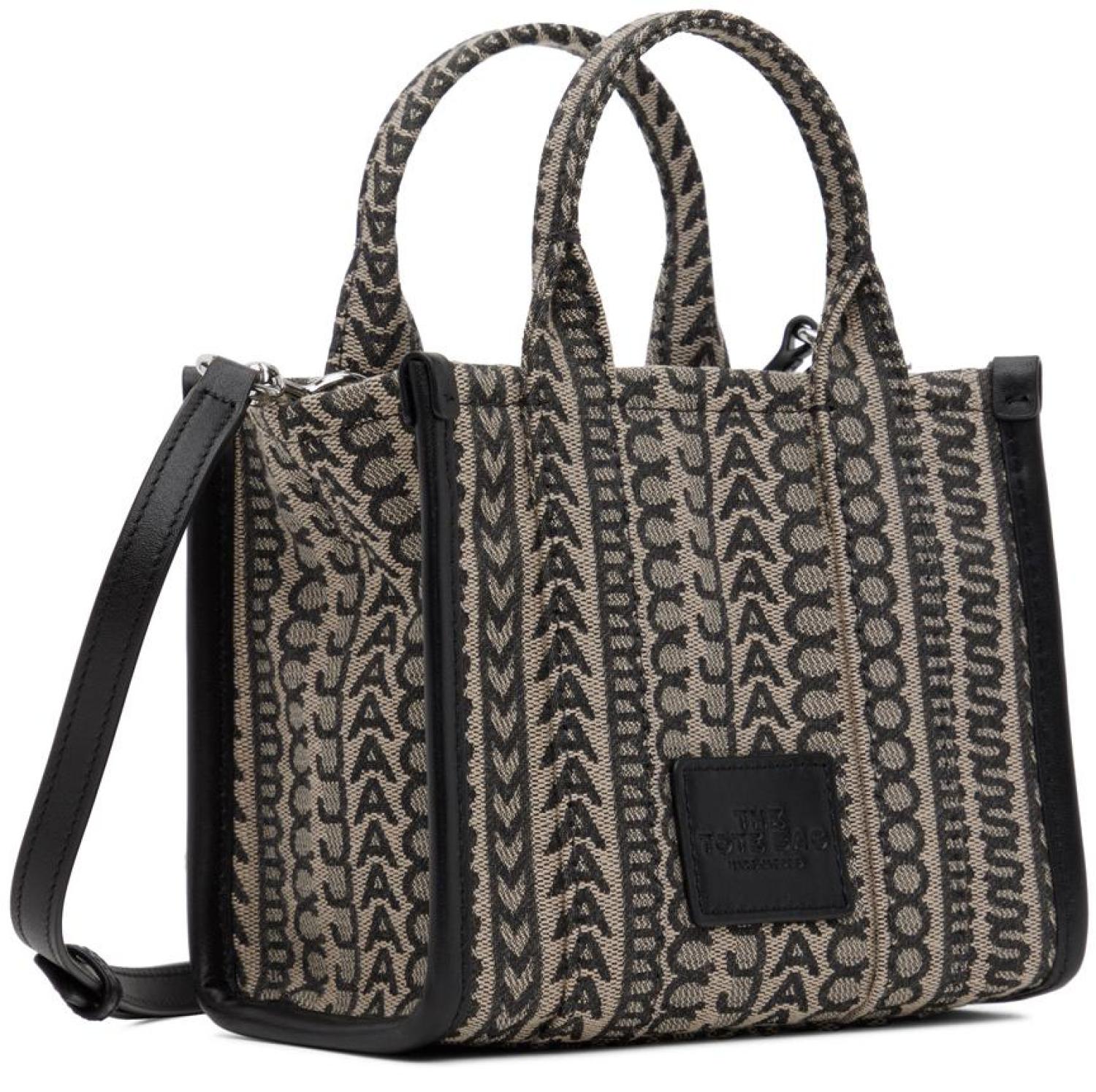 Canvas tote in beige and black. Buffed leather trim and jacquard logo pattern throughout.