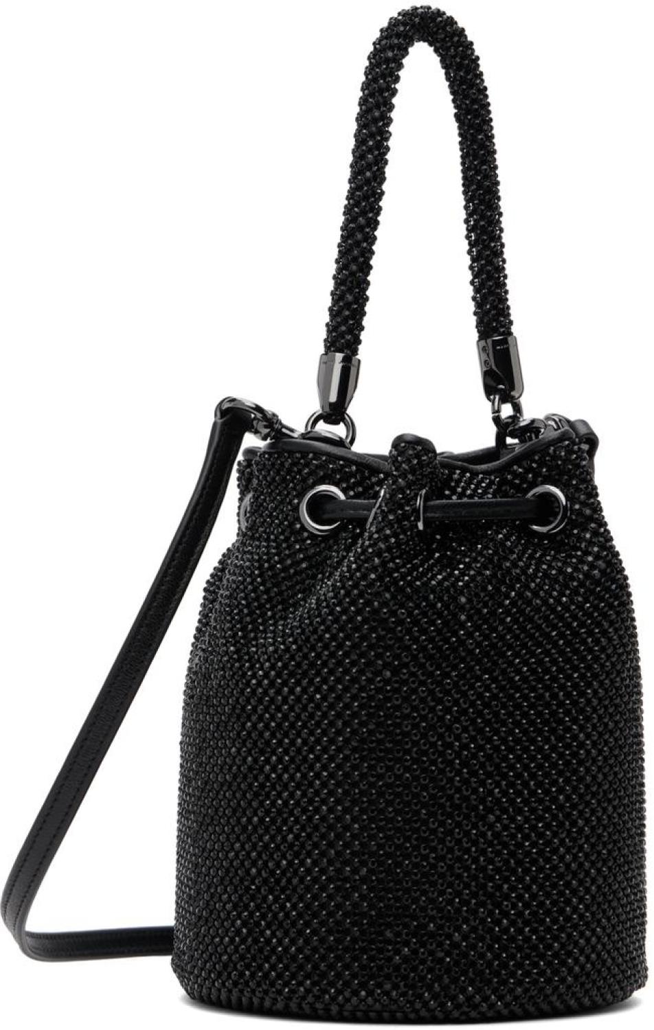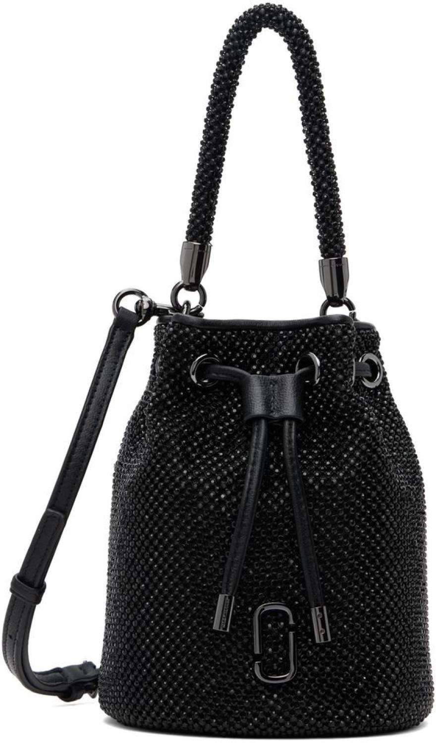 Marc Jacobs Black 'The Rhinestone Mini Bucket' Bag Mesh shoulder bag in black. · Crystal-cut accents throughout · Fixed carry handle · Adjustable and detachable crossbody strap · Logo hardware at face · Drawstring closure · Buffed faux-leather lining · H7.5" x W8.5" x D5.5" Supplier color: Black Body: textile. Lining: polyurethane. Made in China. 242190F048035