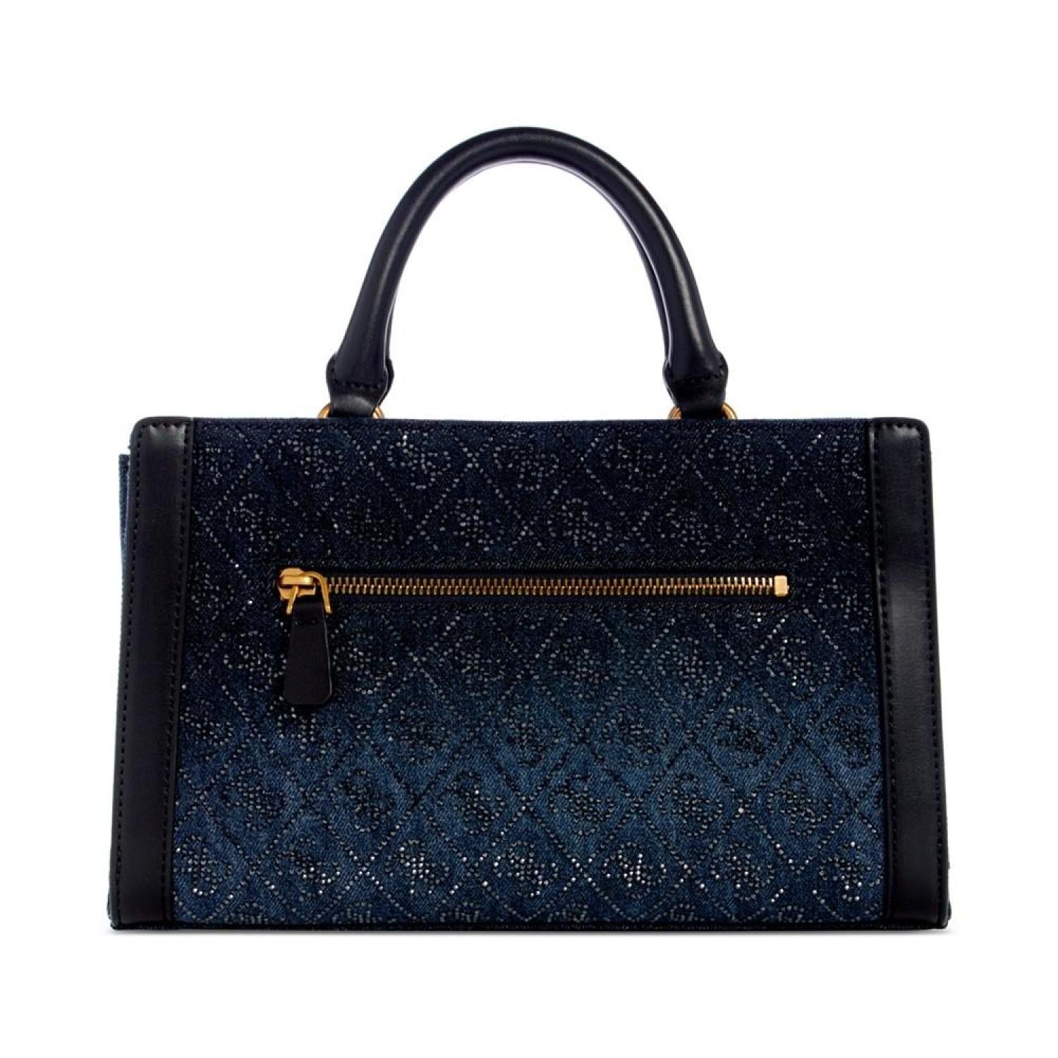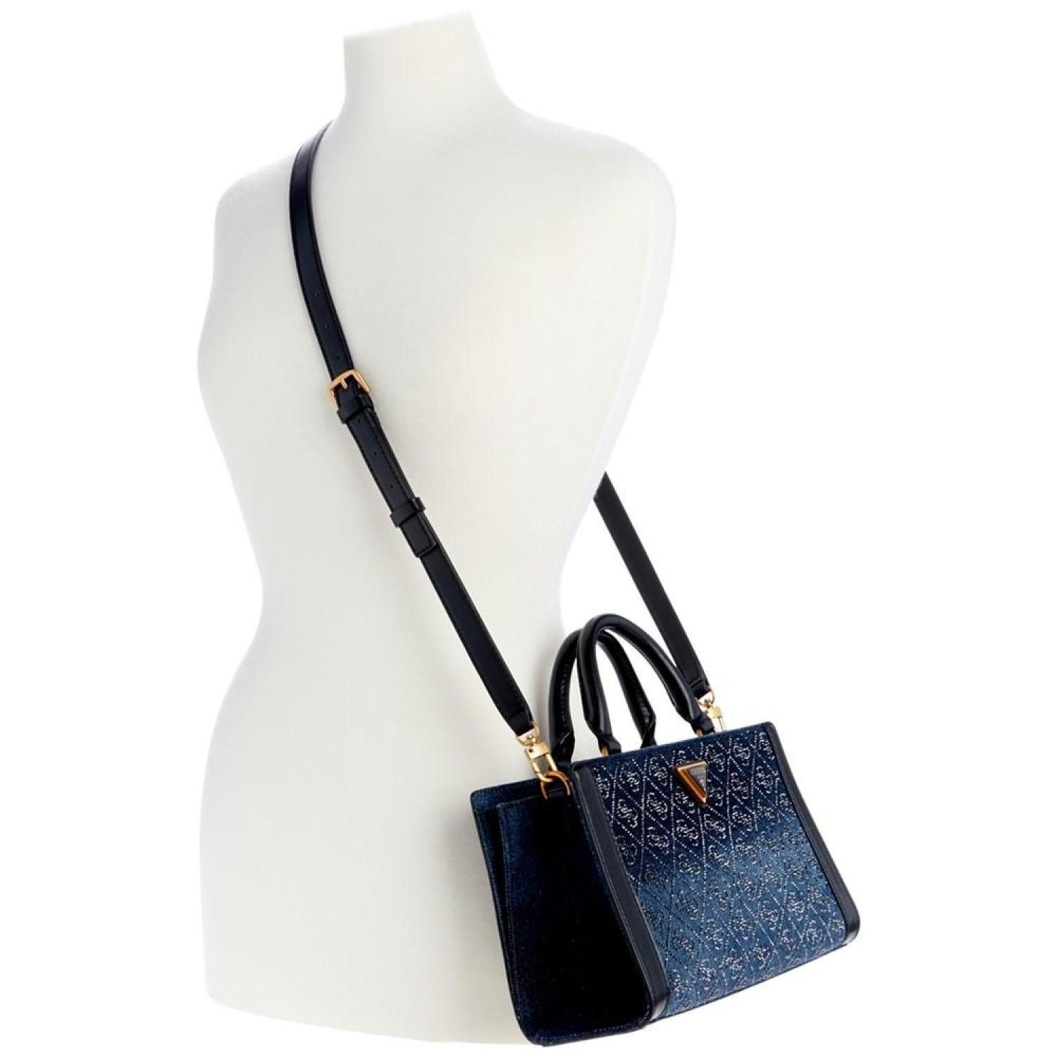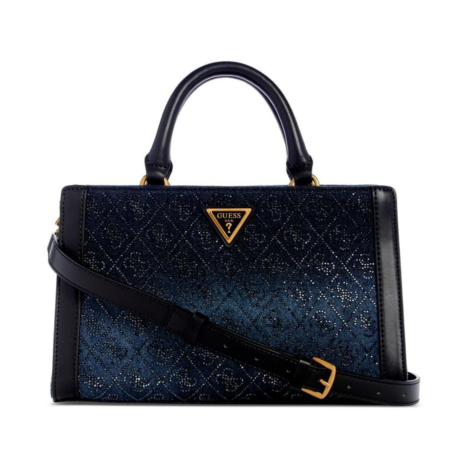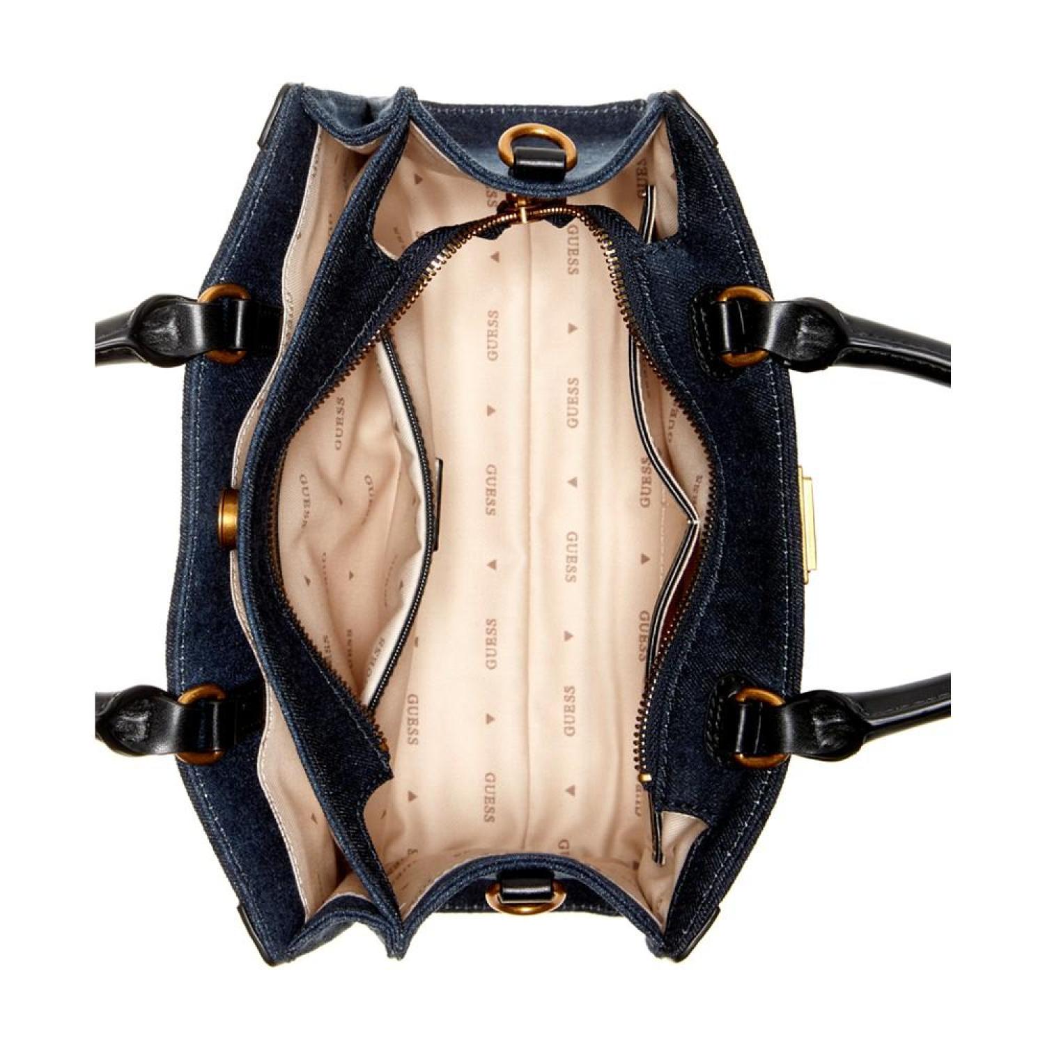 Adorned with a subtle shimmer, this satchel by GUESS offers plenty of pockets to keep you organized and versatile styling options. Small sized bag; 10-3/4"W x 6-1/2"H x 4"D (width is measured across the bottom of handbag); 1.24 lbs. approx. weight Silhouette is based off 5'9" model 3-1/2"L handles; 22"L adjustable, removable strap Zippered closure Antique bronze-tone hardware & logo plaque, metal feet at base, exterior back zip pocket & front & back snap pockets, interior zip & slip pockets Tablet compatible (std. size 8"-10") Cotton Spot clean Imported