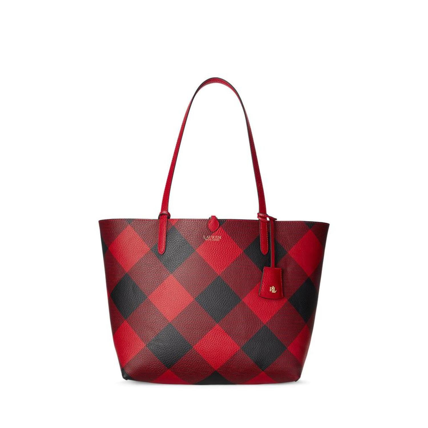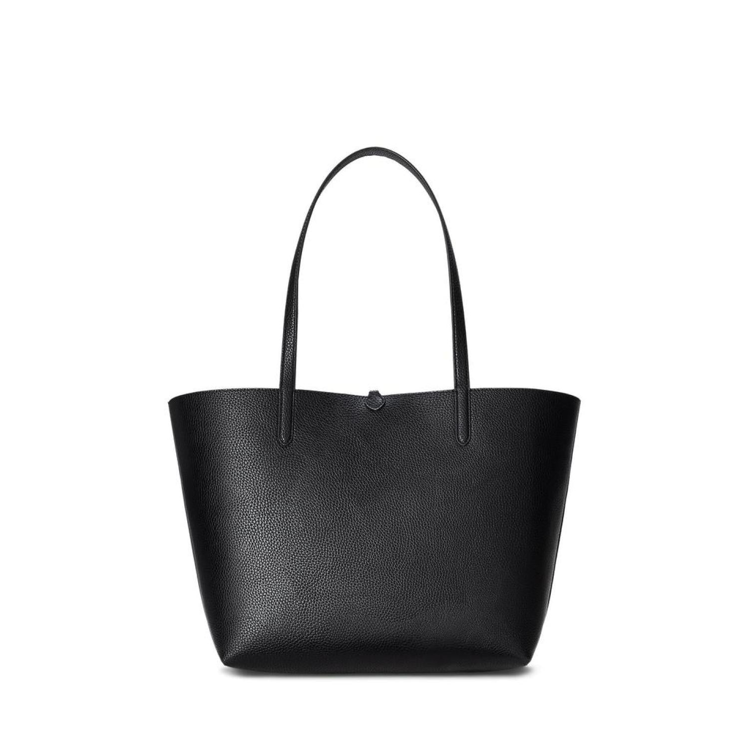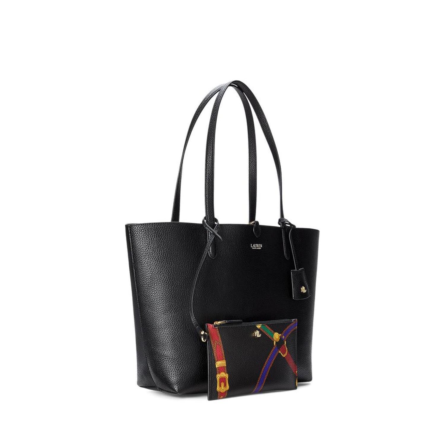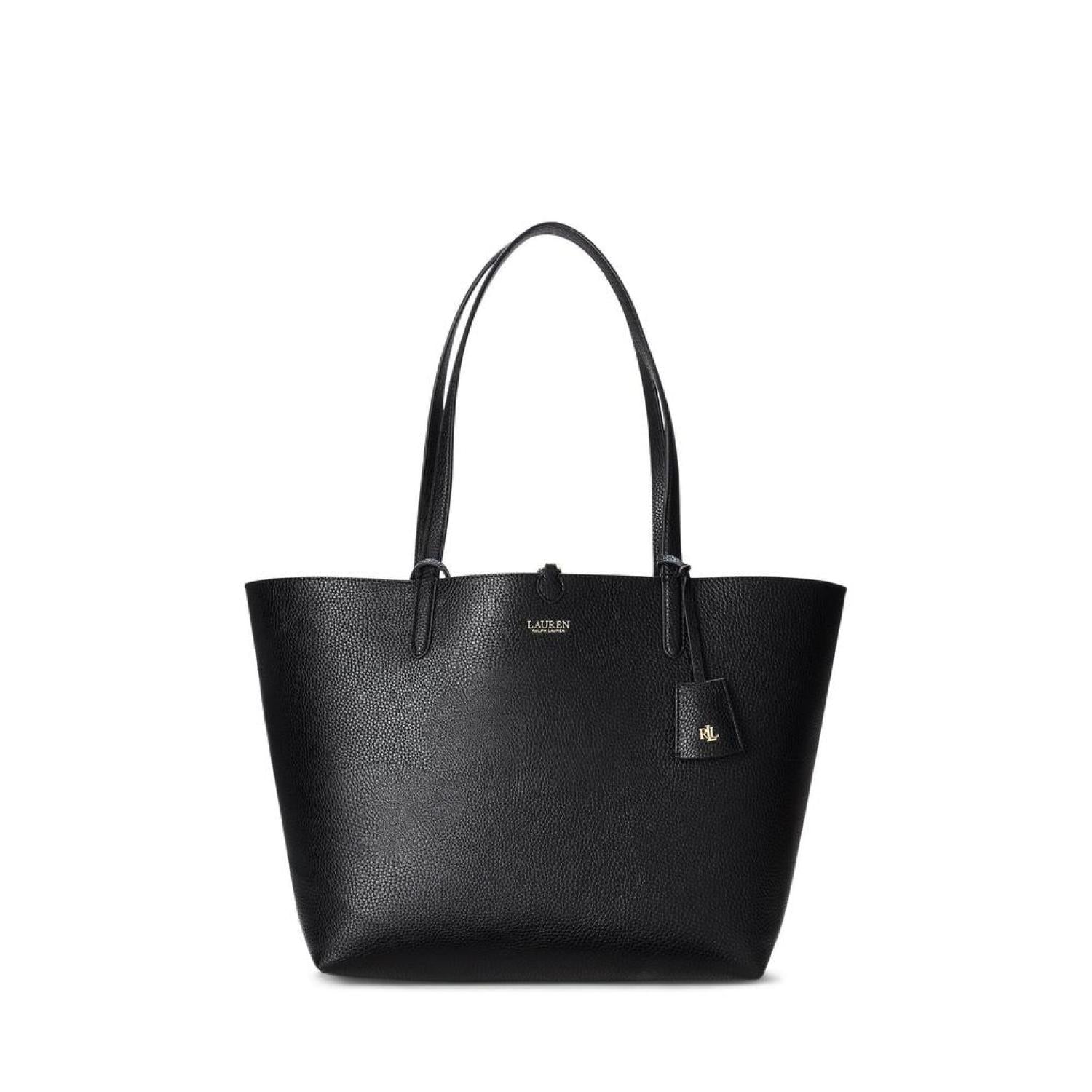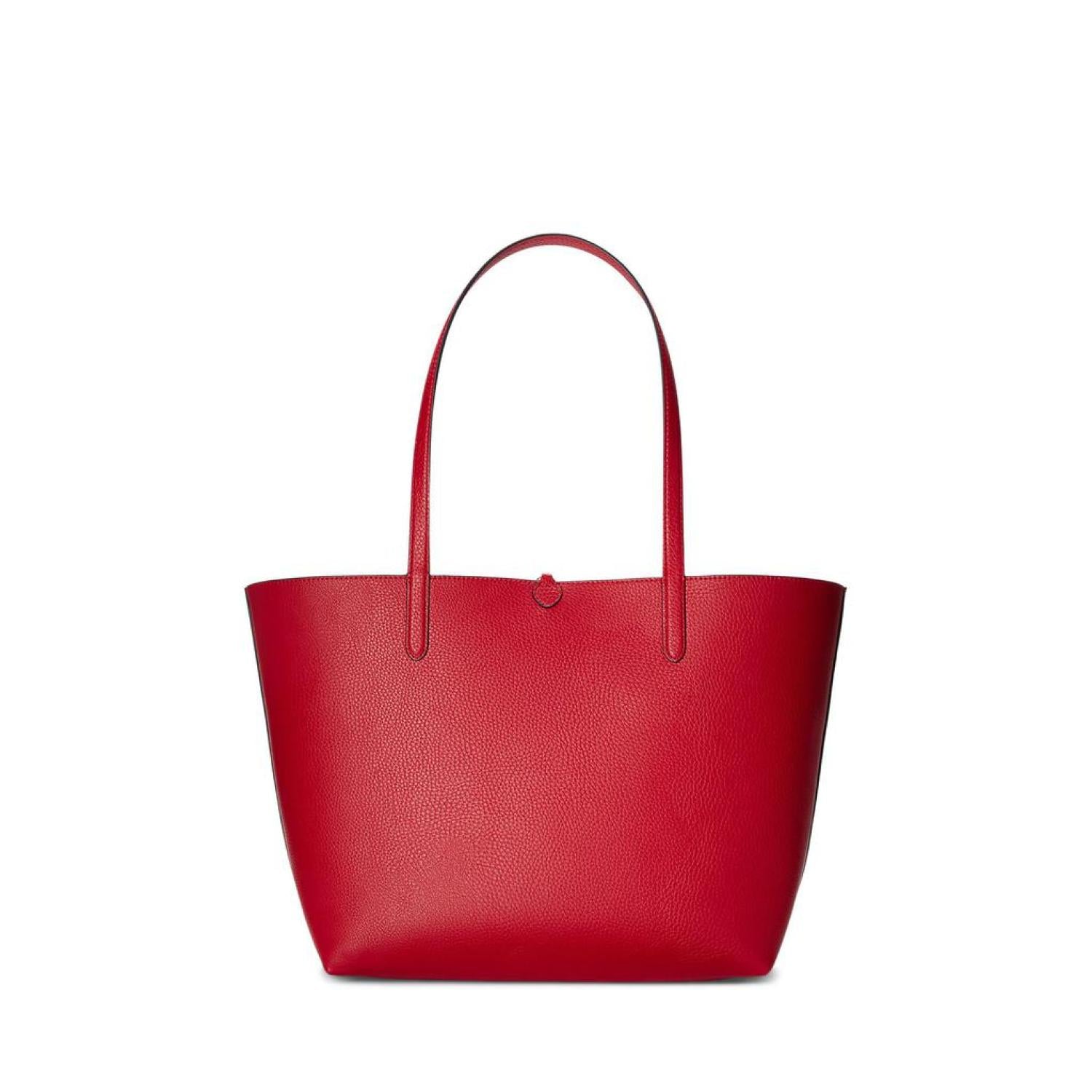 Carry what you need in the LAUREN Ralph Lauren® Faux-Leather Medium Reversible Tote. This classy bag features dog-clip closure, dual carry handles, foil-print brand detailing at the front, and removable brand name engraved hardware. Detachable zippered pouch included. Faux leather lining. Imported. Please note, the hardware color and interior lining may differ from the color shown in the photo. Measurements: Depth: 5 in Height: 11 1/4 in