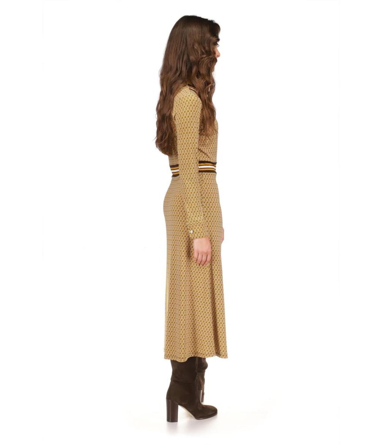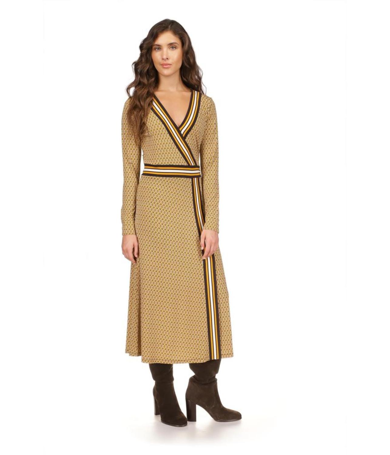 Strike a stunning appeal everytime you step outdoors wearing MICHAEL Michael Kors® Faux Wrap Border Print Midi Dress. The dress comes in a faux wrap design with V-neckline and borders with multicolored stripes. The allover printed dress features a flowing skirt that is intended to hit at the calves. 95% polyester, 5% elastane. Dry clean, machine wash, dry flat. Imported.