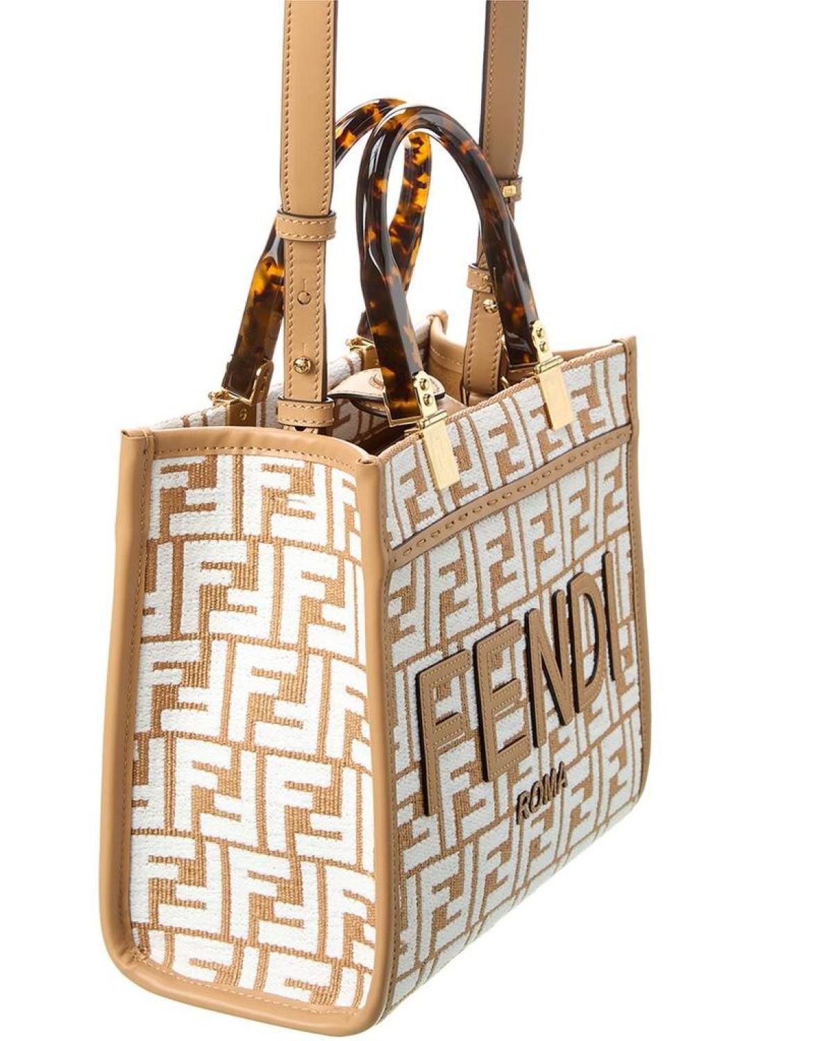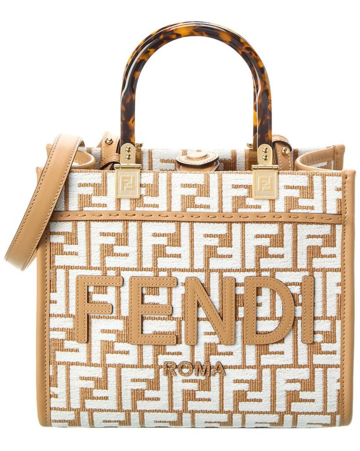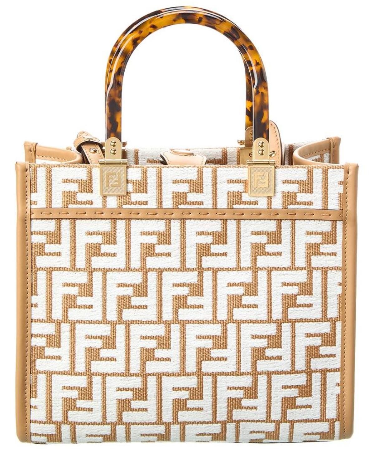 Introducing the FENDI Sunshine Small Raffia & Leather Tote – an elegant and innovative addition to your handbag collection. Made in Italy with meticulous craftsmanship, this tote showcases the brand's commitment to luxury and timeless sophistication.Crafted in a beautiful combination of beige and white FF fabric and leather, this tote features gold-tone hardware and plexiglass top handles, adding a touch of glamour to your ensemble. The bag measures 10 inches wide, 8.75 inches high, and 4.75 inches deep, providing ample space for your essentials.Designed for versatility, this tote comes with a top handle drop of 5 inches and a removable shoulder strap that drops 23 inches. Whether you prefer to carry it by hand or wear it over your shoulder, this tote offers multiple styling options to suit your needs.With an open top design, accessing your belongings is effortless and convenient. Please note that all measurements were taken by hand and are approximate; slight variations may occur. However, rest assured that our products are 100% genuine. In some cases, we may purchase merchandise from trusted independent suppliers, but we always stand by the authenticity of every product sold on our site.Elevate your style with the FENDI Sunshine Small Raffia & Leather Tote, a luxurious accessory that perfectly captures the spirit of Italian craftsmanship and elegance. Shop now and experience the allure of FENDI's iconic designs.