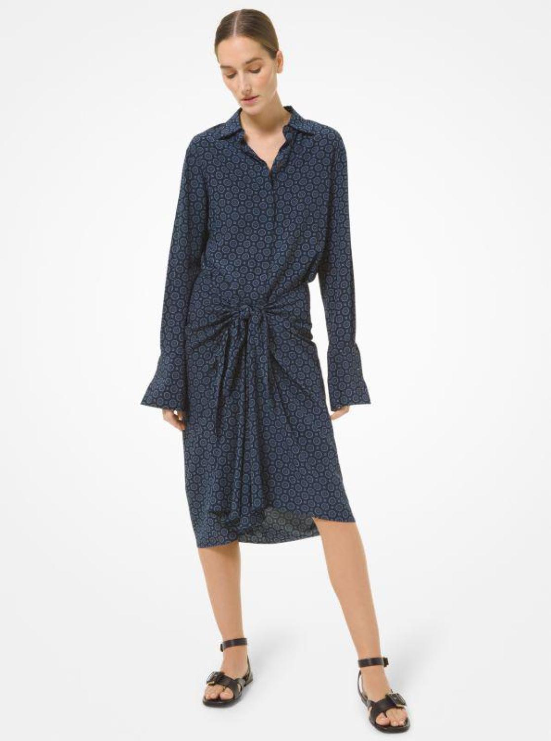 Tailored from pure silk crepe de chine, this shirtdress is a luxurious addition to any wardrobe. Its menswear-inspired silhouette features an eye-catching foulard print, knuckle-grazing sleeves and an attached tie waist designed to flatter the figure. In a rich midnight hue, it’s the perfect companion to the season’s earth-hued leather accessories. • Shirtdress • Silk crepe de chine • 100% silk • Button fastening • Dry clean • Made in Italy • Model is 5’10”/178 cm wearing size XS • Shirtdress • Silk crepe de chine • 100% silk • Button fastening • Dry clean • Made in Italy • Model is 5’10”/178 cm wearing size XS