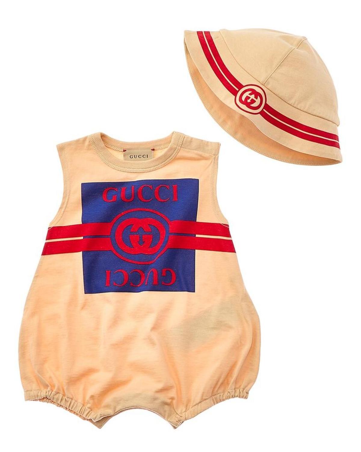 • Elevate your little one's wardrobe with the Gucci 2pc Bodysuit & Hat Set. This stylish ensemble exudes the eclectic and coveted essence of the Italian luxury brand. The set includes a beige bodysuit and matching bucket hat, both beautifully crafted from 100% cotton. Featuring convenient snap closures and a hand wash recommendation, this set is both practical and luxurious. Made in Italy and guaranteed to be 100% genuine, this set is a must-have for any fashion-forward child. Shop with confidence knowing that every Gucci product we offer is authentic and sourced from trusted independent suppliers. Add this designer set to your child's collection today and enjoy the sophistication and quality that Gucci is renowned for.