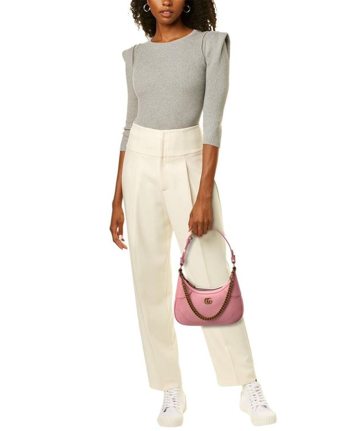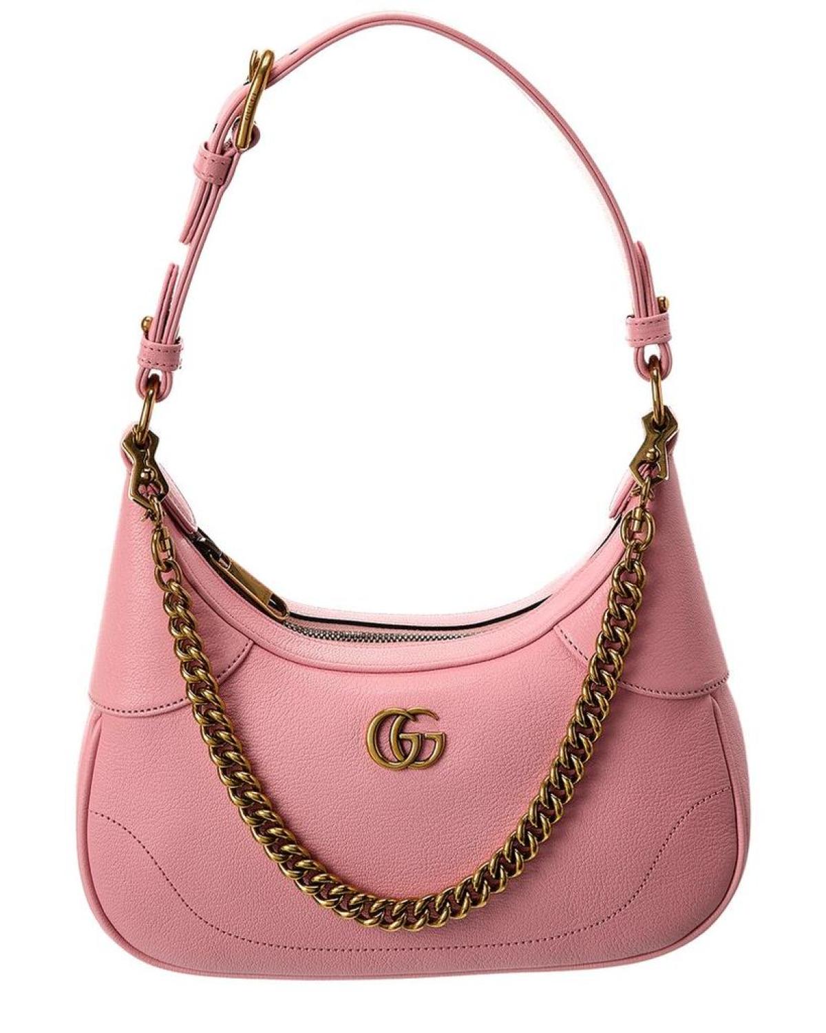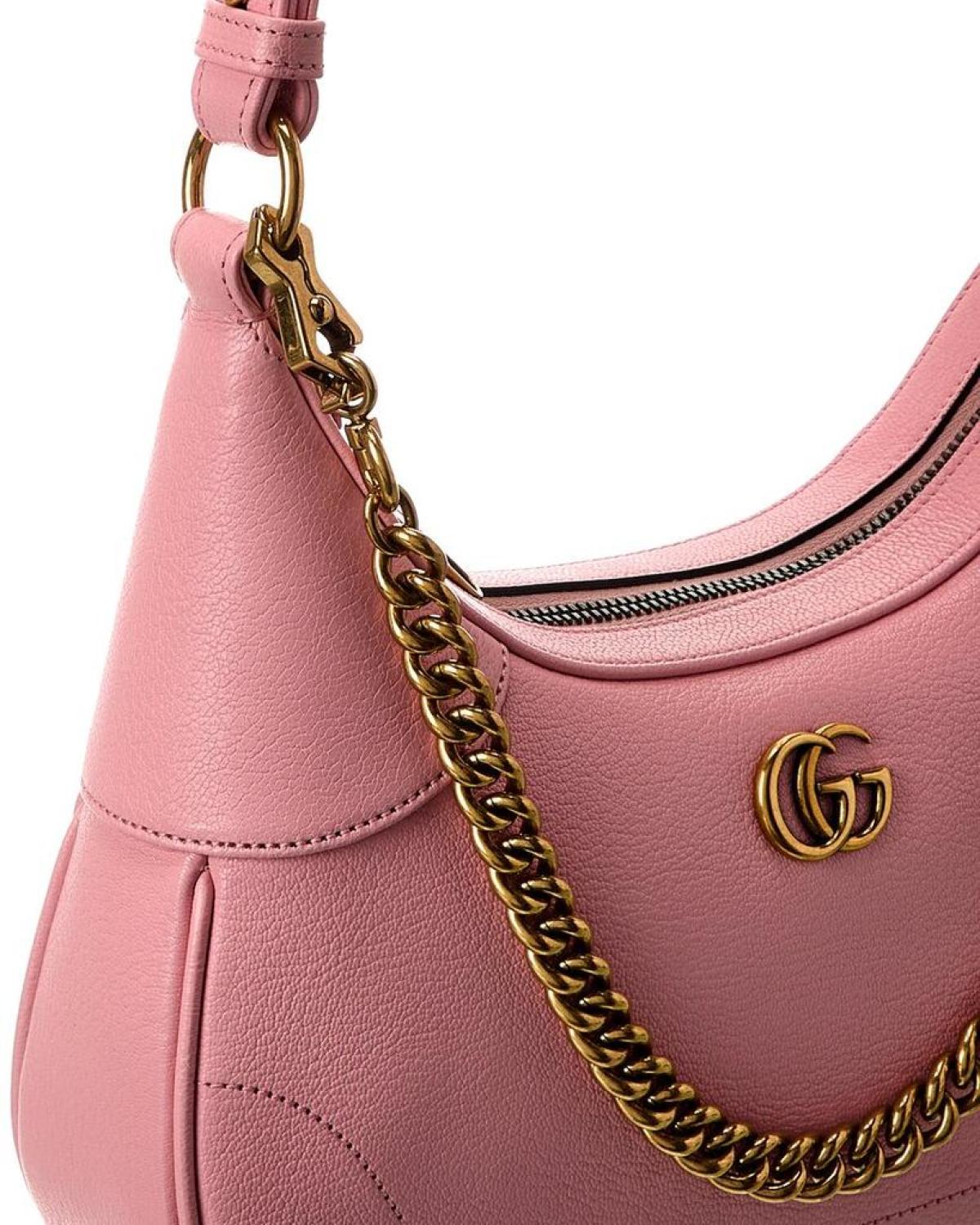 Indulge in luxurious Italian craftsmanship with the Gucci Aphrodite Small Leather Hobo Bag. Made in Italy, this handbag boasts light pink leather with light fine gold hardware and an interlocking G logo accent. With interchangeable shoulder straps and a top handle drop of 10 inches, this hobo bag offers versatile styling options. The interior fabric lining and zipper closure keep your belongings secure and organized. Measuring 9.9 inches wide by 7.5 inches high and 2.8 inches deep, this handbag is perfect for everyday use. Please note that all measurements are approximate and slight variations may occur. Trust in our commitment to authenticity as we stand by the genuineness of every product sold on our site. Shop the Gucci Aphrodite Small Leather Hobo Bag and discover why Gucci is an eclectic and coveted brand that offers Italian luxury redefined.