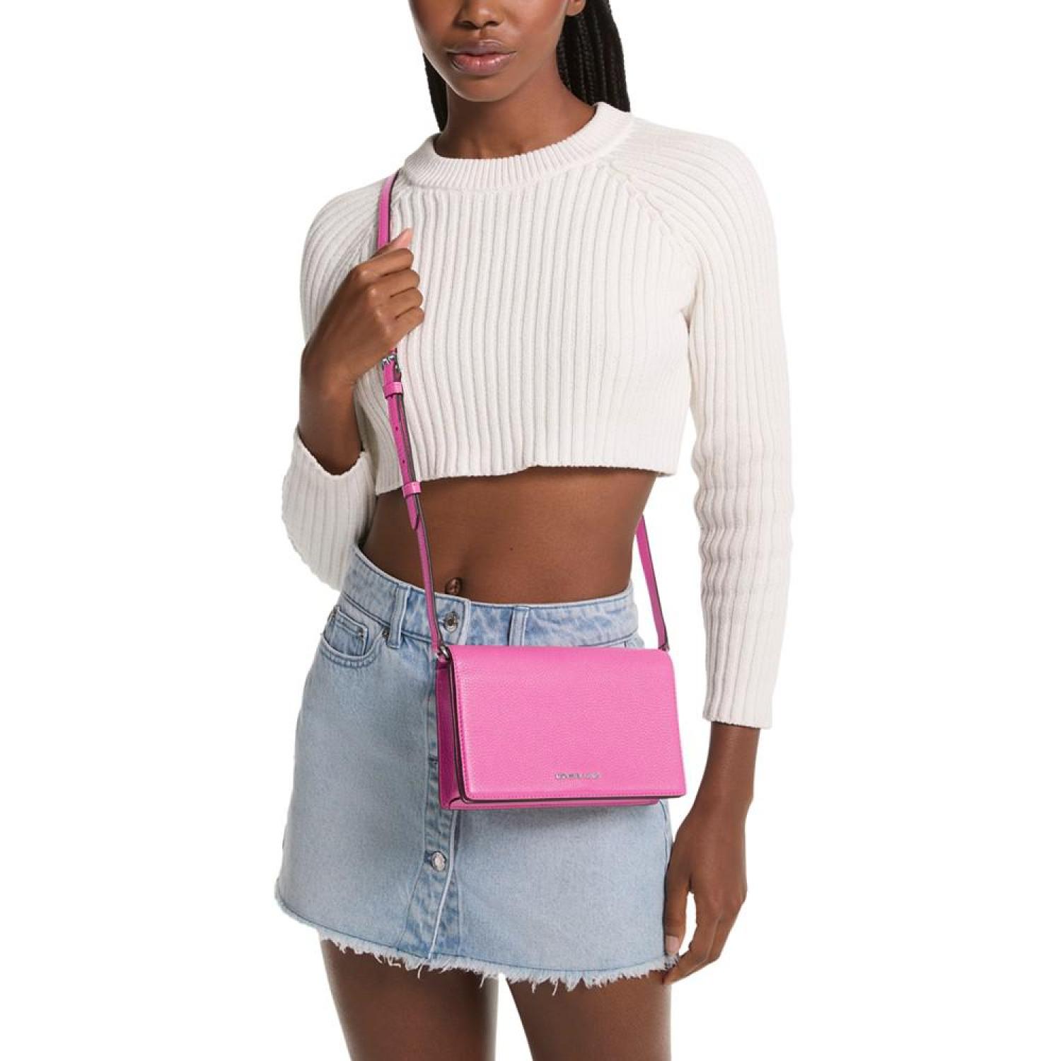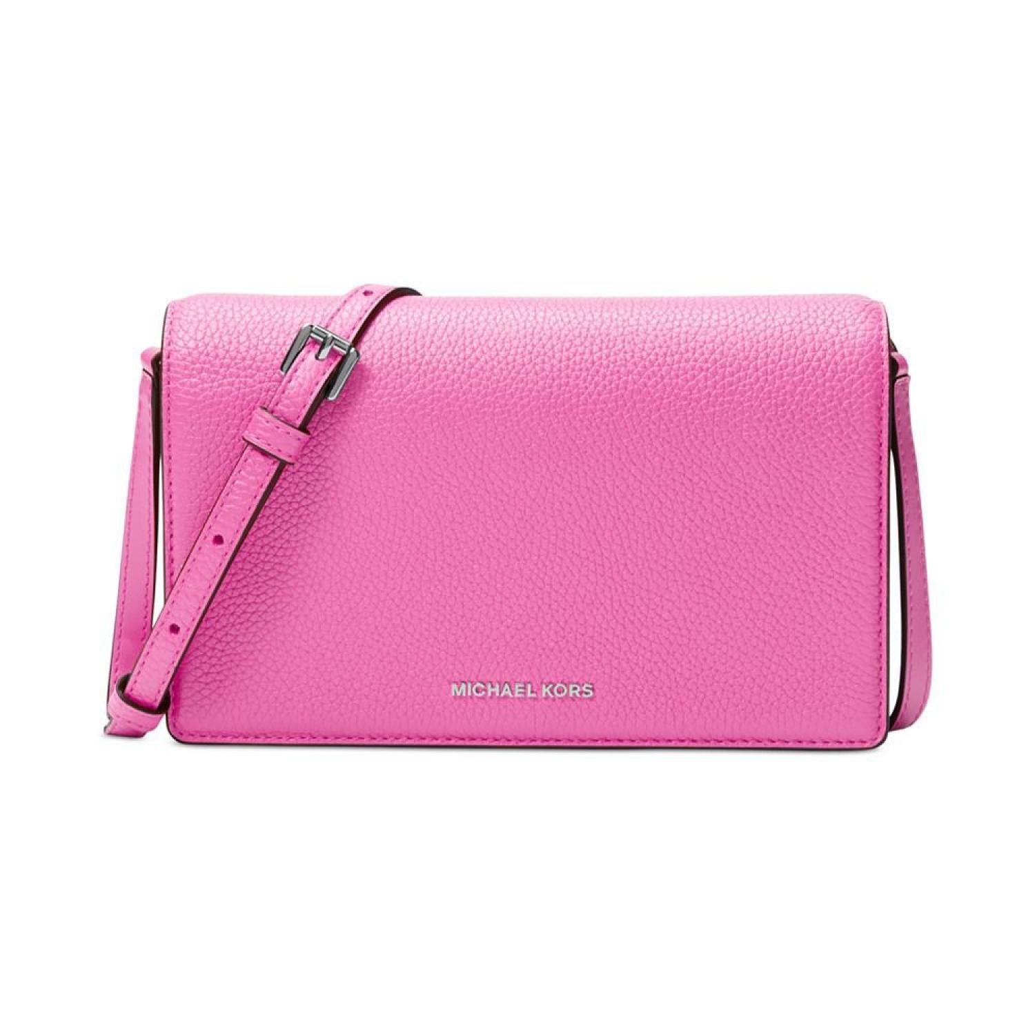 Simple and chic, this leather crossbody by MICHAEL Michael Kors is perfect for everyday style and features a flap closure for easy access to your essentials. Small sized bag; 8-1/2"W x 5-1/2"H x 1-3/4"D (width is measured across the bottom of handbag) Silhouette is based off 5'9" model 24"L adjustable strap Flap with magnetic snap closure Silver-tone hardware & logo Interior zip pocket Leather; lining: polyester; trim: polyurethane, cotton, polyester Spot clean Imported