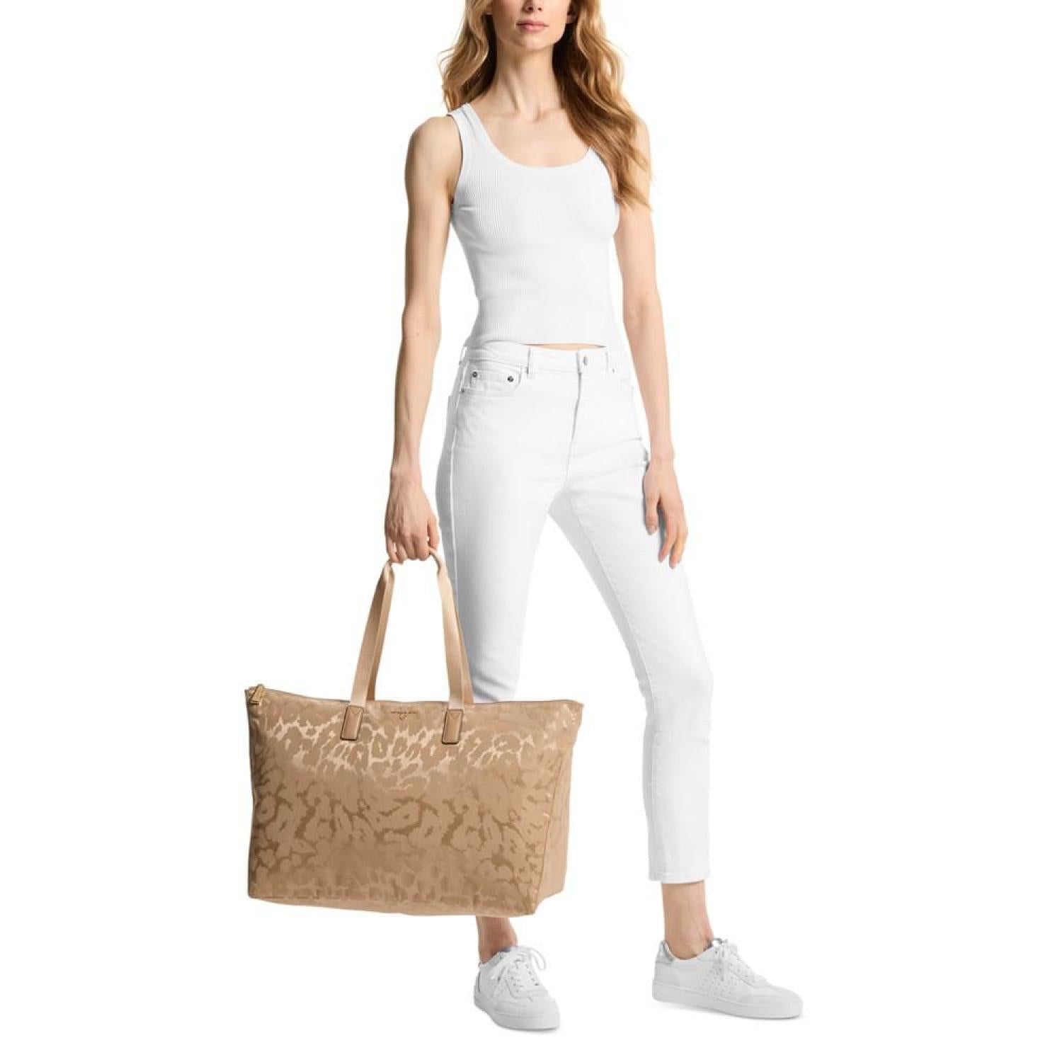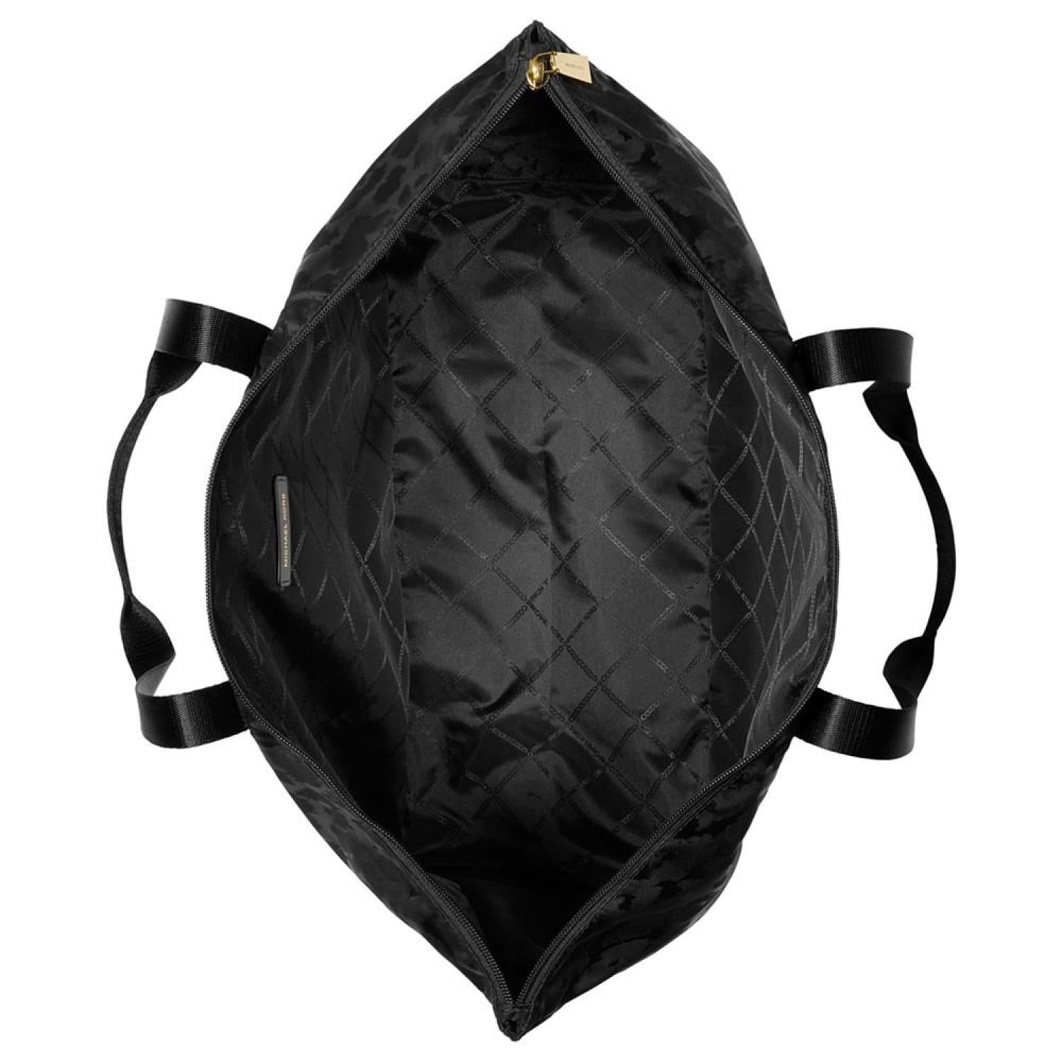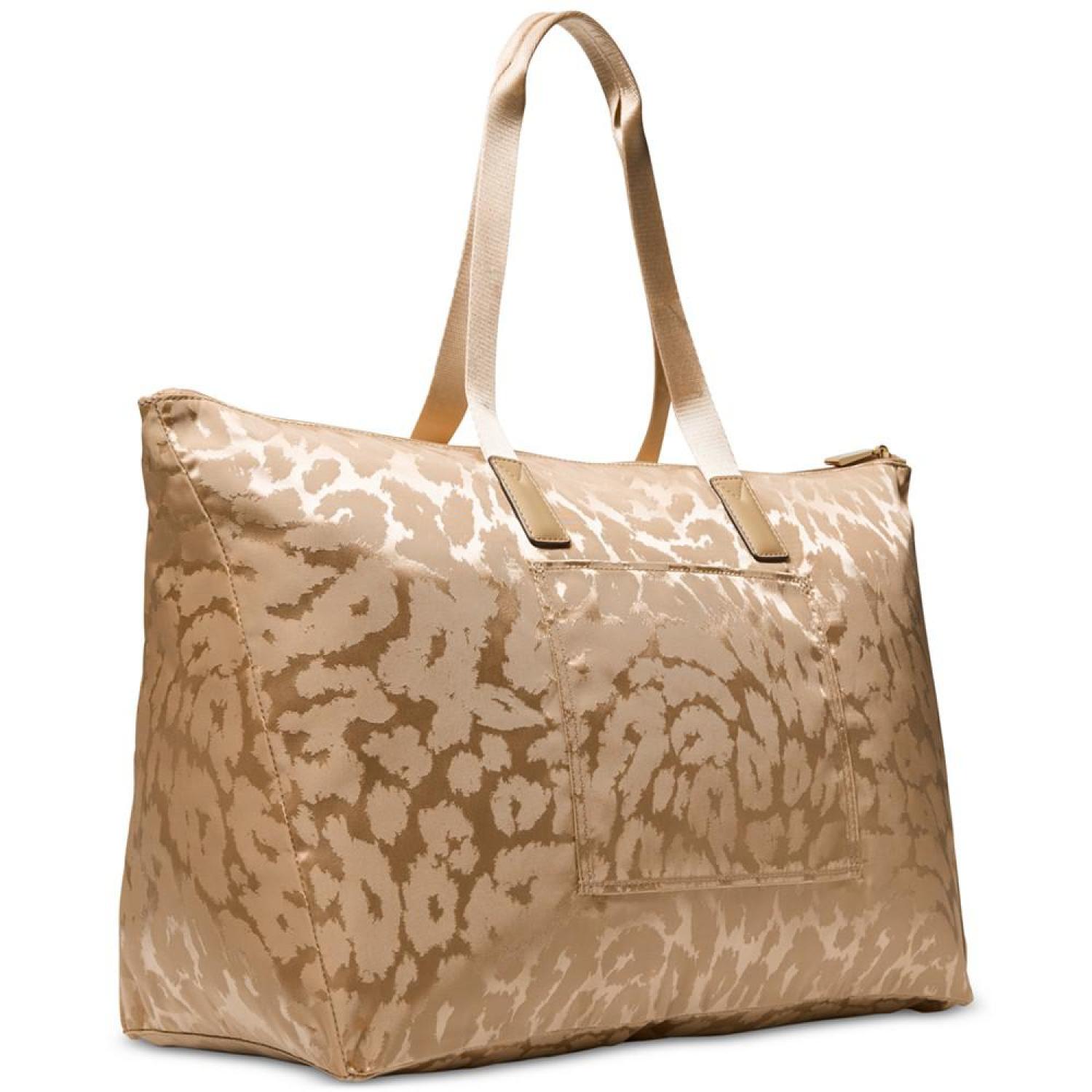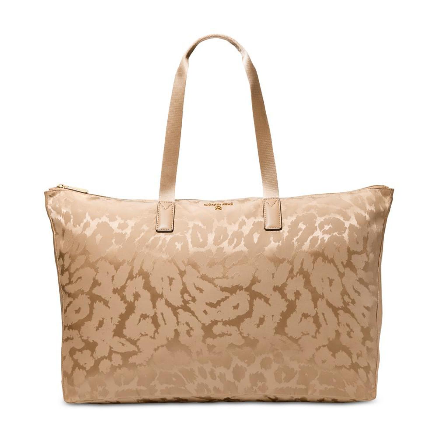 Crafted in weather-resistant nylon with a sophisticated design, this tote by MICHAEL Michael Kors is the perfect companion for any adventure thanks to its packability and trolley sleeve. Extra-large sized bag; 22-1/2"W x 12-1/4"H x 9"D (width is measured across the bottom of handbag); 0.78 lbs. approx. weight Silhouette is based off 5'9" model 10"L handles Zippered closure Gold-tone hardware & logo; exterior back trolley sleeve Nylon; lining: polyester; trim 1: PU, cotton, polyester; trim 2: nylon x Imported