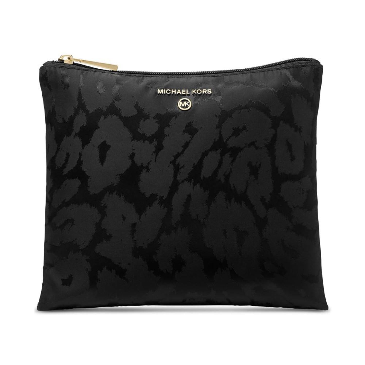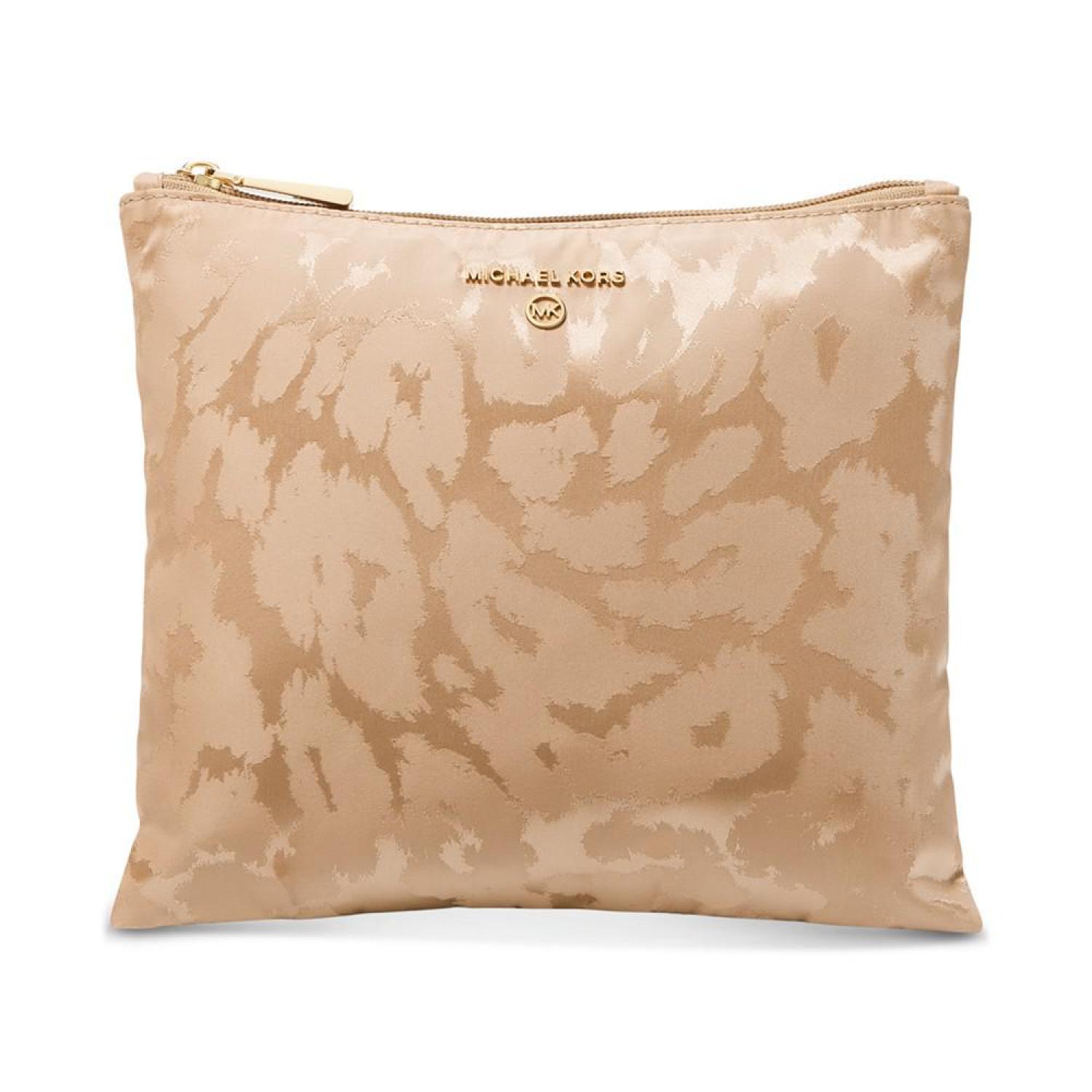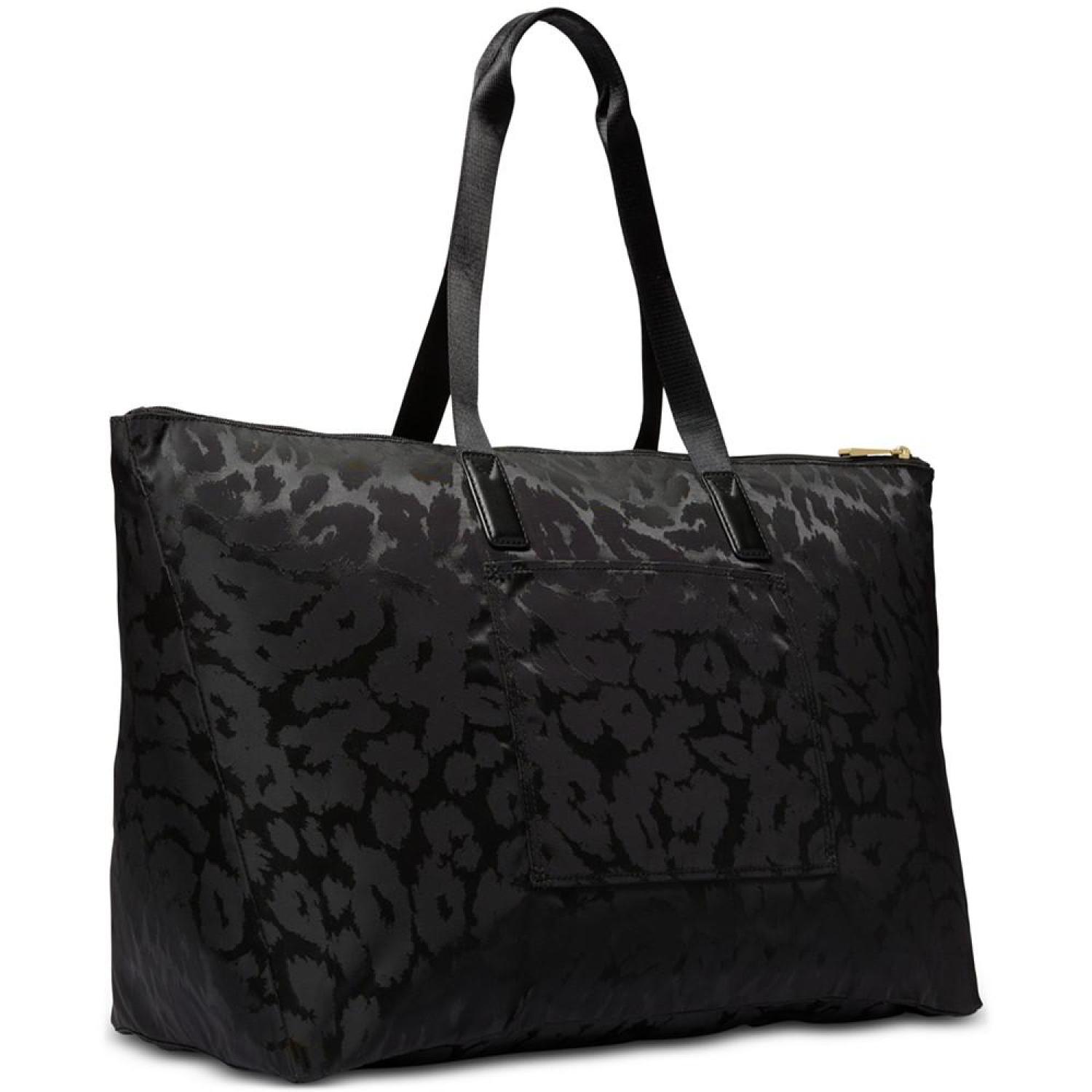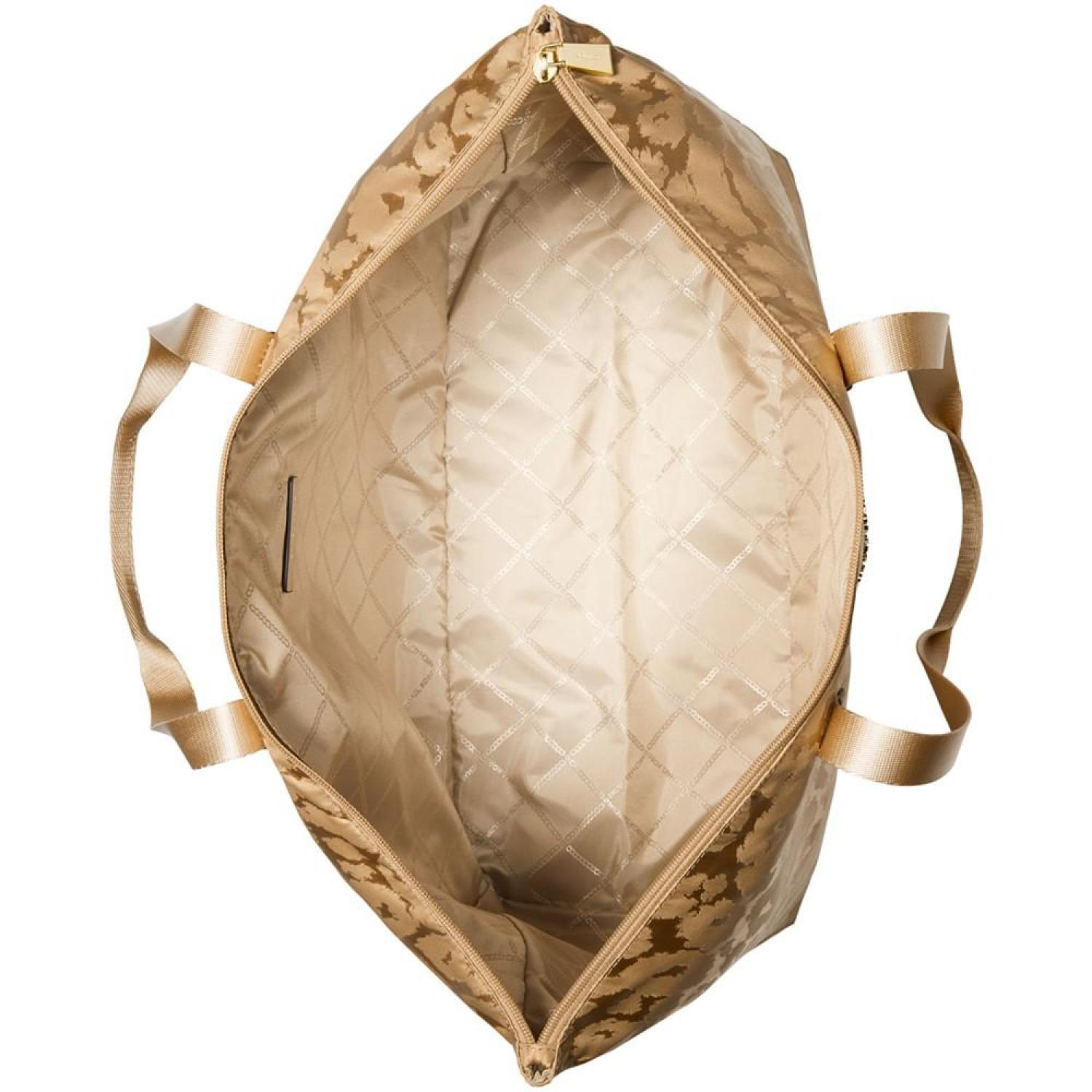 Crafted in weather-resistant nylon with a sophisticated design, this tote by MICHAEL Michael Kors is the perfect companion for any adventure thanks to its packability and trolley sleeve. Extra-large sized bag; 22-1/2"W x 12-1/4"H x 9"D (width is measured across the bottom of handbag); 0.78 lbs. approx. weight Silhouette is based off 5'9" model 10"L handles Zippered closure Gold-tone hardware & logo; exterior back trolley sleeve Nylon; lining: polyester; trim 1: PU, cotton, polyester; trim 2: nylon x Imported