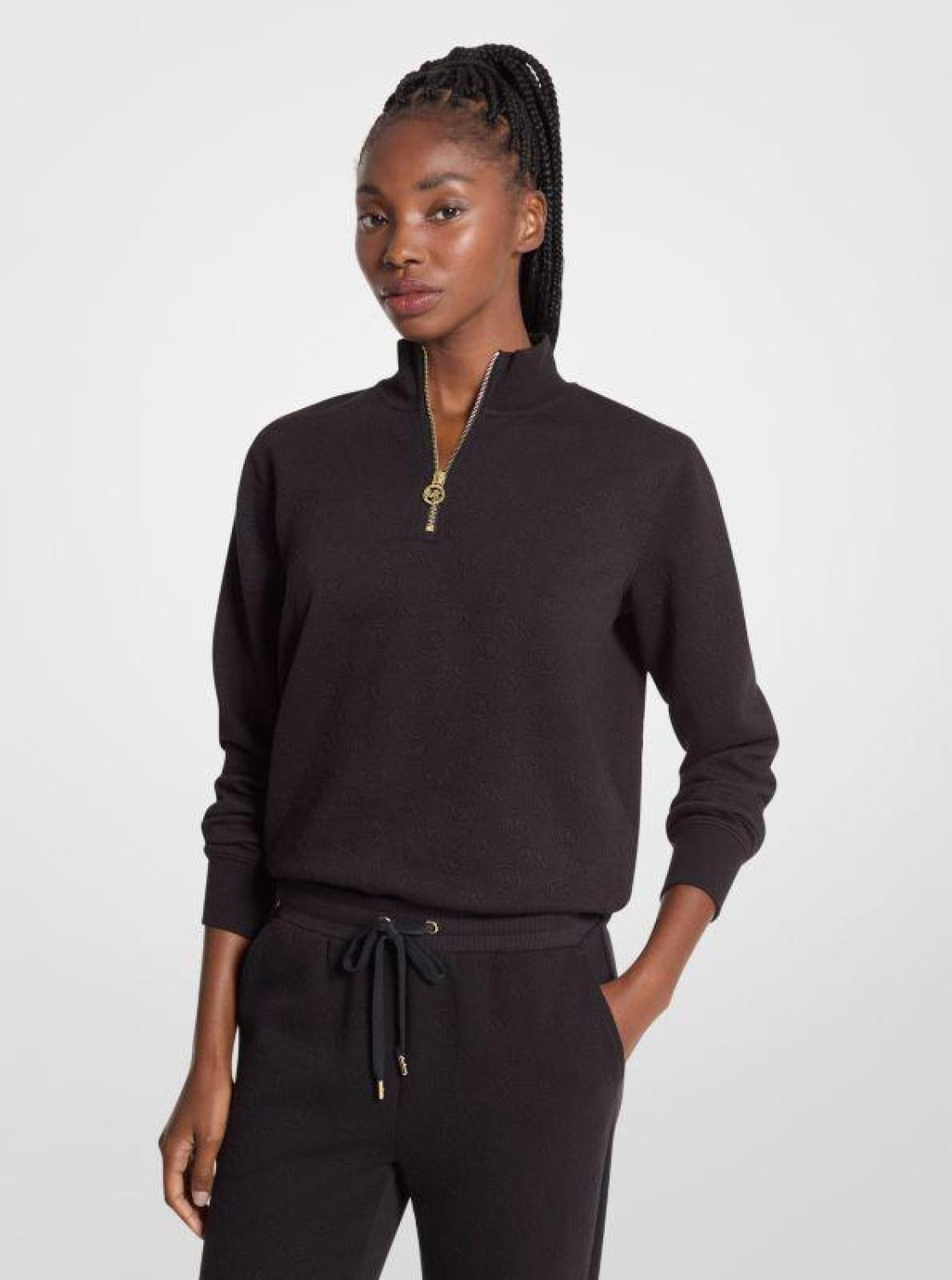 • This quarter-zip pullover offers an elevated take on the off-duty staple with a logo-jacquard pattern and gilded hardware. Pair it with the matching joggers for an effortlessly put-together look you’ll want to wear every weekend.