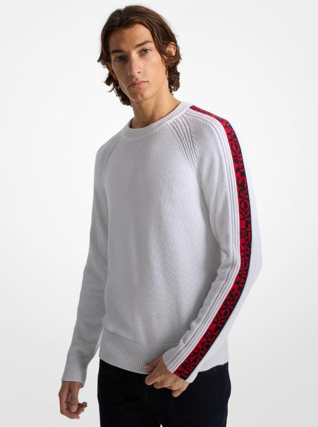 • A lightweight knit with a sporty update, this crewneck sweater features contrasting logo tape trim along the sleeves. It’s made from a soft cotton blend in a relaxed fit, so you can easily layer it over your favorite tees. Consider it an easy add-on for cool days.