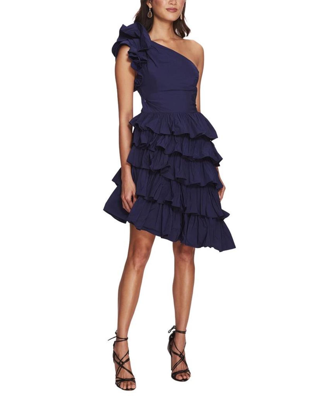 Elevate your evening look with the Marchesa Notte One-Shoulder Mini Dress in Navy. This stunning dress is perfect for gowns and cocktails for that special night. The dress features a sleek one-shoulder design and is crafted from 100% polyester. With a center back zipper for easy dressing, this mini dress measures approximately 38.25 inches from shoulder to hem. Dry clean only. Imported.