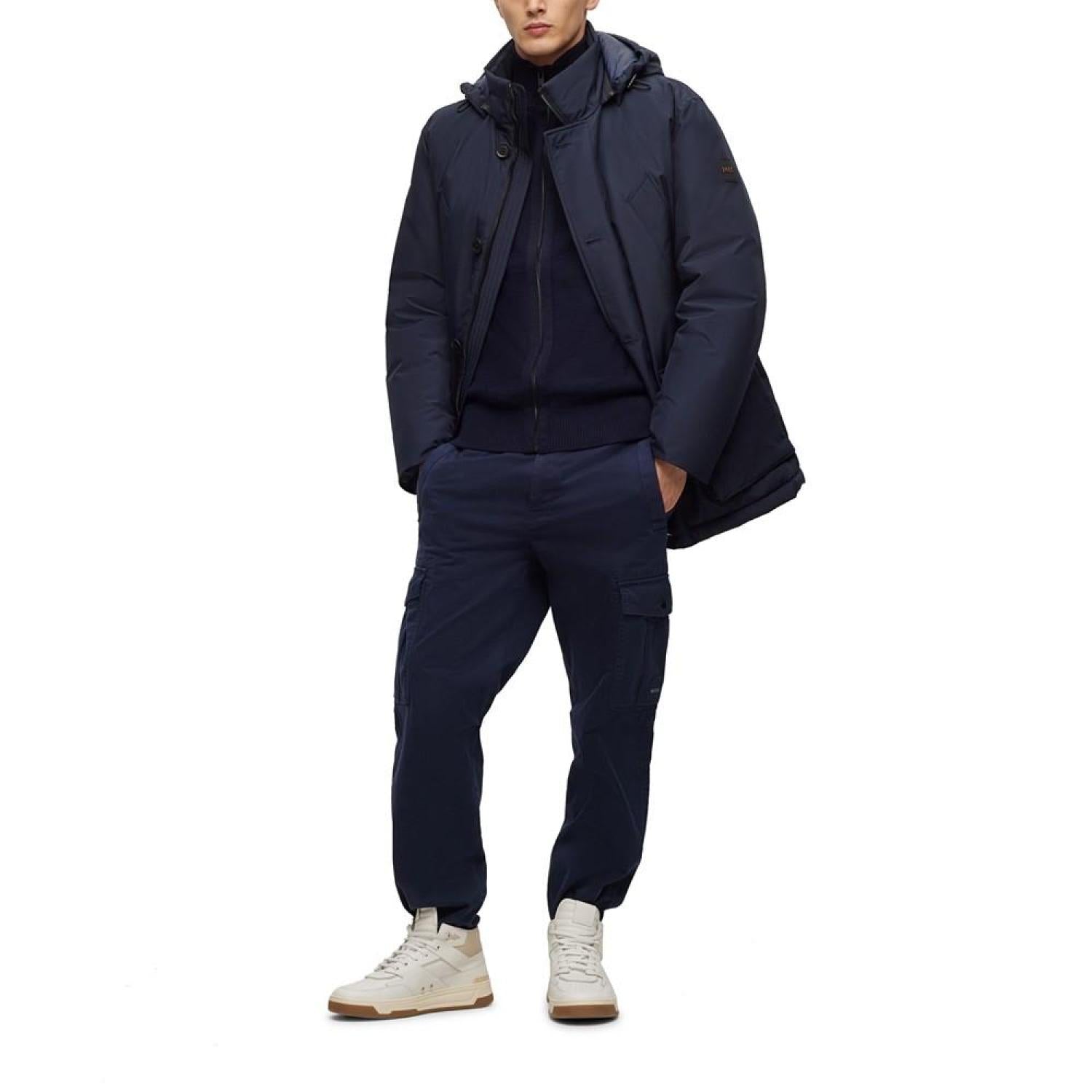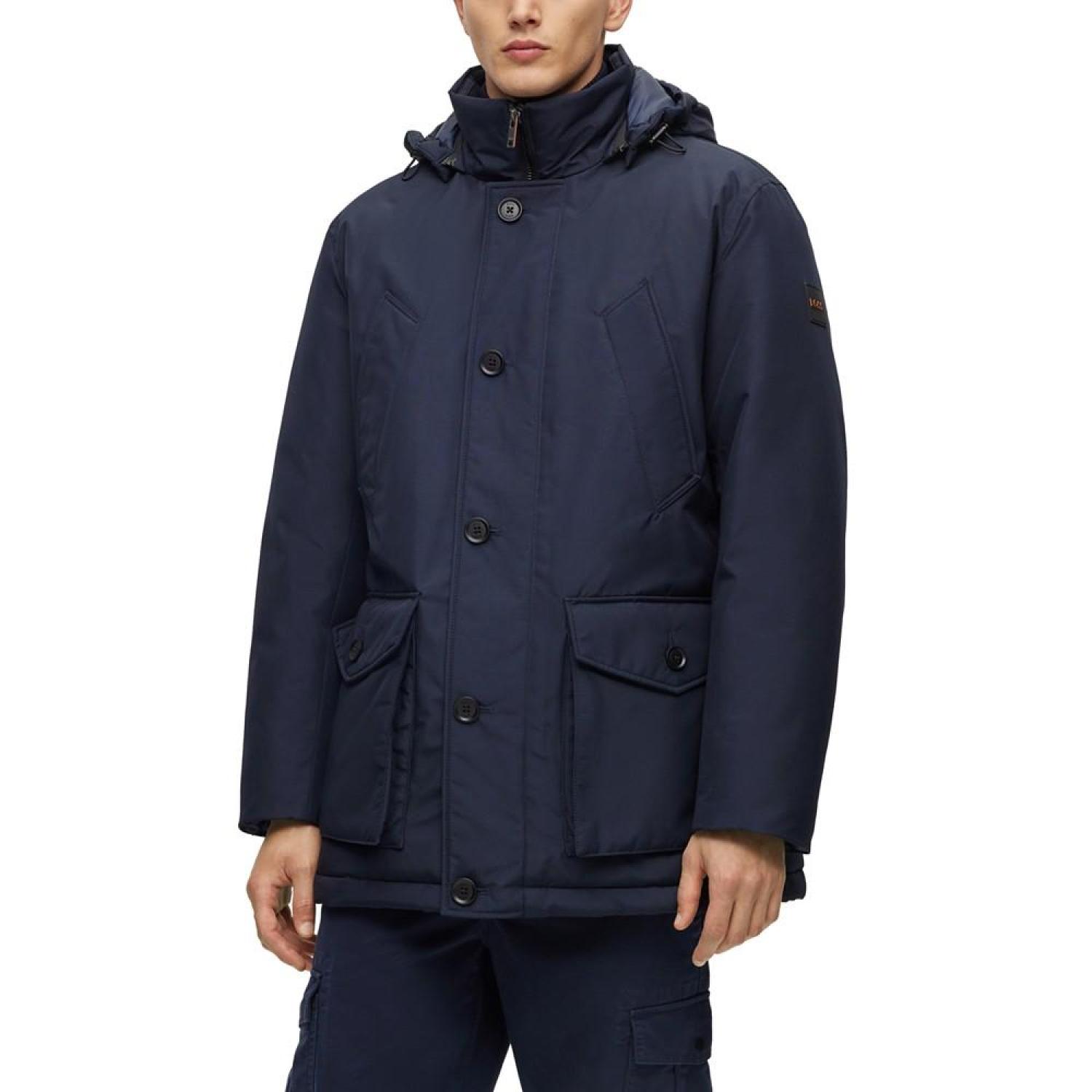A hooded parka cut to a relaxed fit in water-repellent micro-textured material with logo trims and cozy pockets by BOSS Menswear.