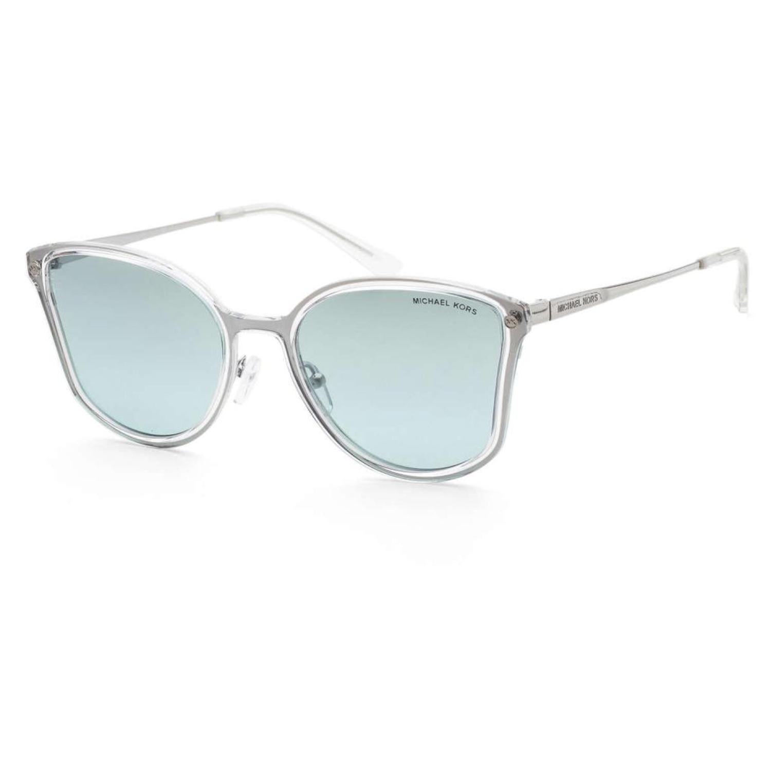 The Michael Kors women's Sunglasses measure at 56 mm lens width, 19 mm bridge width and 145 mm arm length. The frame is butterfly-shaped silver metal and the lenses are non-polarized turquoise gradient flash with 100% UV Protection. Made in China (MK1115-11537C)