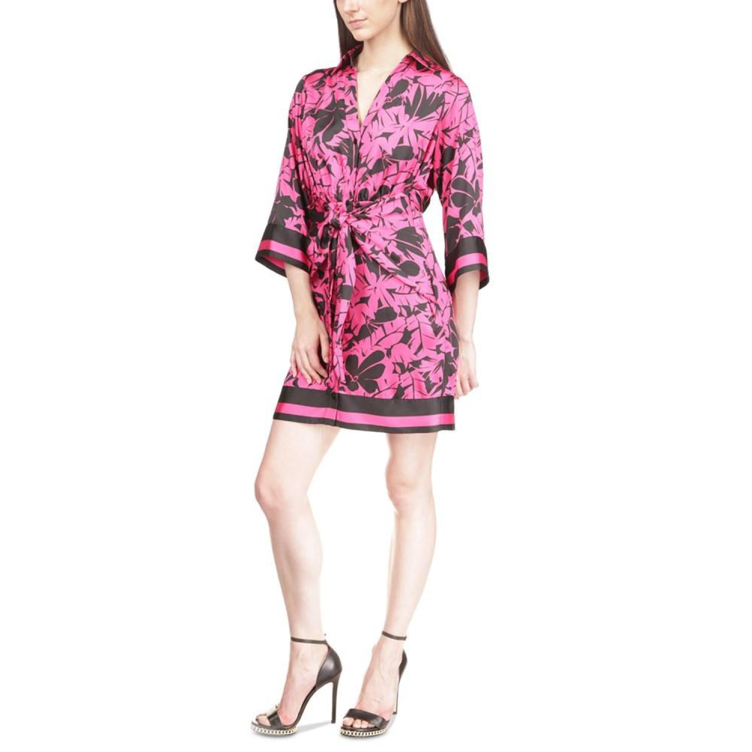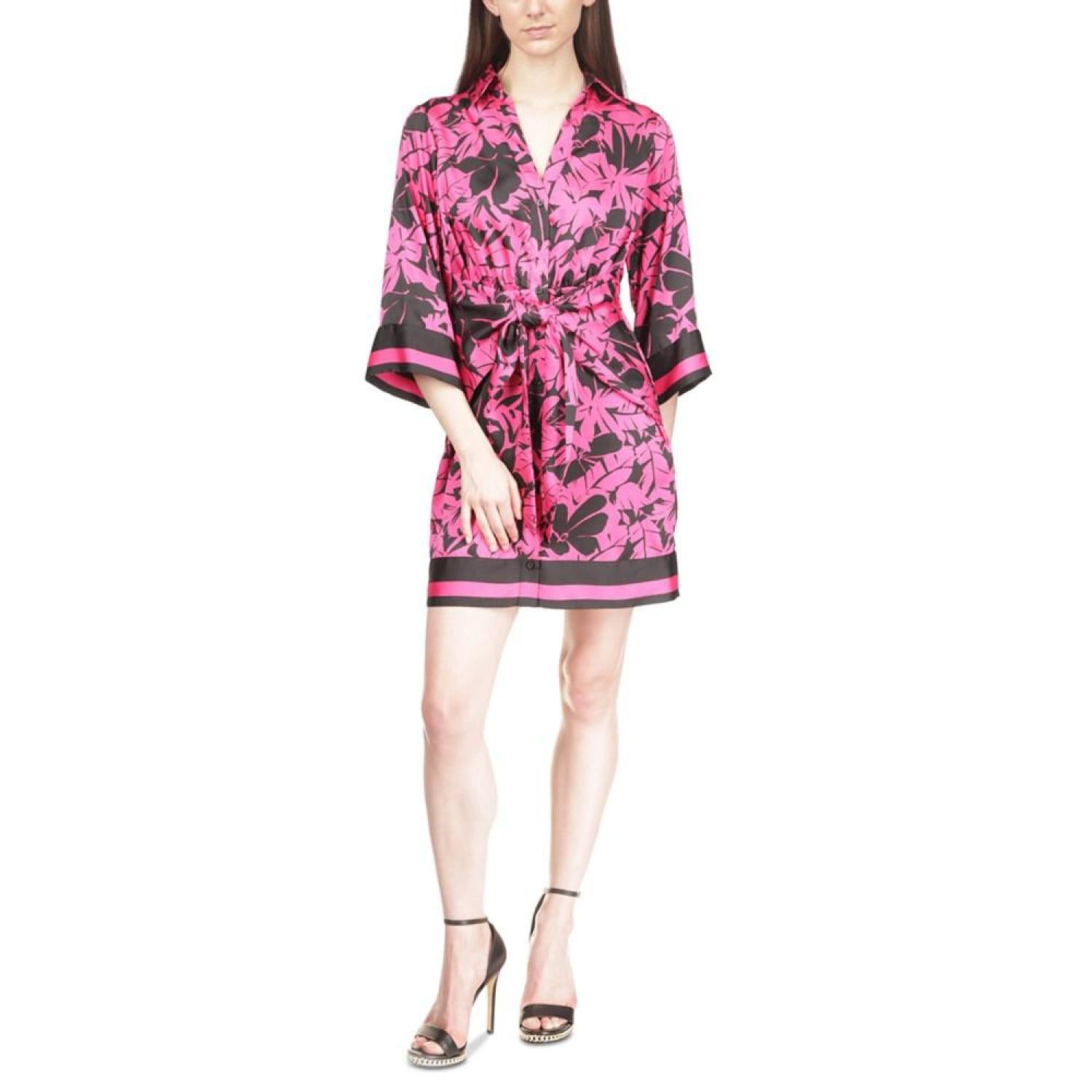 • A flawless print adorns this satin-feel shirtdress by Michael Kors, the perfect dress for comfort and decadent style.
