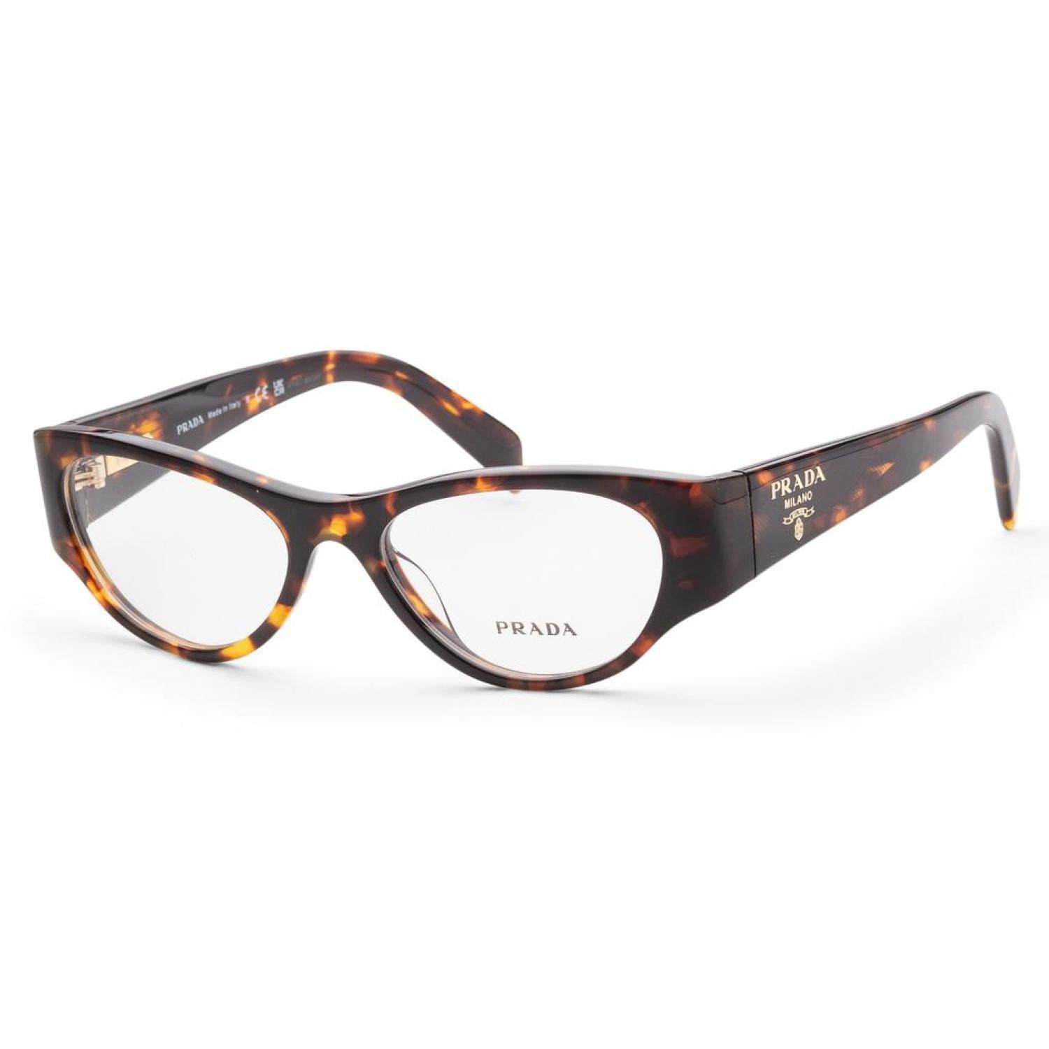 The Prada women's Opticals measure at 52 mm lens width, 17 mm bridge width, and 130 mm arm length. The frame is butterfly-shaped honey tortoise acetate. Made in Italy (PR-06ZV-VAU1O1)