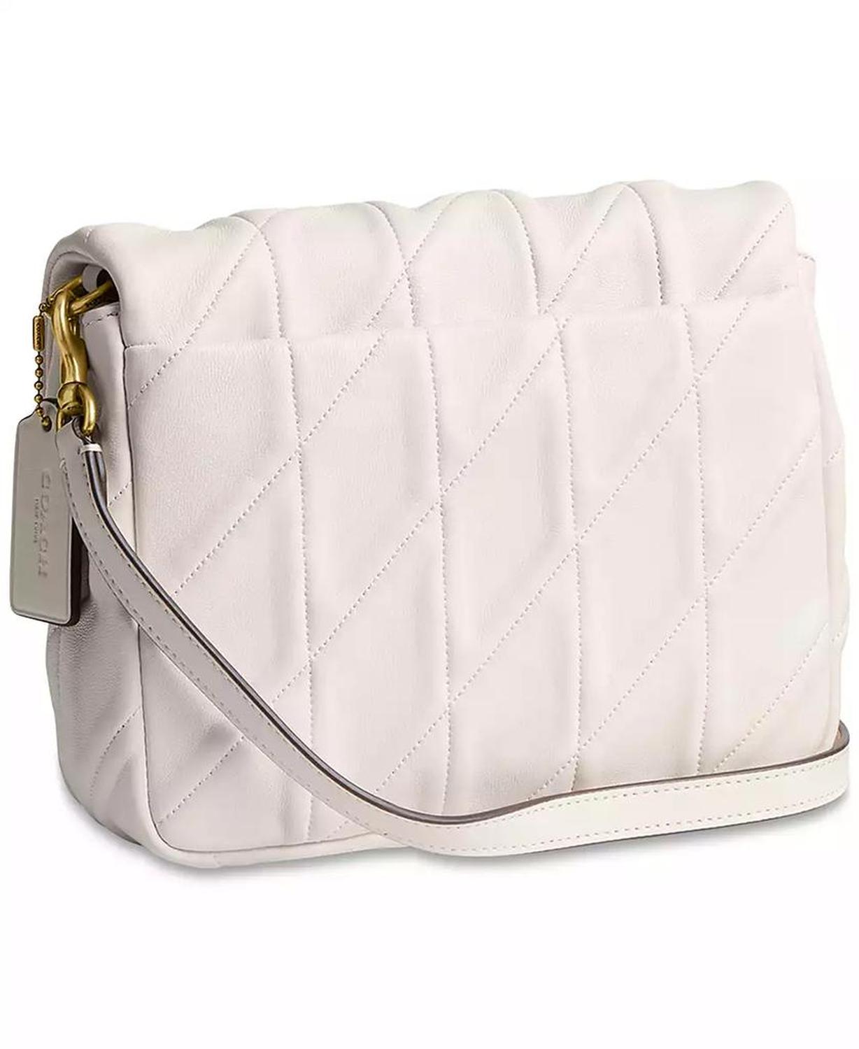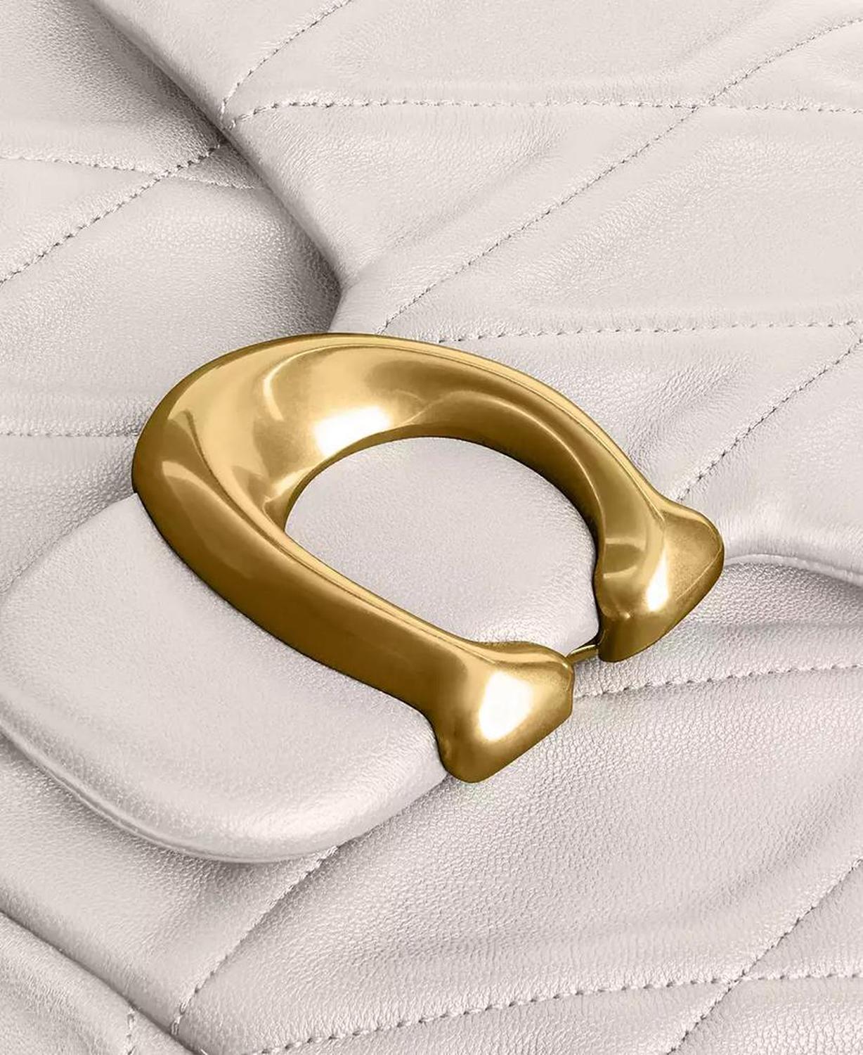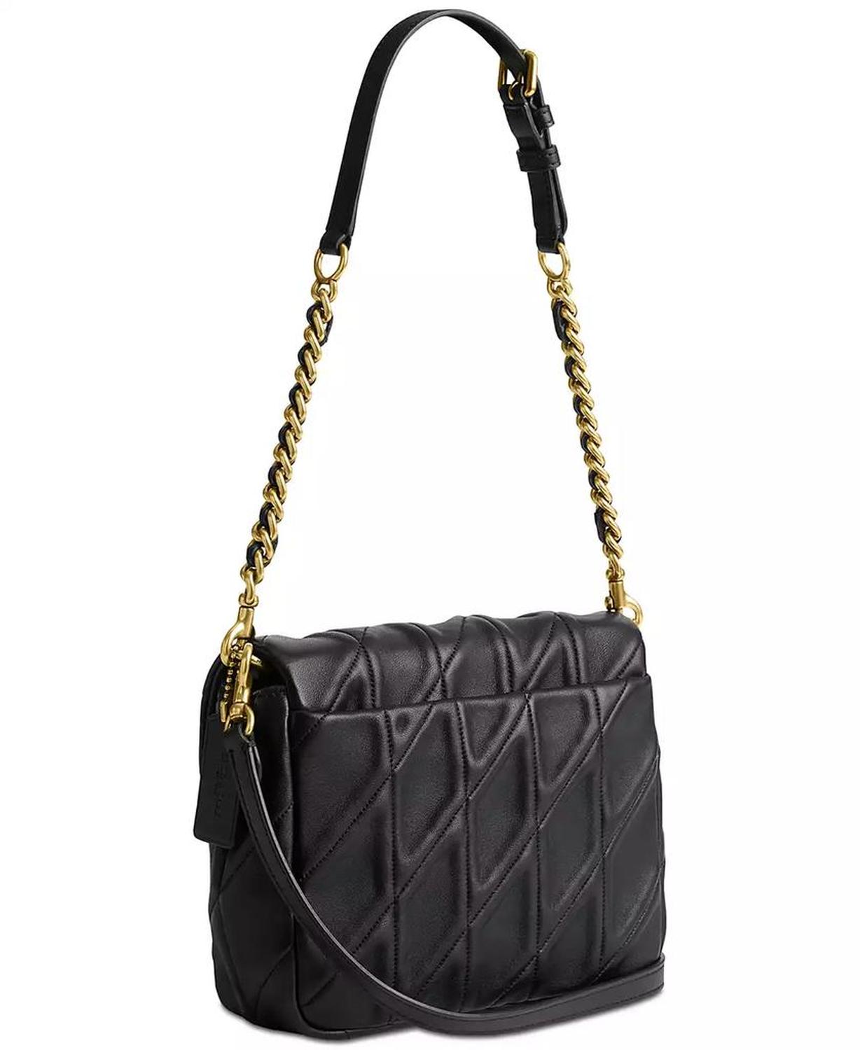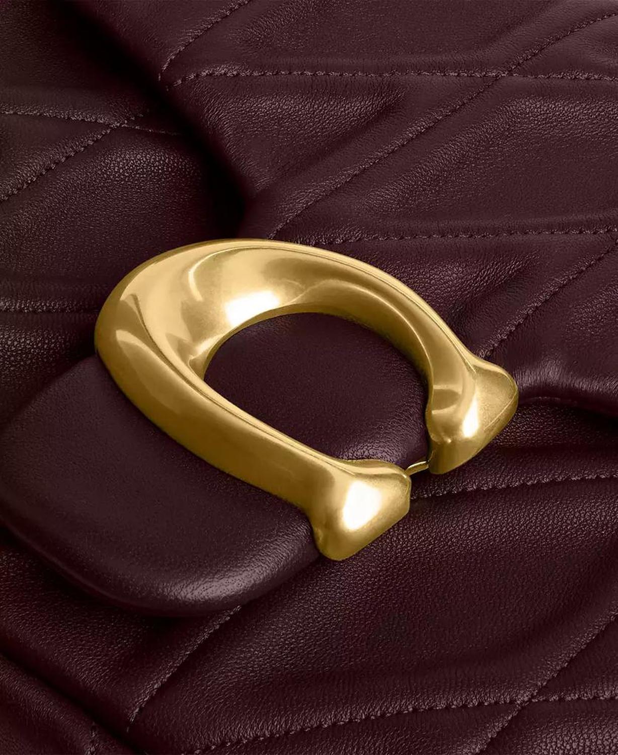 Super chic with quilted leather and gold-tone accents, this shoulder bag by COACH is a real showstopper. Mini sized bag; 7-3/4"W x 6-3/4"H x 2-1/2"D (width is measured across the bottom of handbag) Silhouette is based off 5'9" model 10-1/2"L removable short strap; 21-1/2"L removable long strap Snap closure Gold-tone hardware & logo; exterior back snap pocket; interior zip & multifunction pockets Leather Professional leather clean Imported