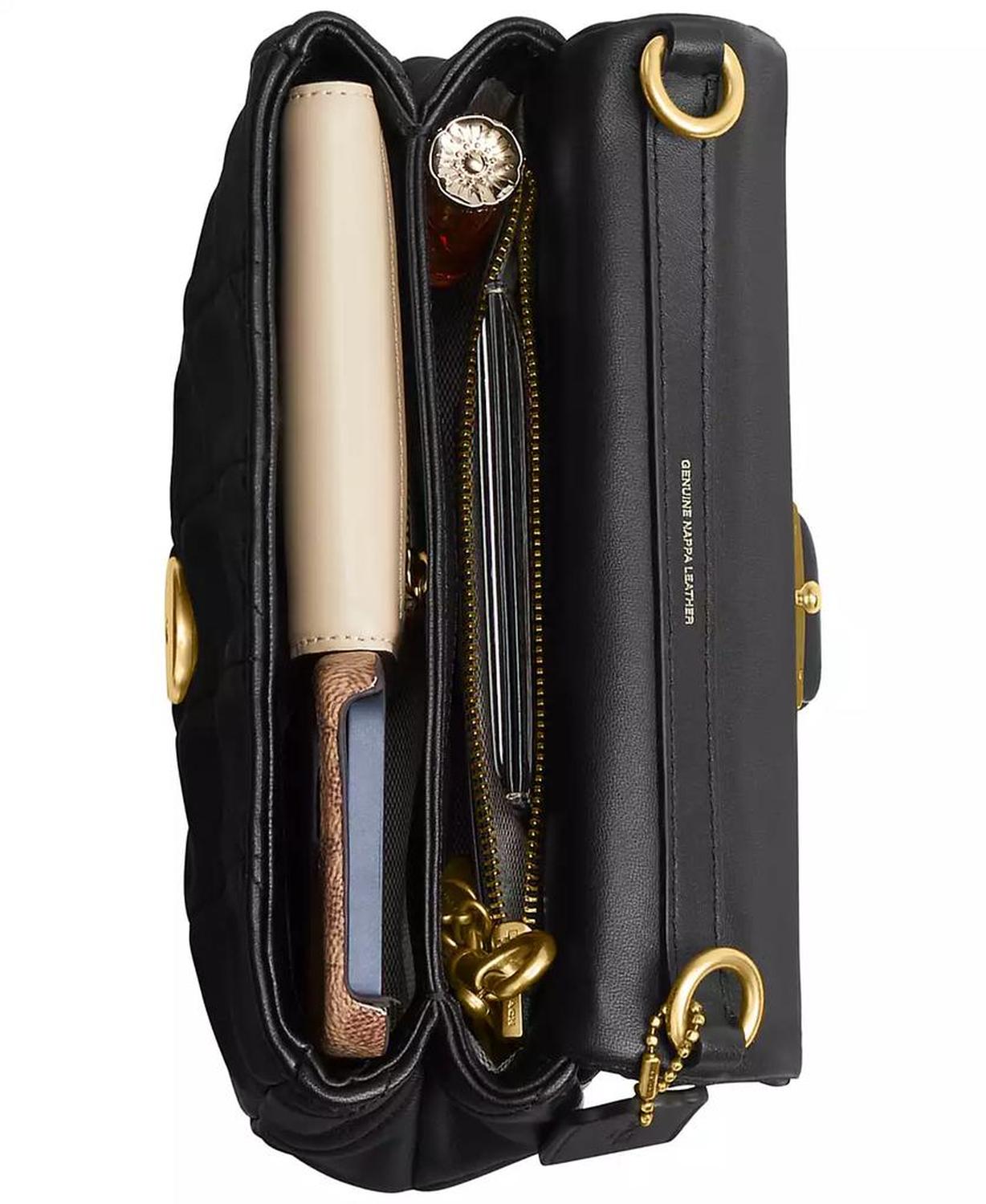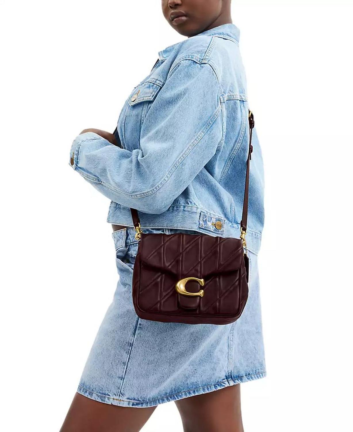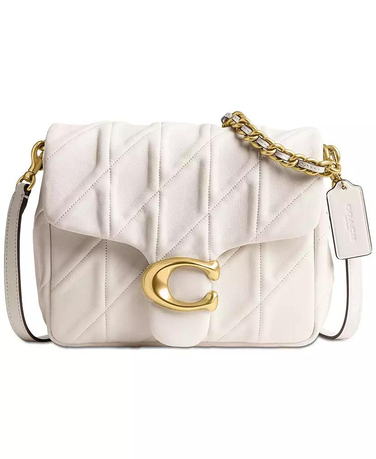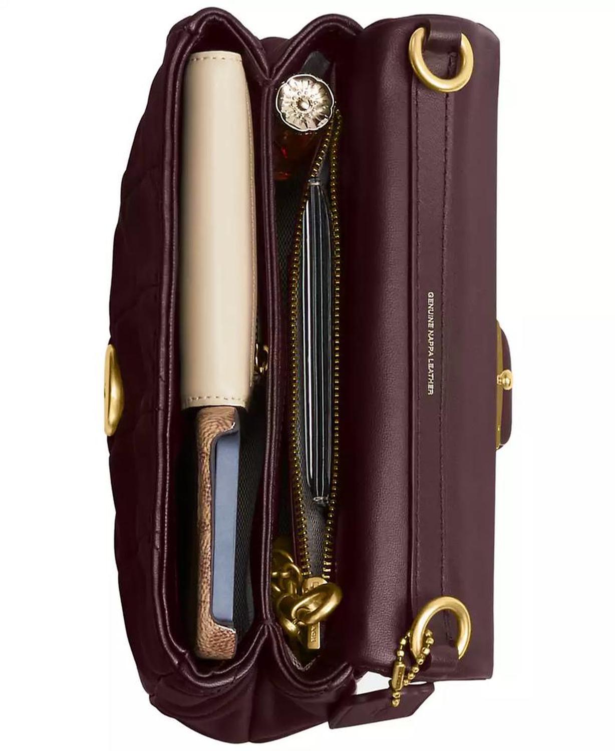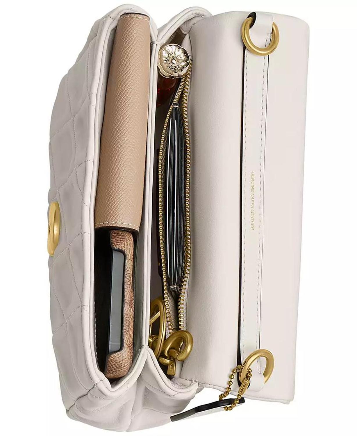 Super chic with quilted leather and gold-tone accents, this shoulder bag by COACH is a real showstopper. Mini sized bag; 7-3/4"W x 6-3/4"H x 2-1/2"D (width is measured across the bottom of handbag) Silhouette is based off 5'9" model 10-1/2"L removable short strap; 21-1/2"L removable long strap Snap closure Gold-tone hardware & logo; exterior back snap pocket; interior zip & multifunction pockets Leather Professional leather clean Imported