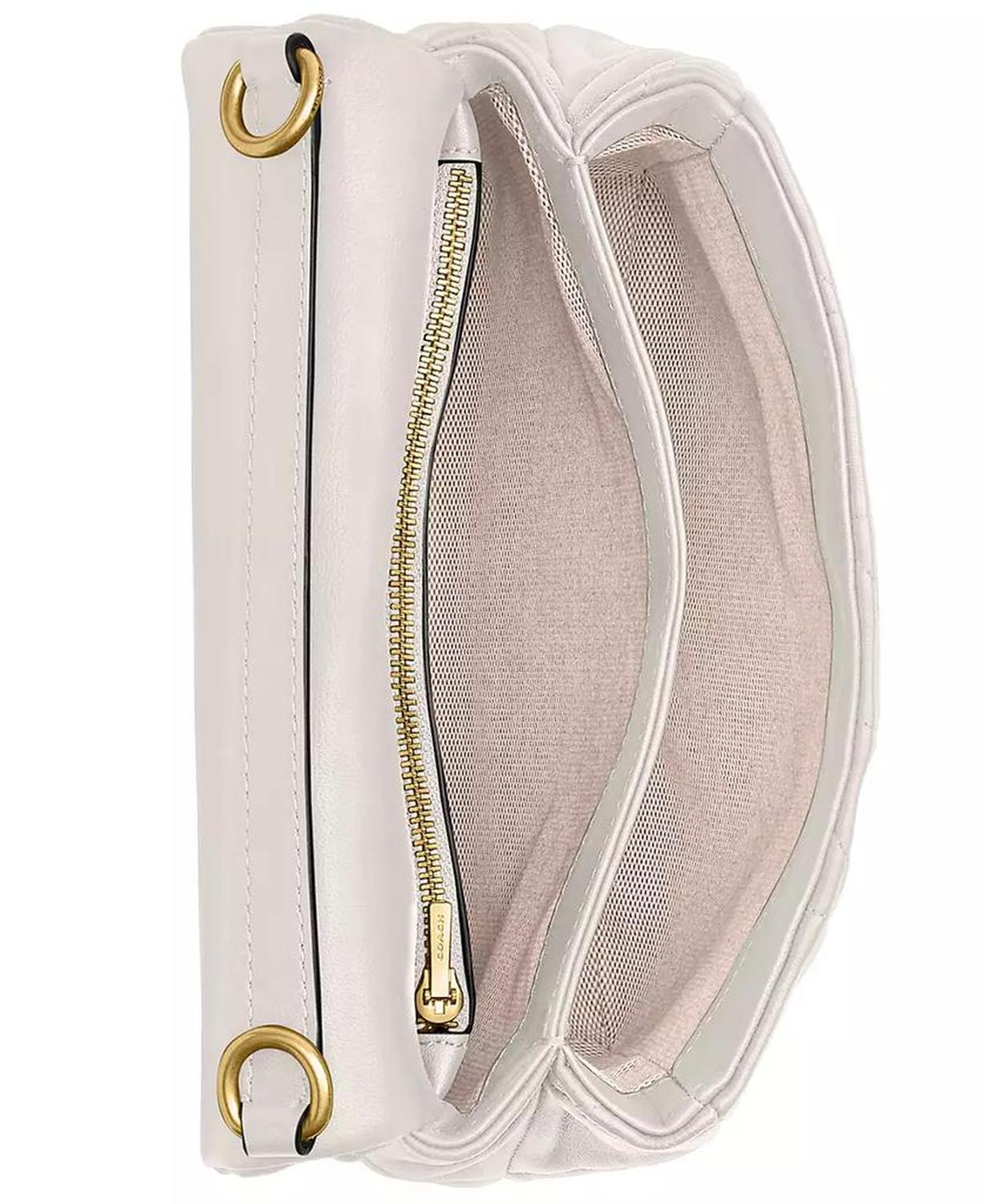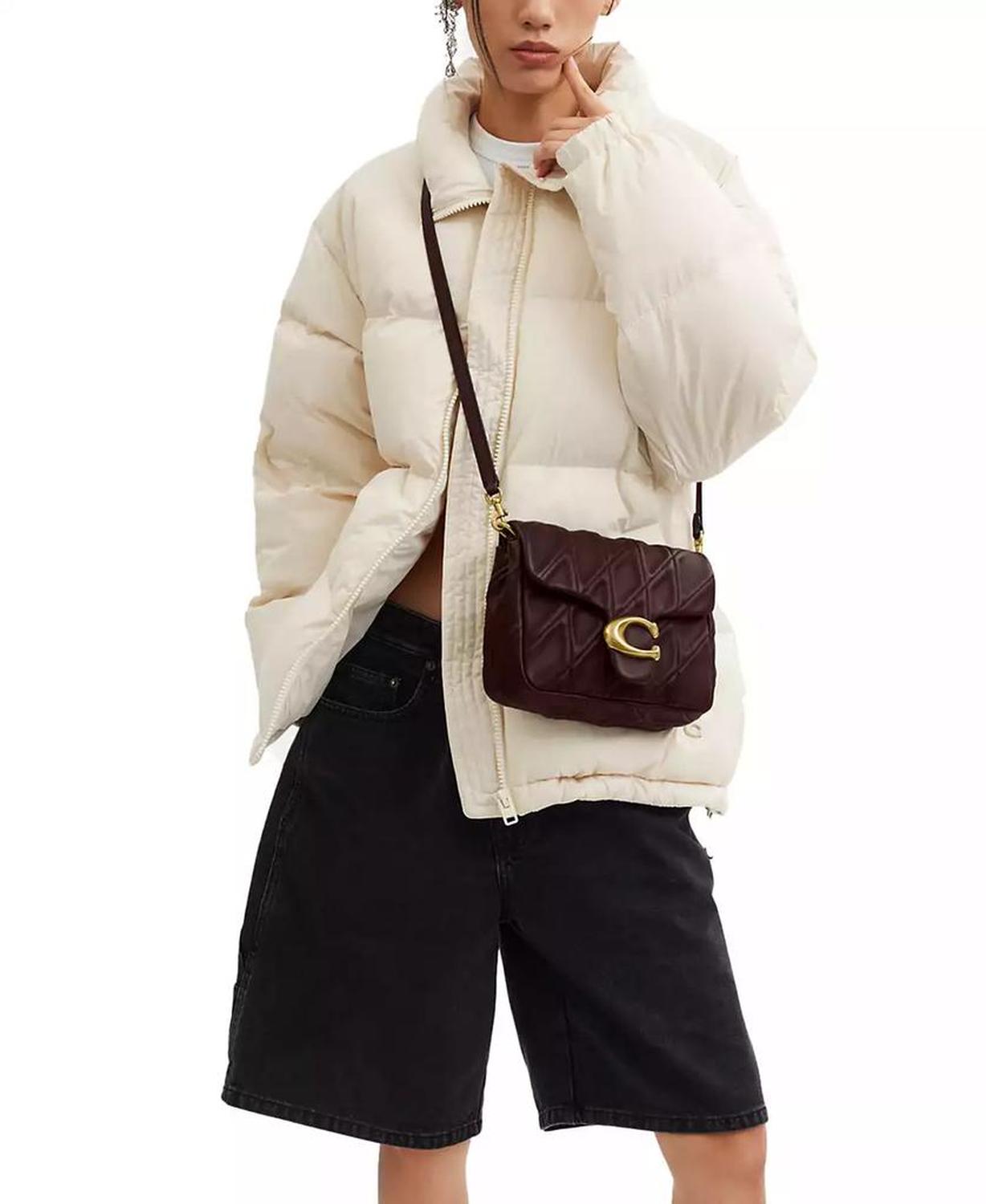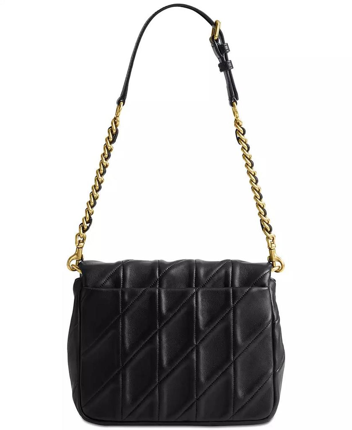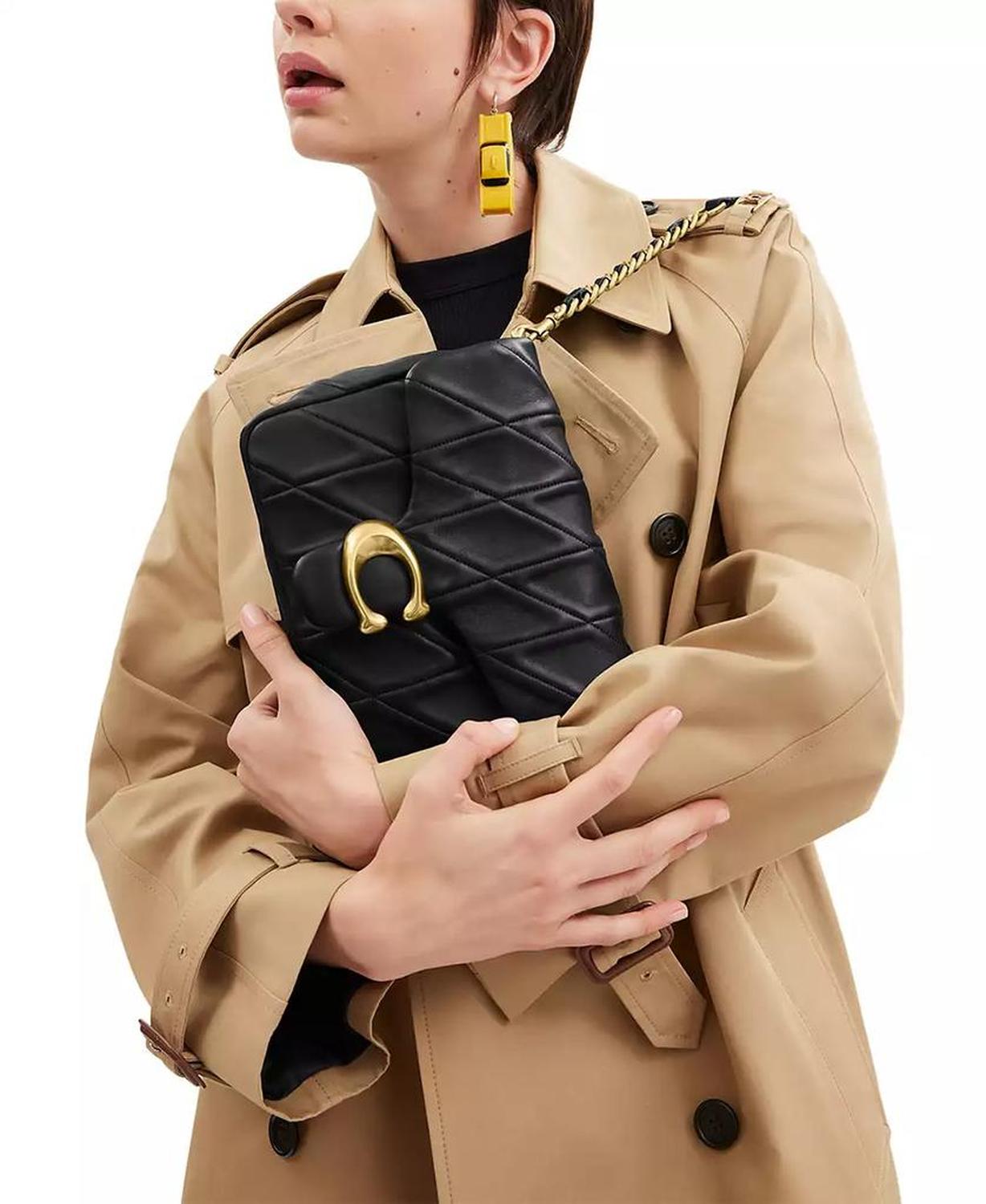 Super chic with quilted leather and gold-tone accents, this shoulder bag by COACH is a real showstopper. Mini sized bag; 7-3/4"W x 6-3/4"H x 2-1/2"D (width is measured across the bottom of handbag) Silhouette is based off 5'9" model 10-1/2"L removable short strap; 21-1/2"L removable long strap Snap closure Gold-tone hardware & logo; exterior back snap pocket; interior zip & multifunction pockets Leather Professional leather clean Imported