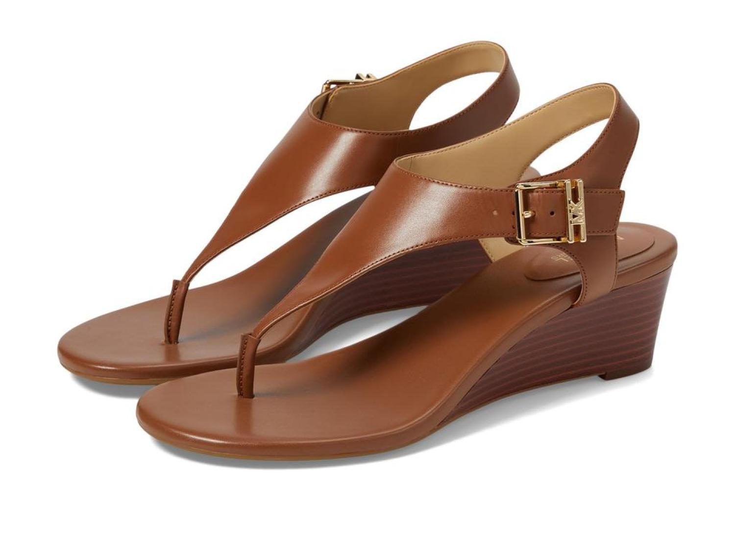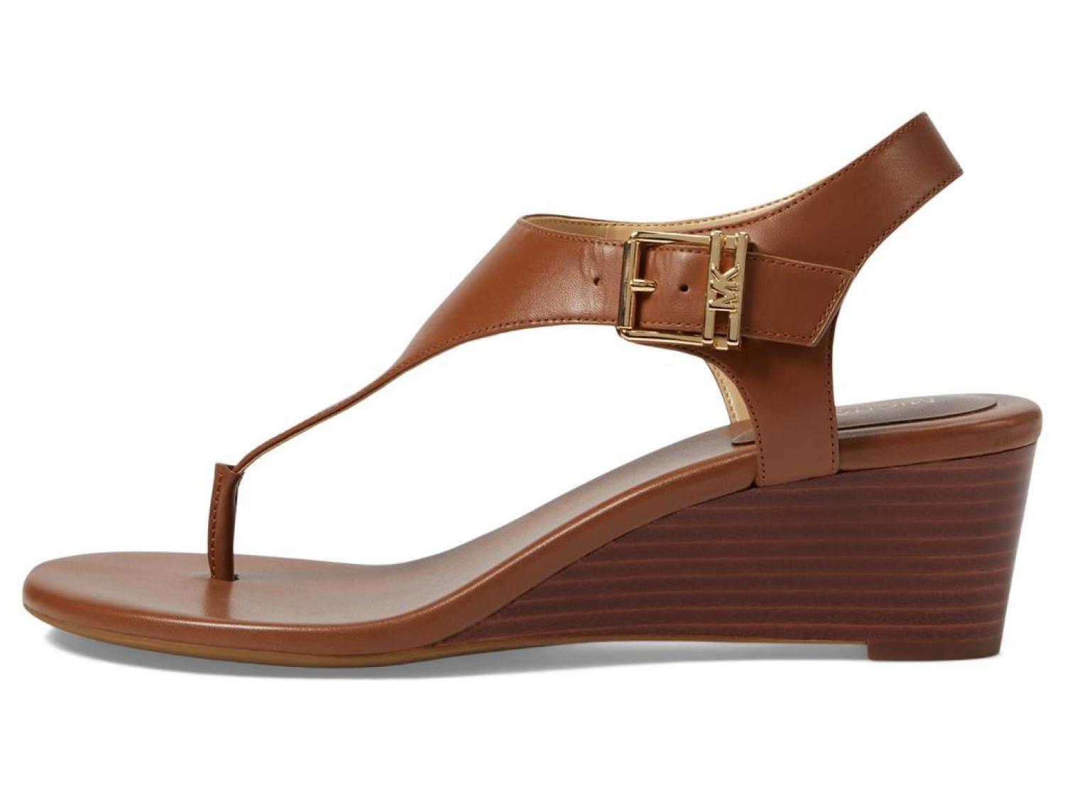 Style your look beyond basics wearing the classic MICHAEL Michael Kors® Robyn Flex Wedge Sandals. The toe-post thong features leather construction with wedge heels and buckled ankle strap closure. Faux leather lining and lightly padded synthetic insole. Open almond toe silhouette. Rubber outsole. Imported. Product measurements were taken using size 7, width M. Please note that measurements may vary by size. Measurements: Heel Height: 2 in Weight: 7.5839 oz-