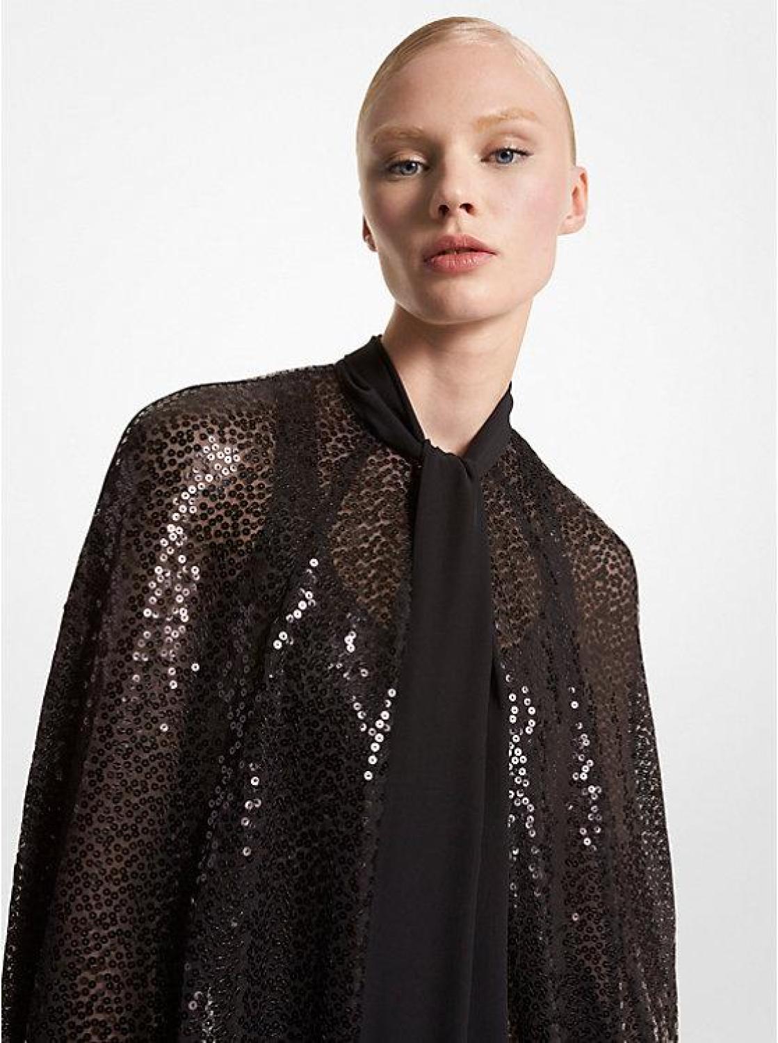 • Semi-sheer chiffon dotted with thousands of sequins gives this cape a liquid look. Fastened at the neckline with a fringed scarf tie, this opulent style closed our Fall/Winter 2023 runway show. Team it with a bodysuit and trousers for a new take on evening wear. Made in Italy.
