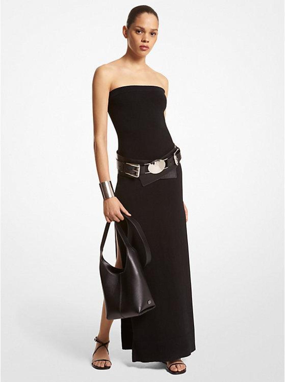• No well-balanced wardrobe is complete without a versatile black dress. Enter this sleek stretch cashmere number—complete with a collarbone-accentuating bandeau neckline and side slit for ease of movement, it’s a timeless staple we love with a low-slung statement belt and strappy flats.
