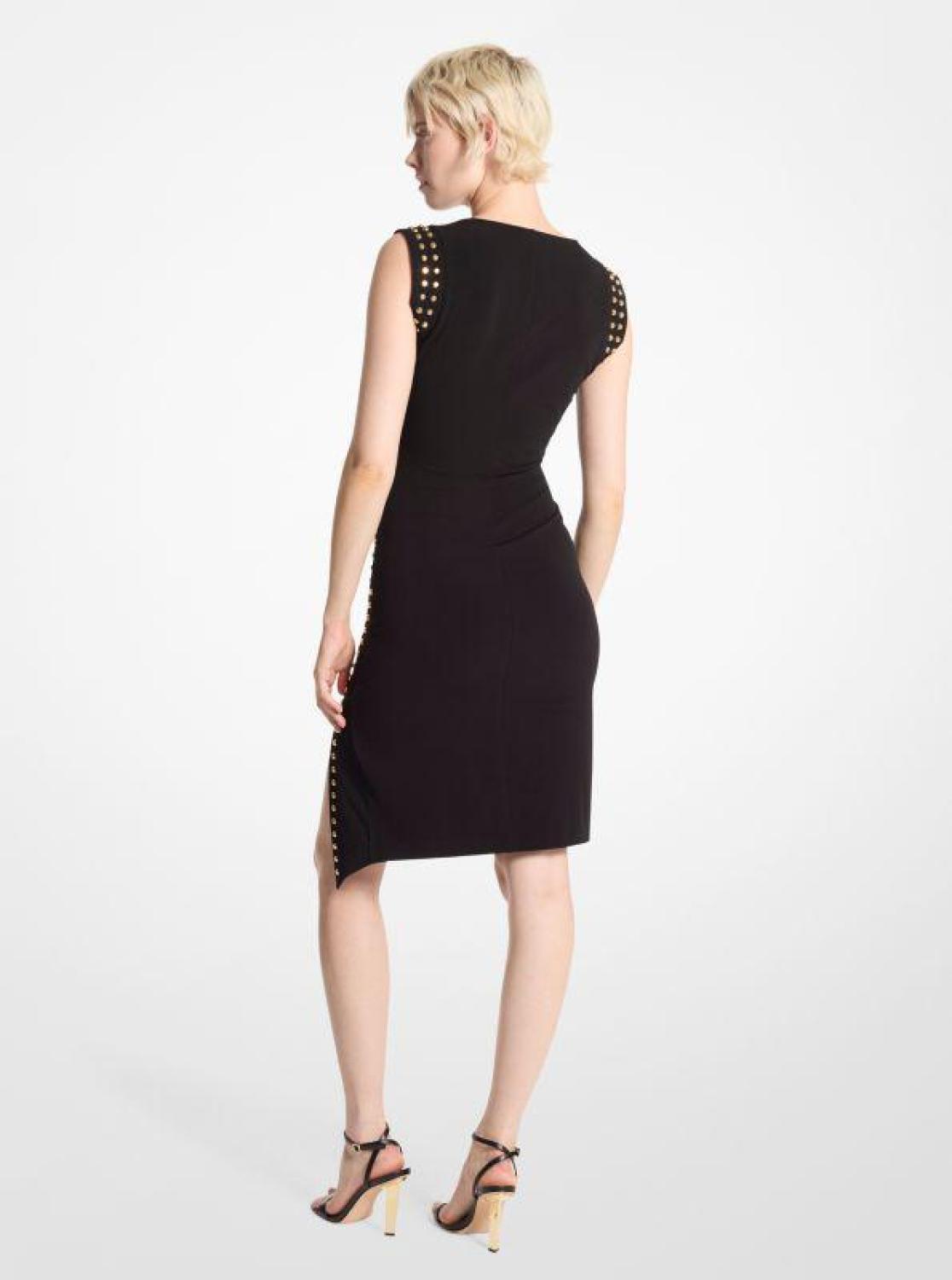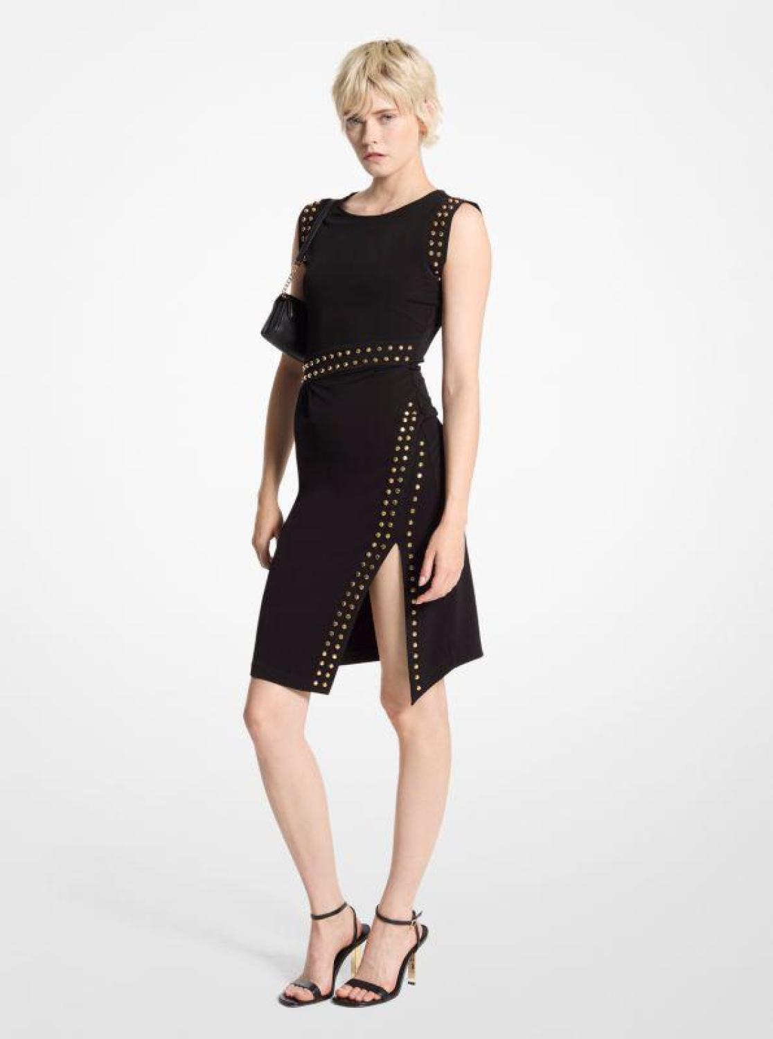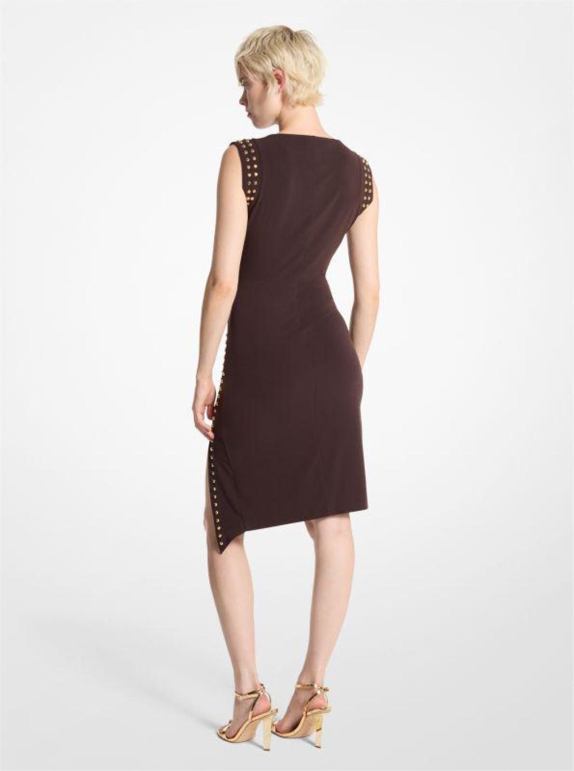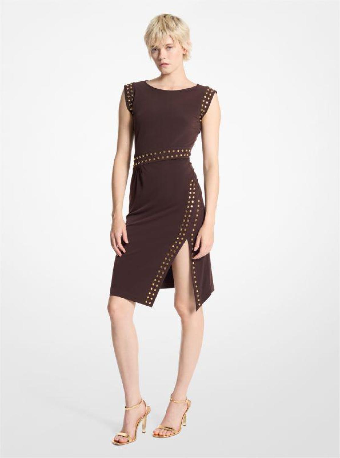 • This dress amps up the glamour with shimmering stud details. Cut from smooth matte jersey, this modern style falls to a knee-grazing length with an asymmetric side slit to reveal a flash of skin. Accessorize the look with stiletto heels for maximum impact.