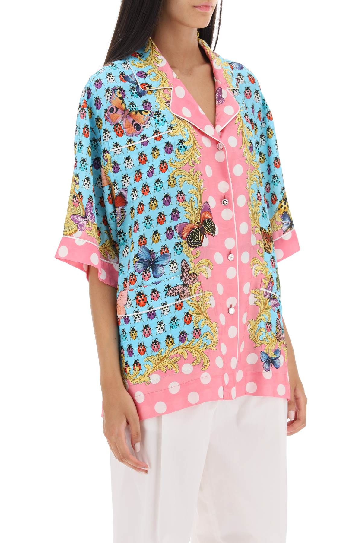 This Versace's short-sleeved shirt is made from silk-blend satin and boasts the vibrant Heritage Butterflies and Ladybugs print over a monogram jacquard base. Designed for an oversized fit, it offers a homewear-inspired style featuring lapel collar, contrast piping, and straight hemline with side vents. Three patch pockets and Medusa buttons complete the look. The model is 177 cm tall and wears a size IT 38.