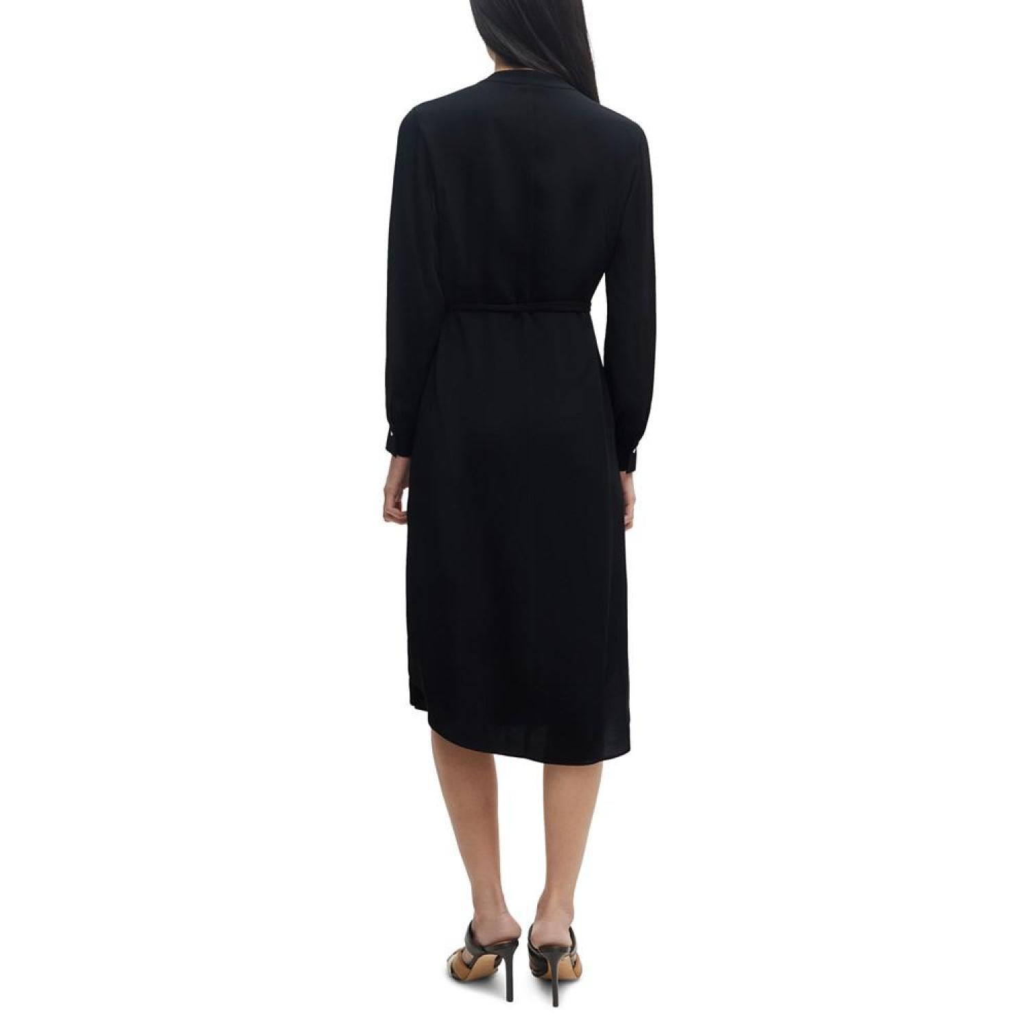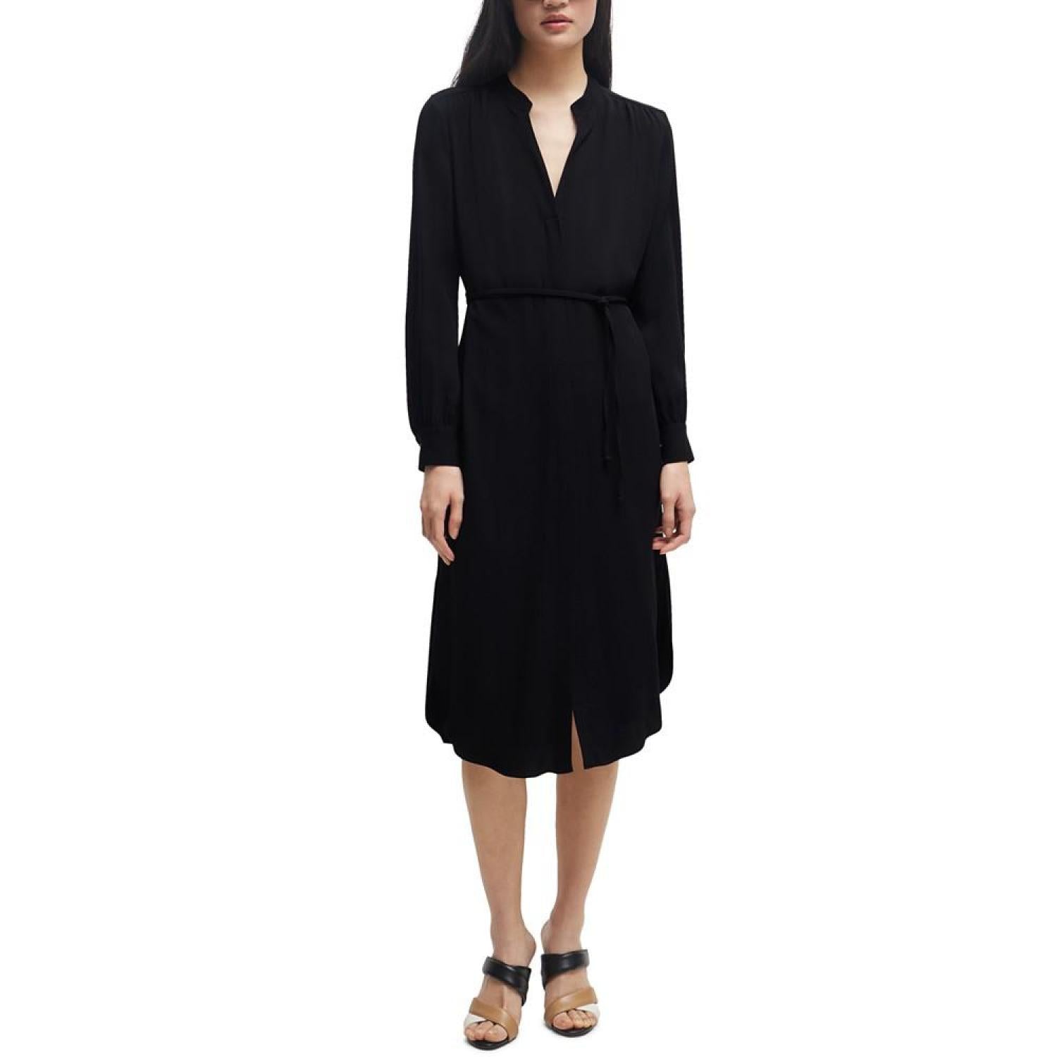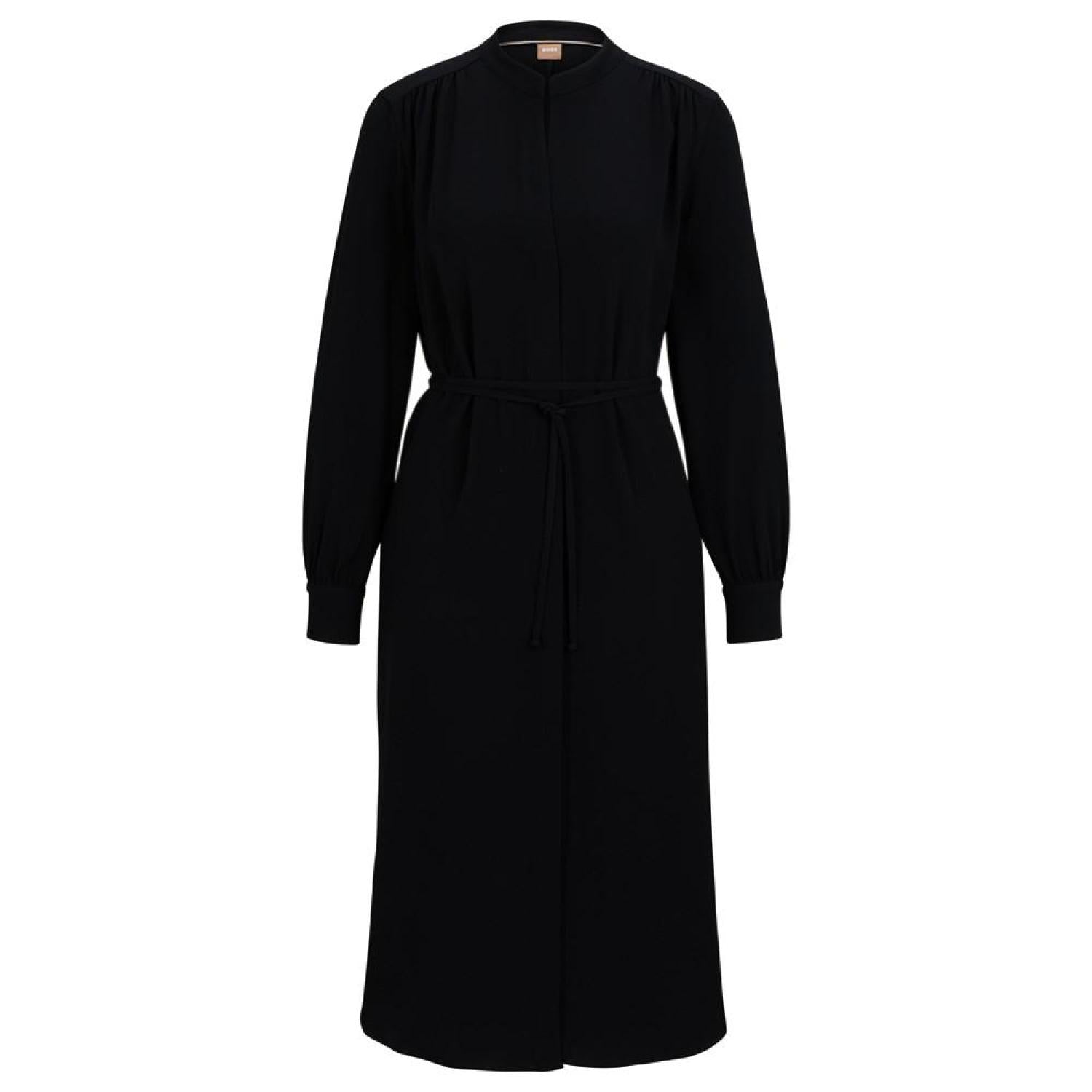 A collarless long-sleeved dress cut to a straight fit with a V neckline and flattering belt detail by BOSS Womenswear. For our Better Boss products, we always use at least 60% better raw materials. The model is a size 36 and is 5'11" tall, with a 24" waist and 35" hips. Regular fit Neckline: V-neck Fastening top: Belted closure Long sleeves Button cuffs Unlined Viscose Machine washable Imported