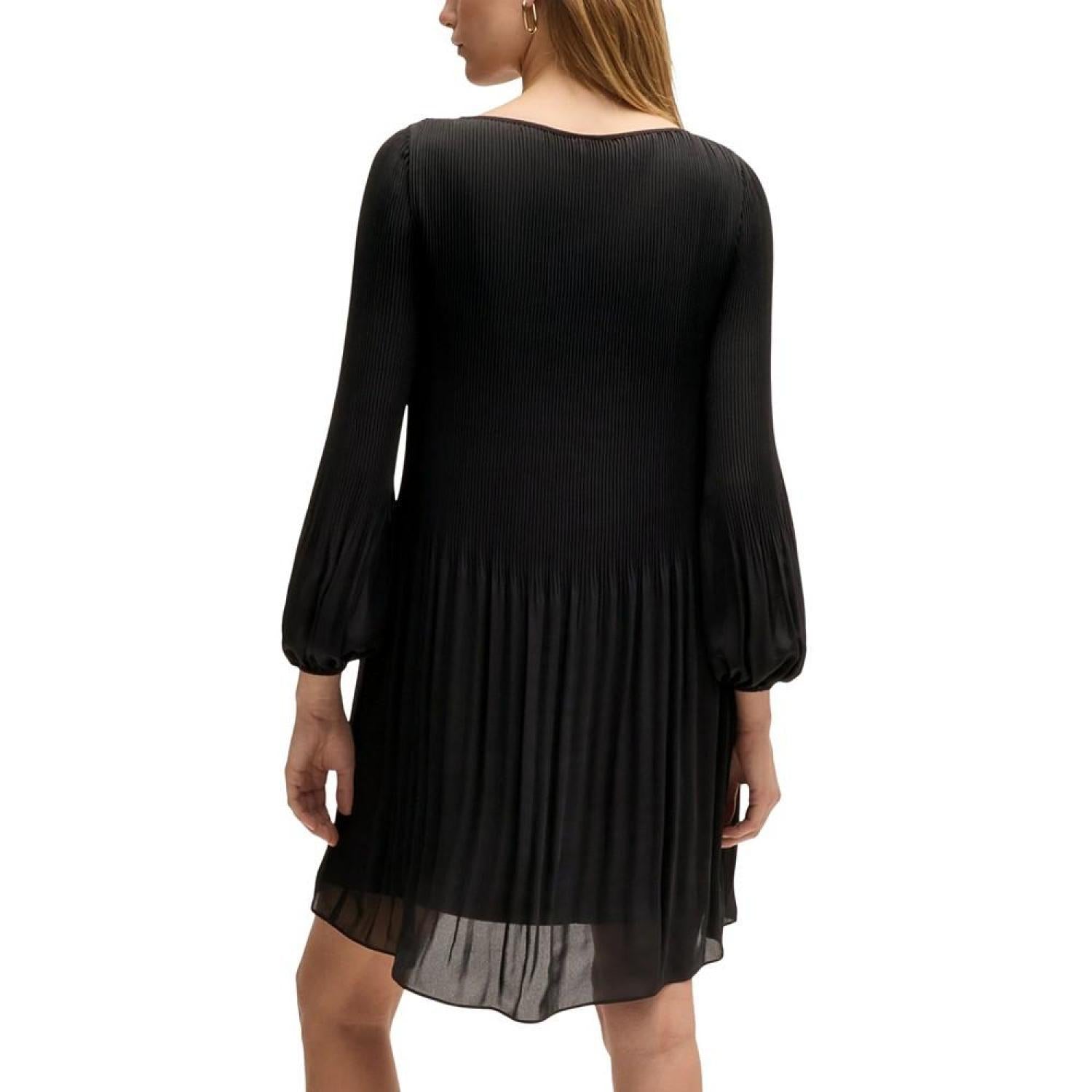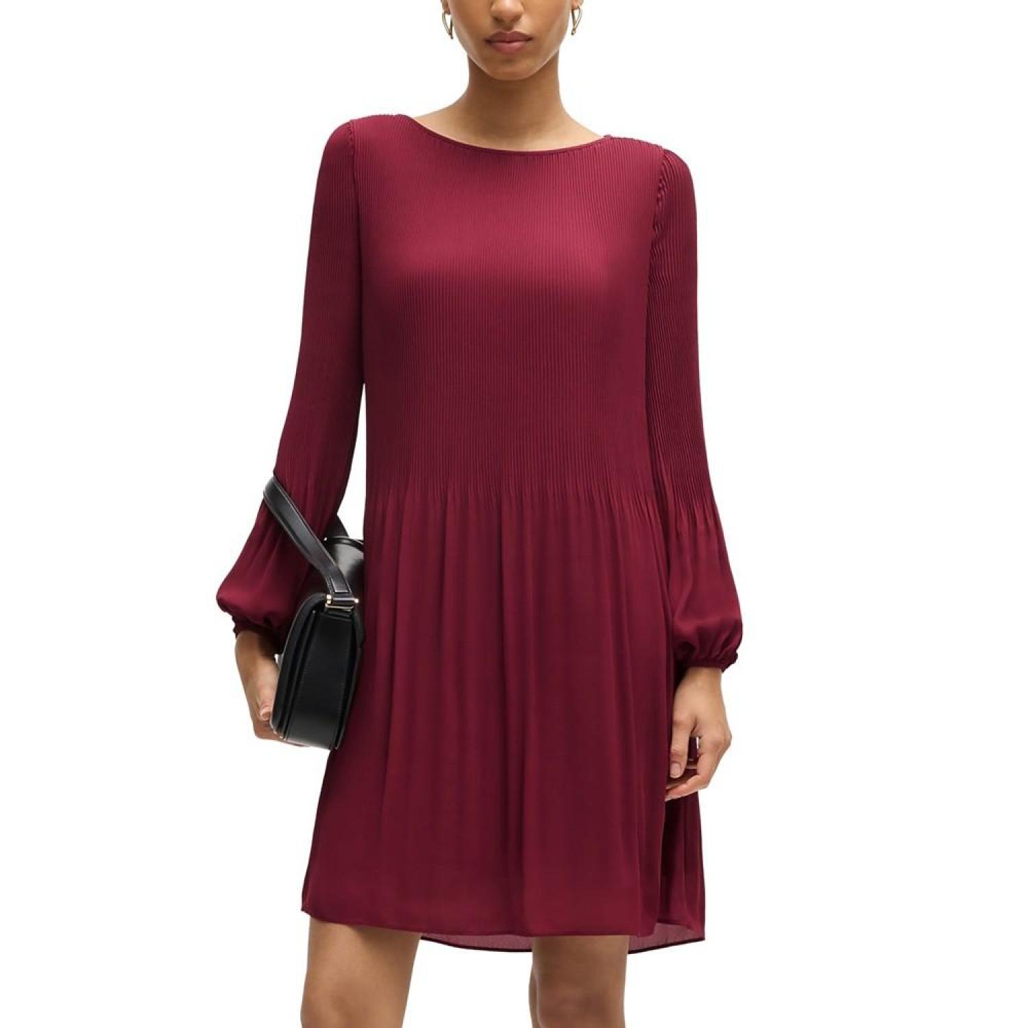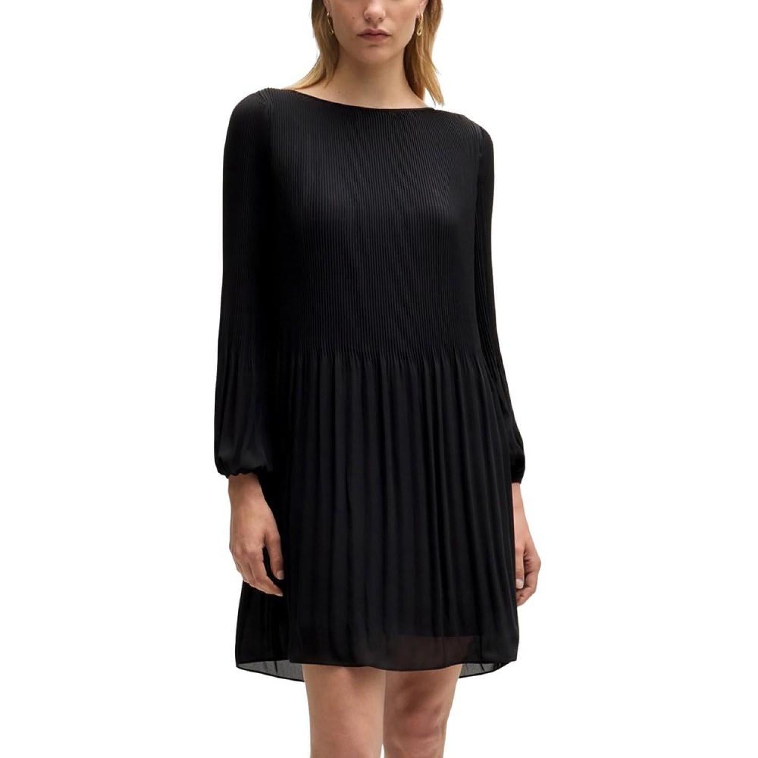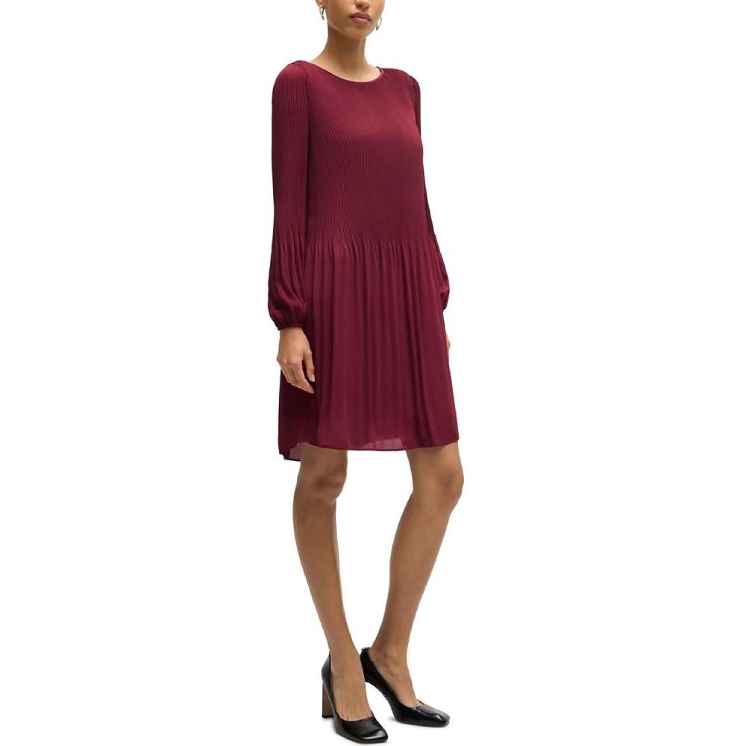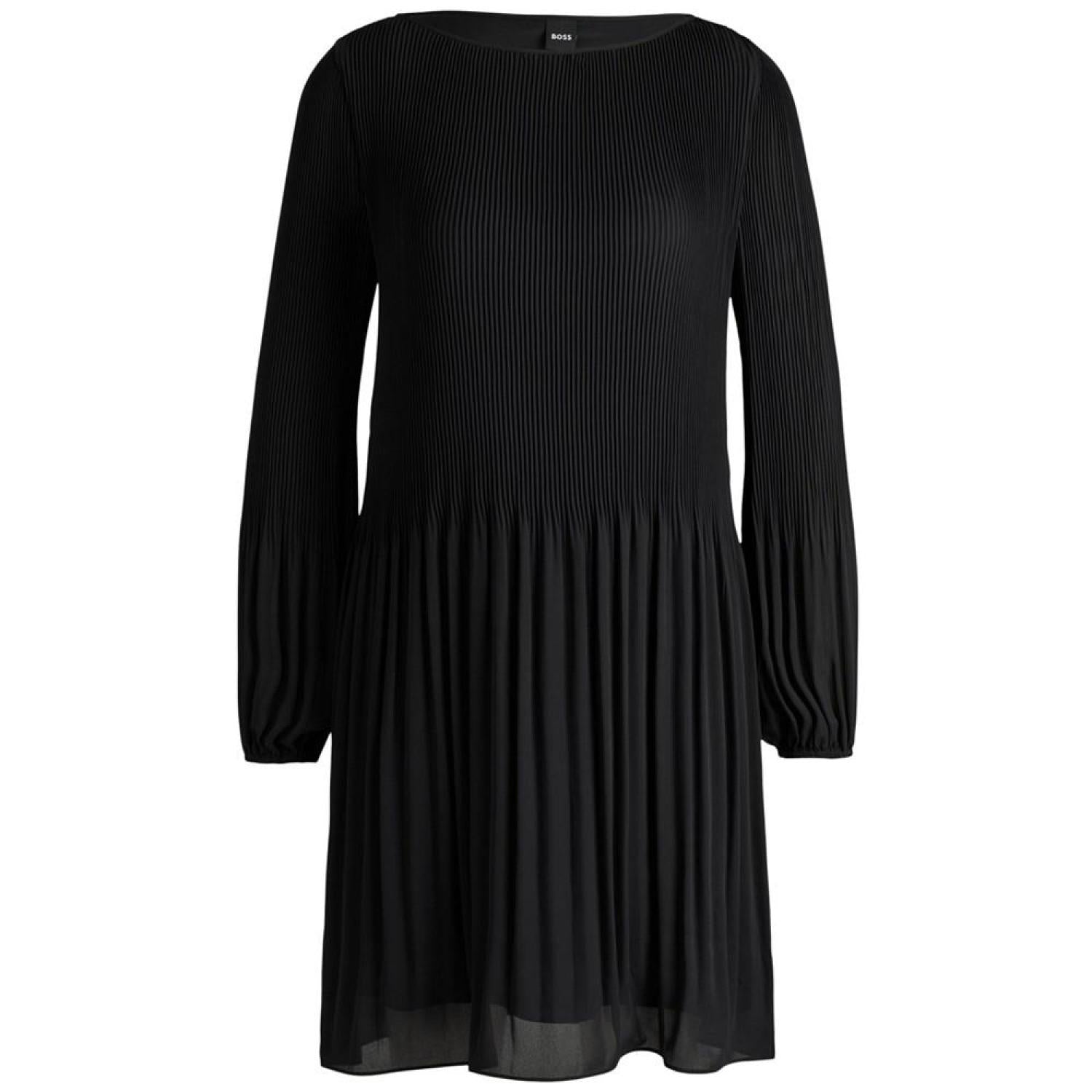 A business dress by BOSS Womenswear. This long-sleeved design is pressed with plisse pleats that disappear into the skirt part.