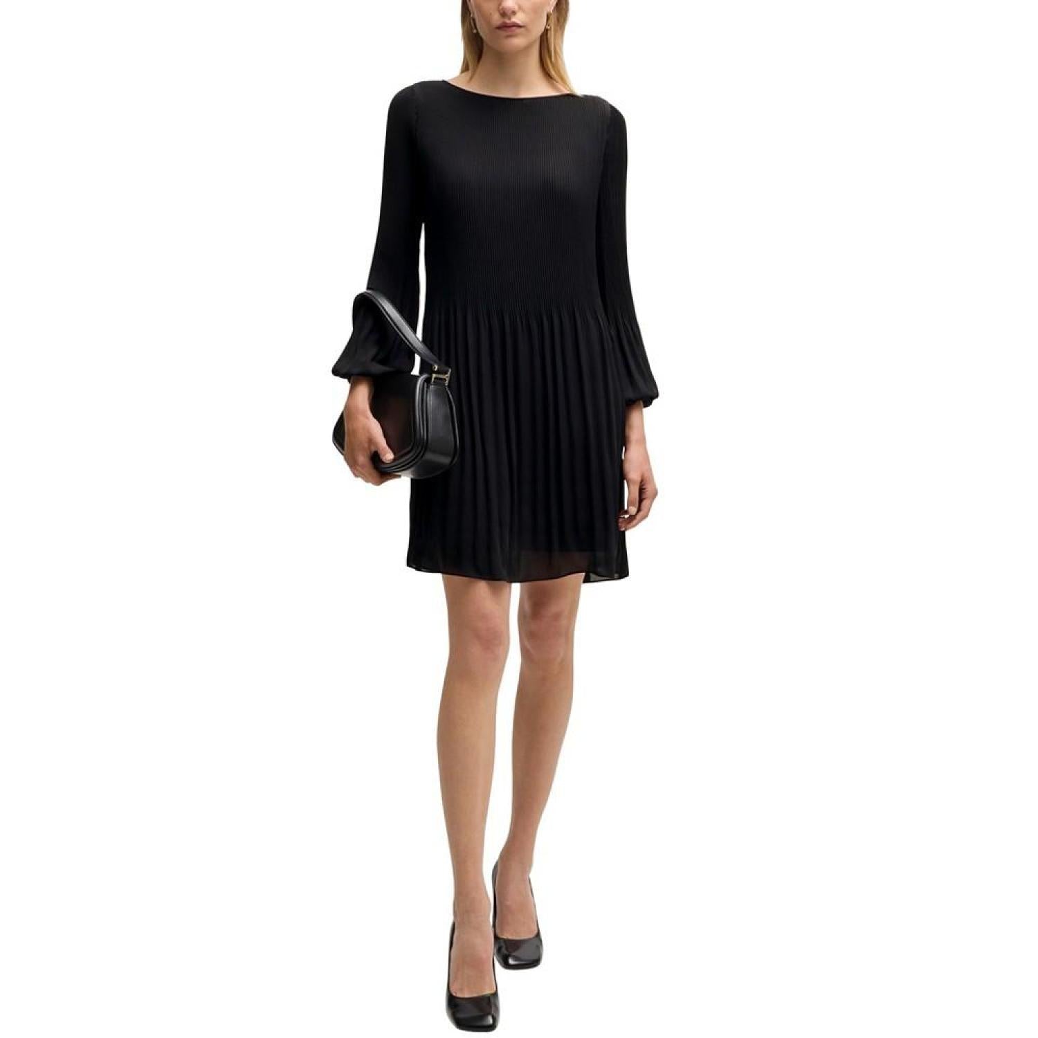 • A business dress by BOSS Womenswear. This long-sleeved design is pressed with plisse pleats that disappear into the skirt part.