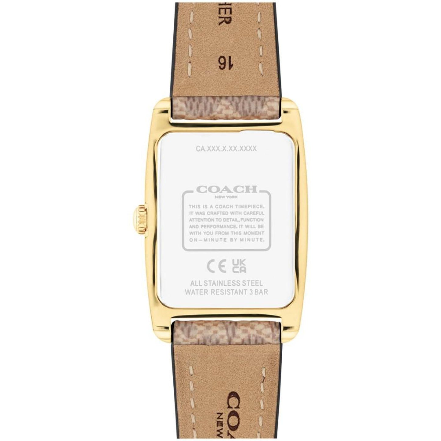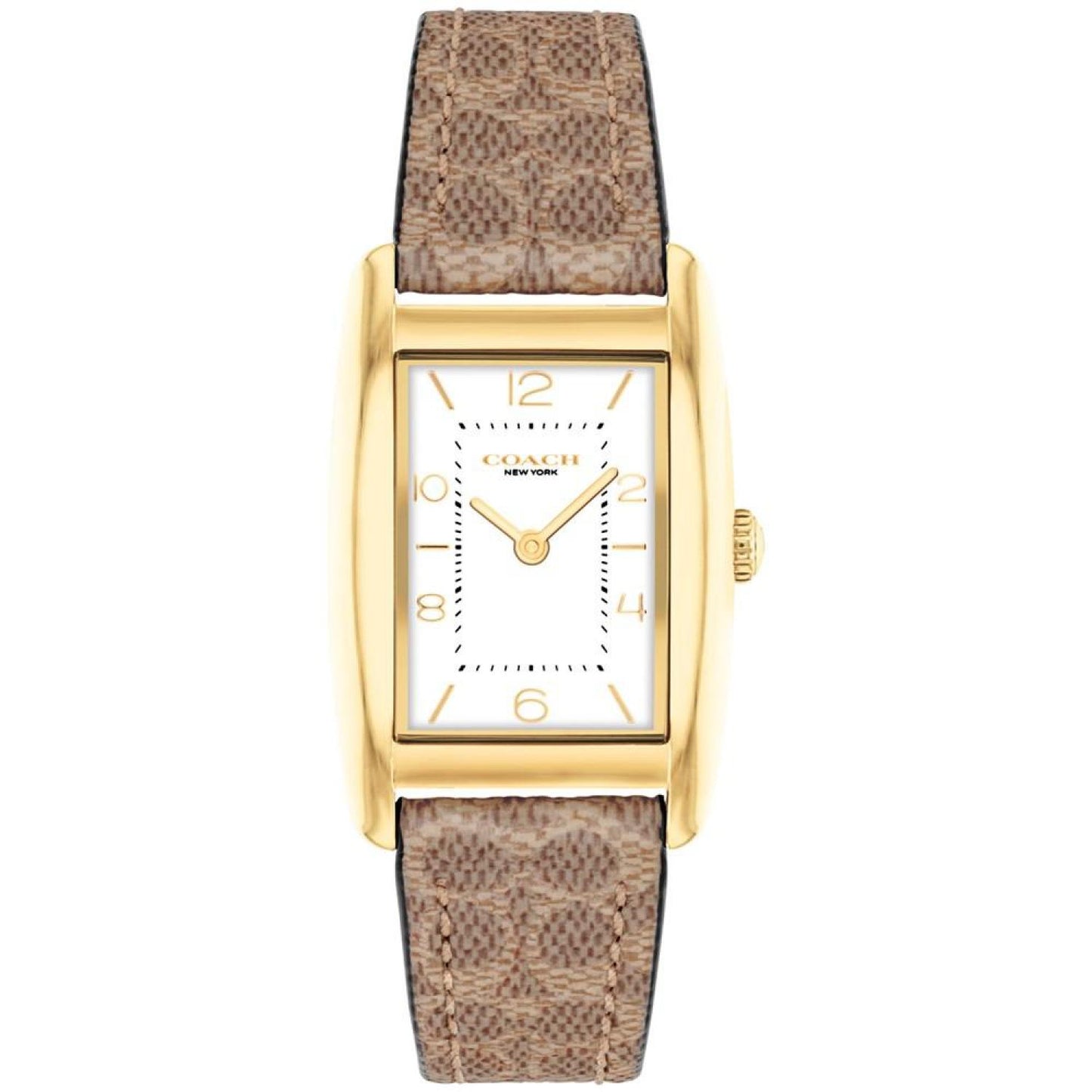 • A distinctive stately design, the minimalist Reese watch is an elevated choice for everyday. Finished with a COACH Signature canvas strap, the gold-tone design features a white dial detailed with a mix of numerical and stick markers. Style #14504355