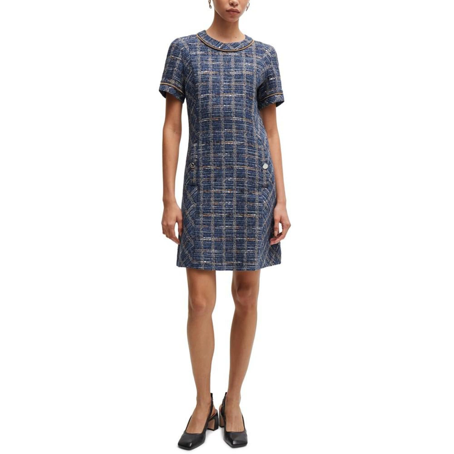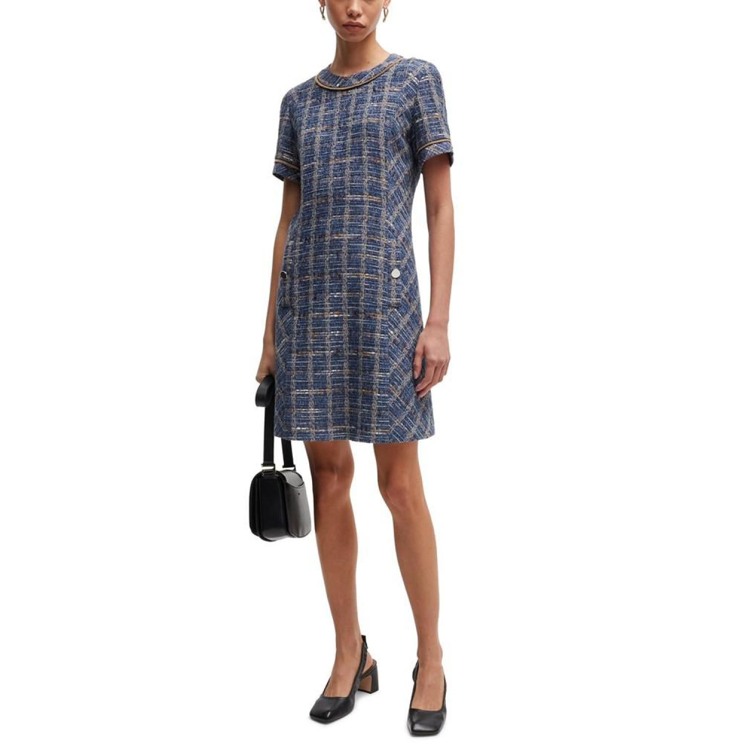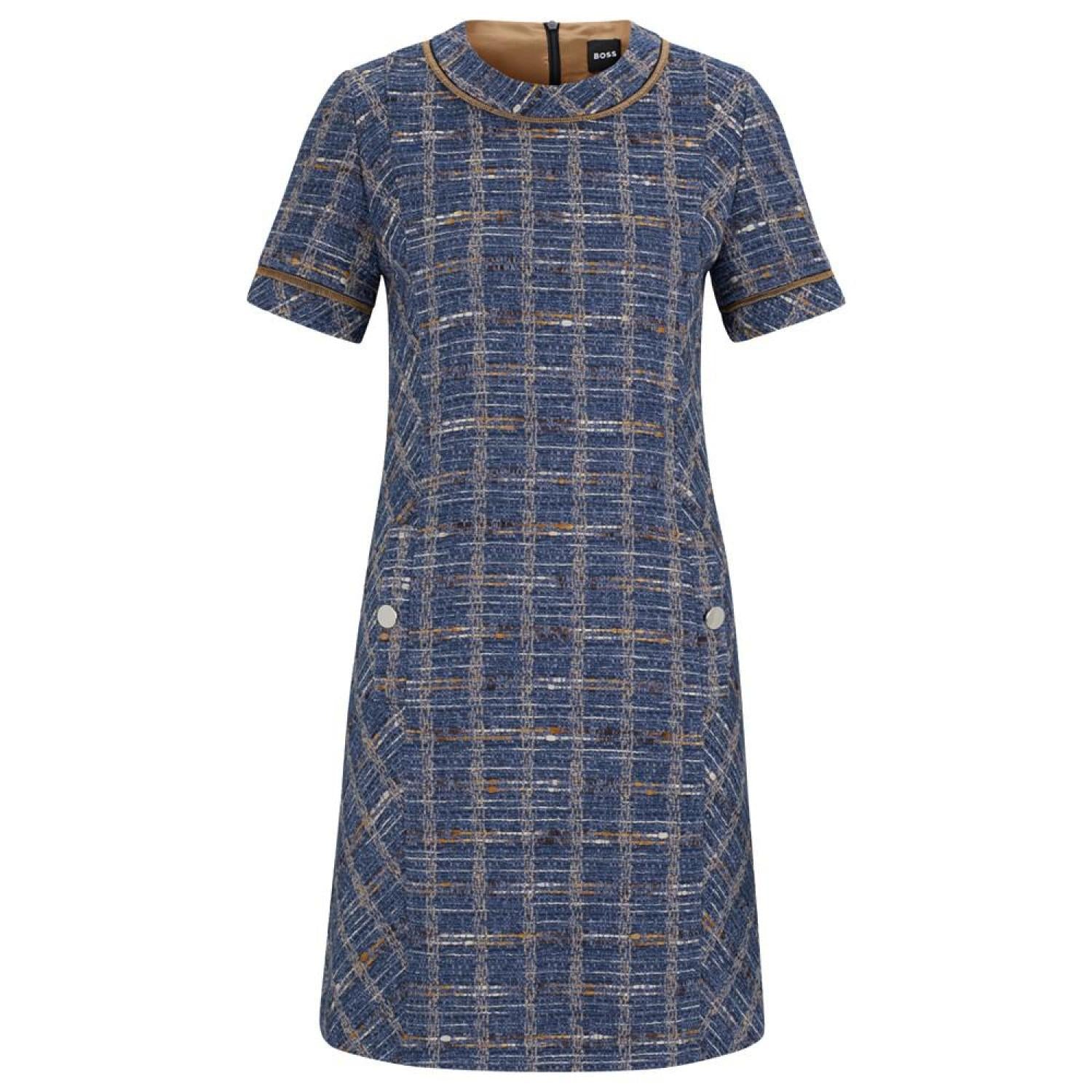 • A fully lined dress with hardware button trims by BOSS. This piece is woven with a multicolored tweed check for classic style.