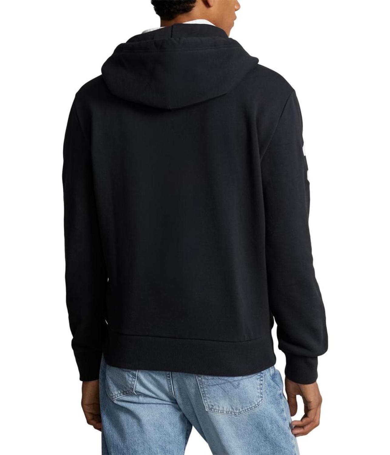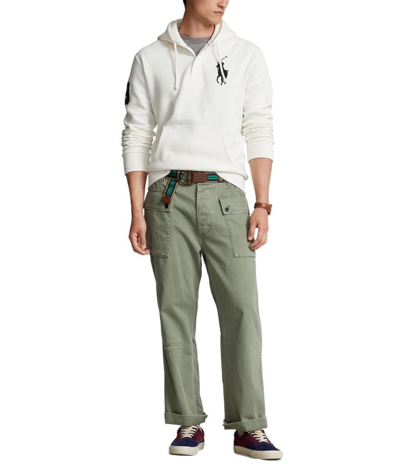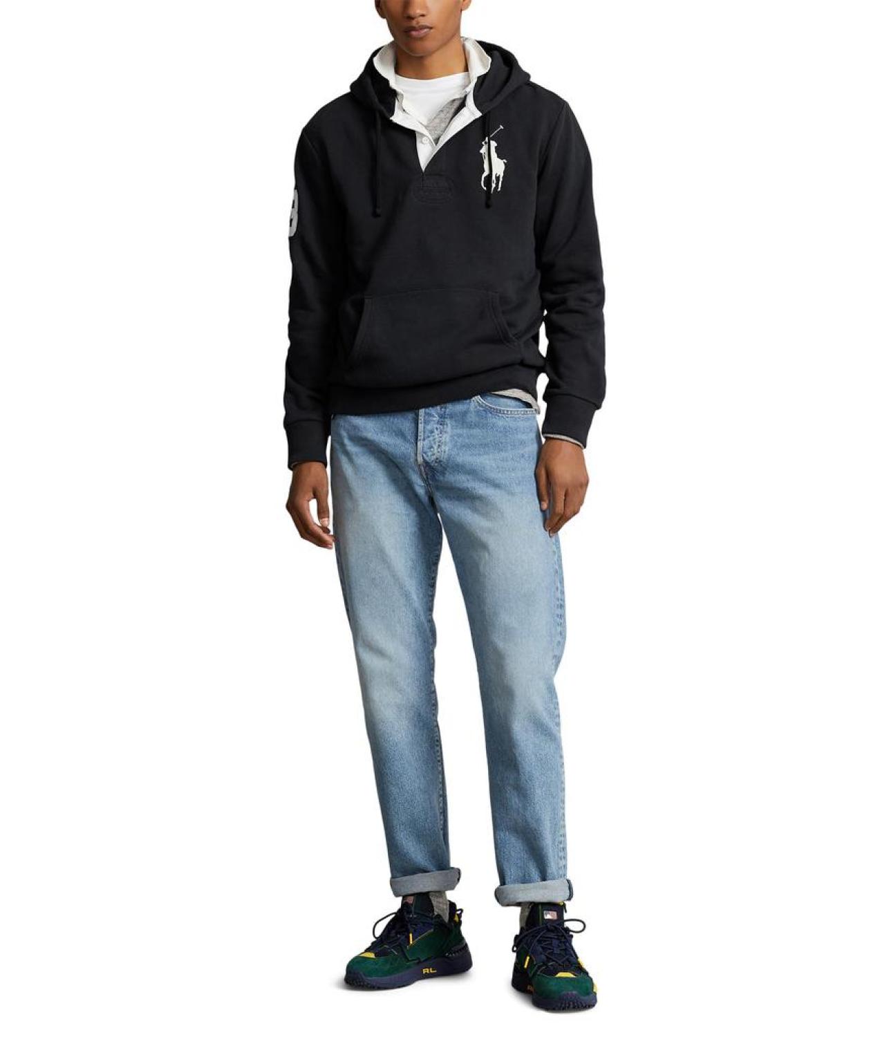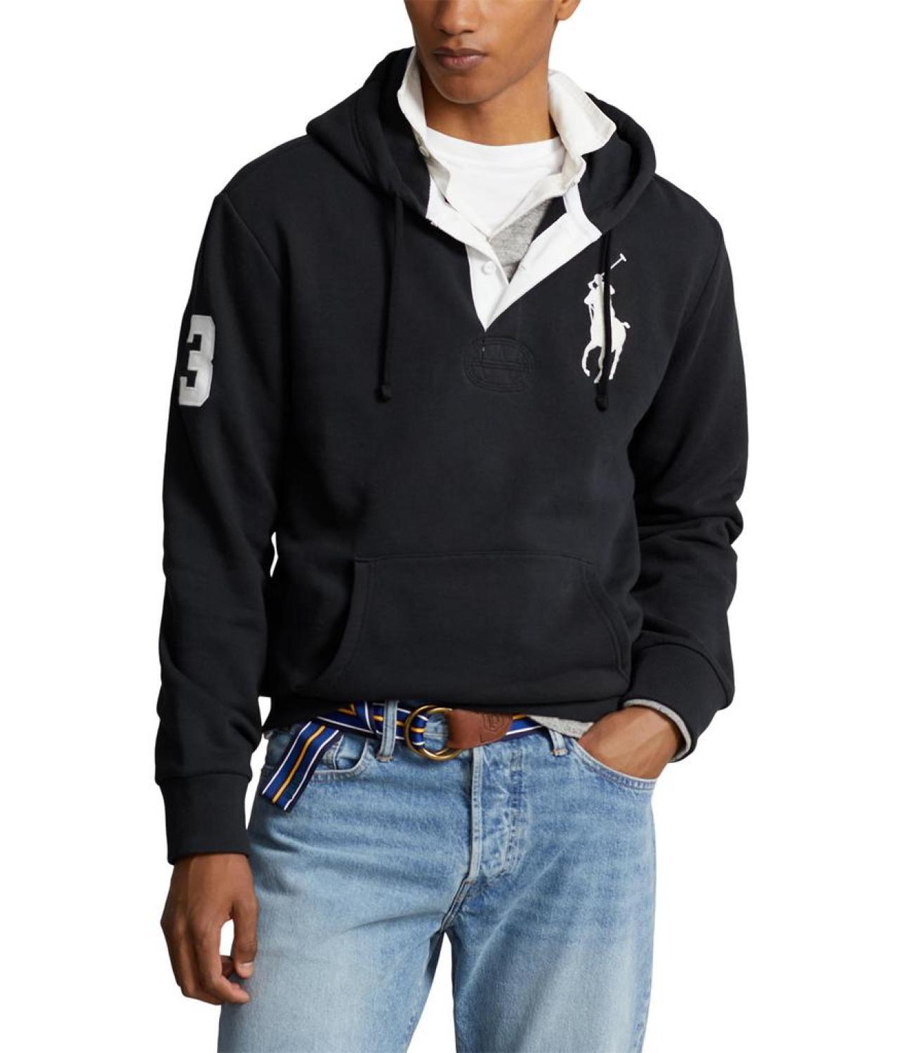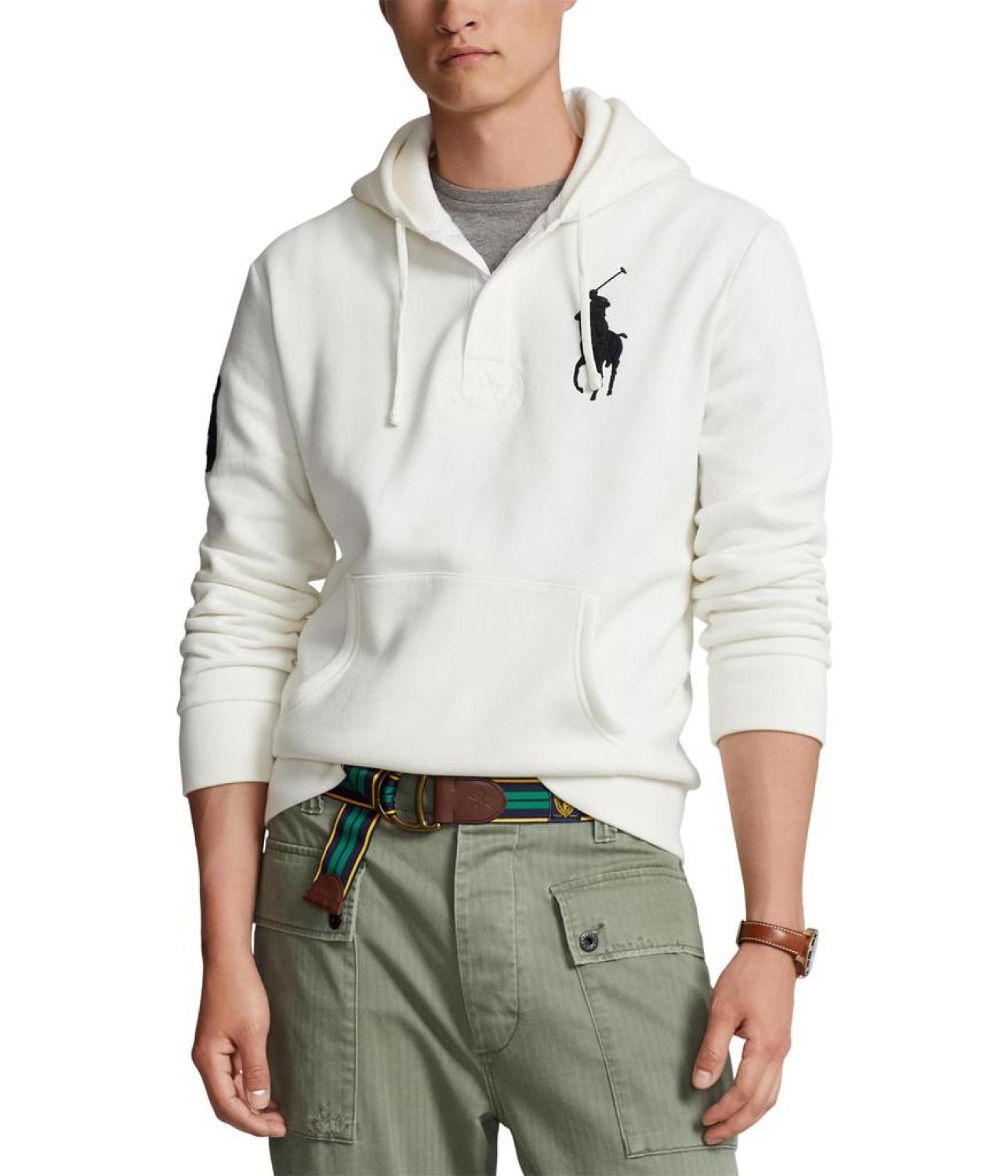 • Elevate your streetwear game with this sleek and sophisticated Polo Ralph Lauren® Big Pony Fleece Hoodie, a fusion of style and comfort. This pullover style hoodie features drawstring polo placket hood and long sleeves. It has brand logo detail on the left chest and kangaroo pocket on the front.